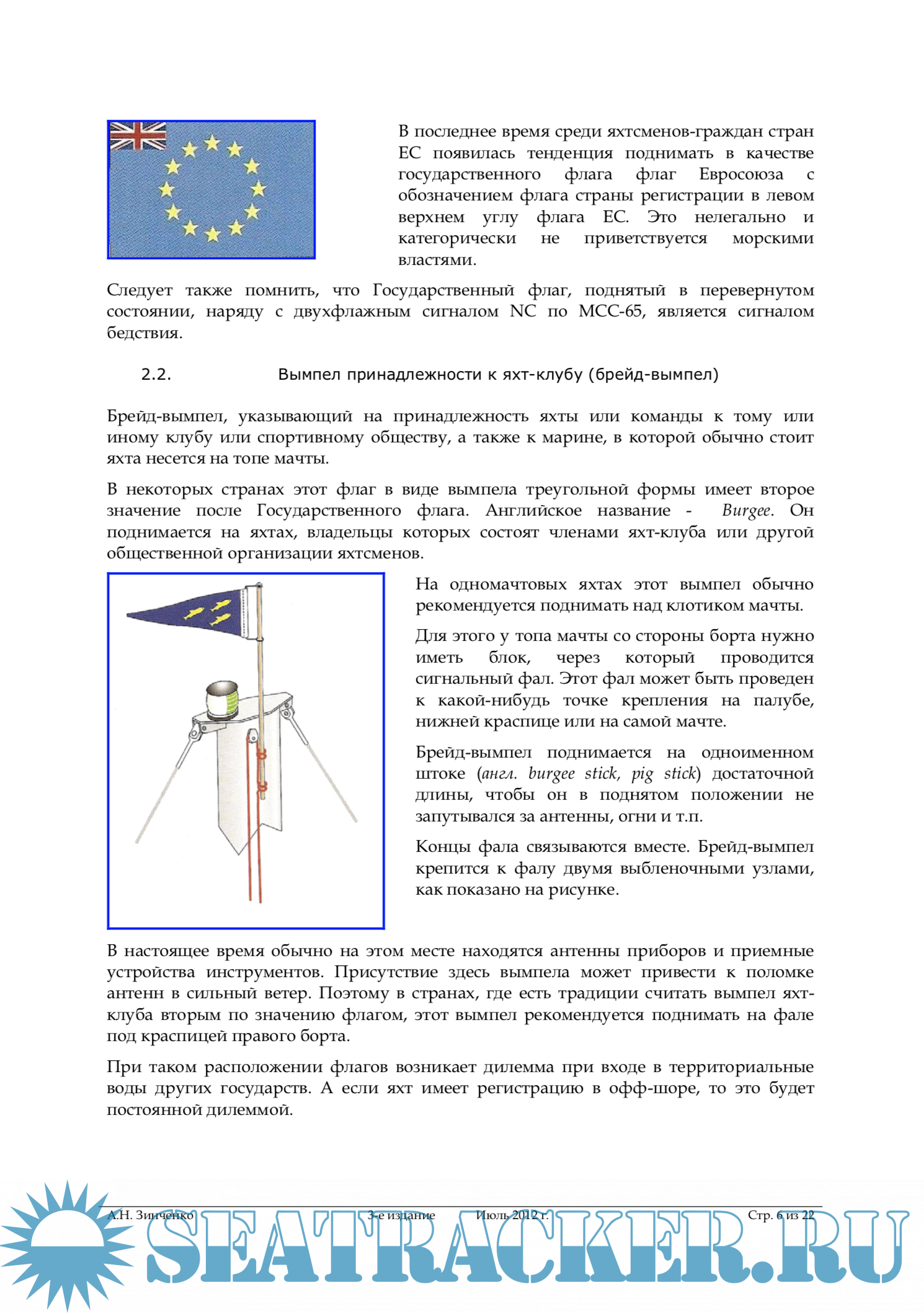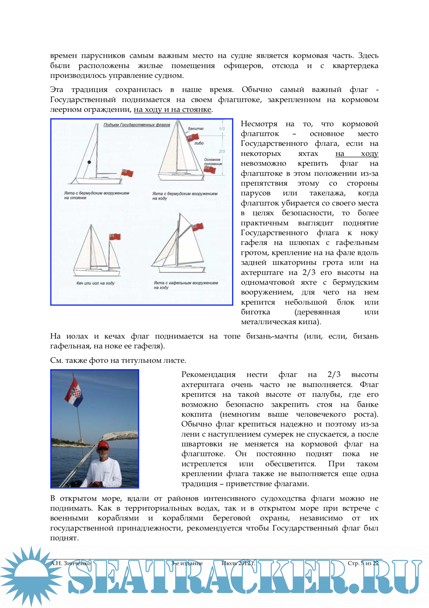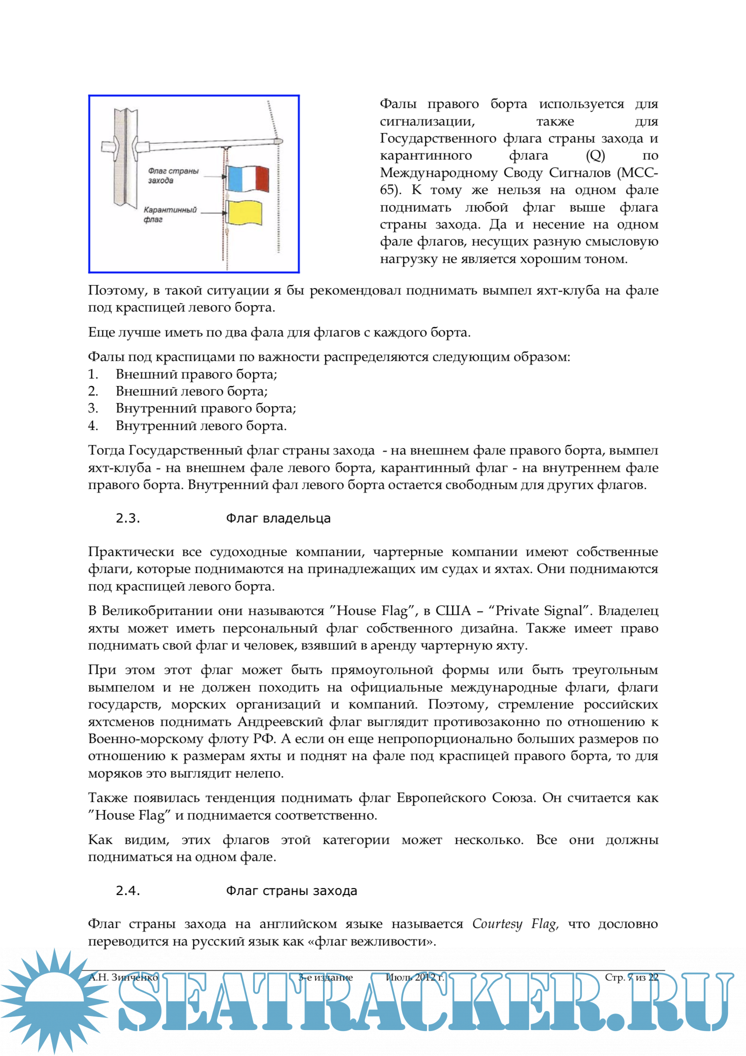 Год выпуска: 2012 Язык: русский Автор: А.Н. Зинченко Жанр: Практическое пособие Издание: 3-е издание Формат: PDF Качество: Изначально компьютерное (eBook) Количество страниц: 22 Описание: Сколько существует мореплавание, столько существуют морские традиции и правила. Традиции можно разделить на внешние, которые касаются поведения судов по отношению к другим судам, служащим портов, местным жителям, и на внутренние традиции, связанные с внутренним рапорядком судна, со взаимоотношениями внутри экипажа. Внешние традиции и правила вырабатываются с опытом и по своей сути характеризуются емким термином «хорошая морская практика». Традиции яхтинга, относительного молодого вида жизни и деятельности на воде, берут свое начало от своих предшественников, в бóльшей части моряков торгового флота, и ответственными яхтсменами поддерживаются, насколько это возможно, с учетом конструктивных особенностей парусных и моторных яхт. К морским традициям относятся и традиция и правила несения флагов, берущие свое начало с XVI века. Практически во всех странах есть правила несения флагов на судах торгового флота и на кораблях ВМФ, которые различаются из-за своей специфики. Одни и те же флаги, например, могут иметь противоположное значение. Они регламентируются такими документами как, например, бывший Устав службы на судах ММФ СССР, Корабельный устав ВМФ, внутренними документами судоходных компаний и т.п. В яхтенном сообществе ситуация несколько иная. Лишь в нескольких странах есть рекомендации для яхт, плавающих под флагами этих стран. Обычно они разрабатываются руководящими органами, яхтенными школами, общественными организациями, объединяющими людей, занимающимися яхтингом, либо яхт- клубами и носят характер рекомендаций.