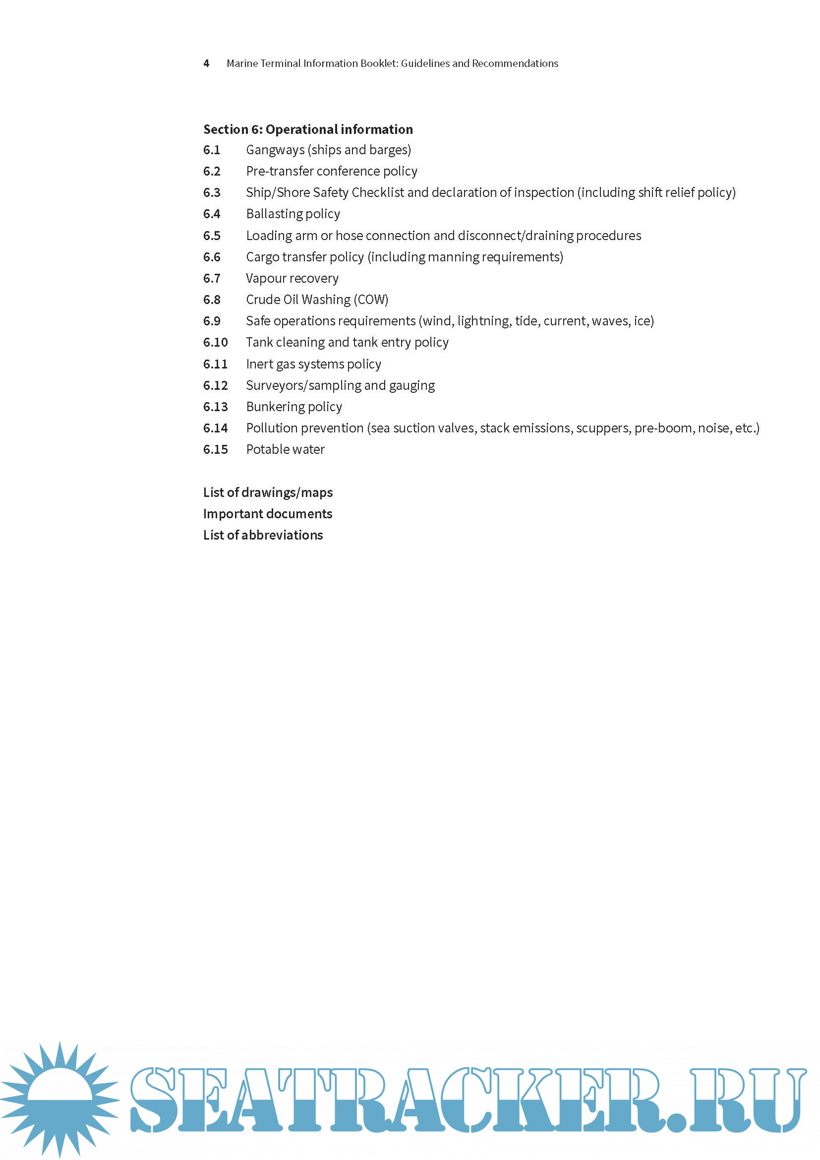Year: 2018 Language: english Author: OCIMF Genre: Guide Format: PDF Quality: eBook Pages count: 9 Description: A vessel’s arrival into port is a high-risk activity, particularly on its first call. This risk can be reduced by pre-planning and ensuring that the vessel’s personnel are fully aware of port and terminal requirements. Providing accurate and up-to-date terminal, berth and port information is important to ensure safe interactions between vessels and terminals. This information should be provided in a standard format so that personnel can easily find it and become familiar with it. The exchange of information is necessarily two-way, so port authorities and terminal operators will also ask Masters for information about the vessel and crew.