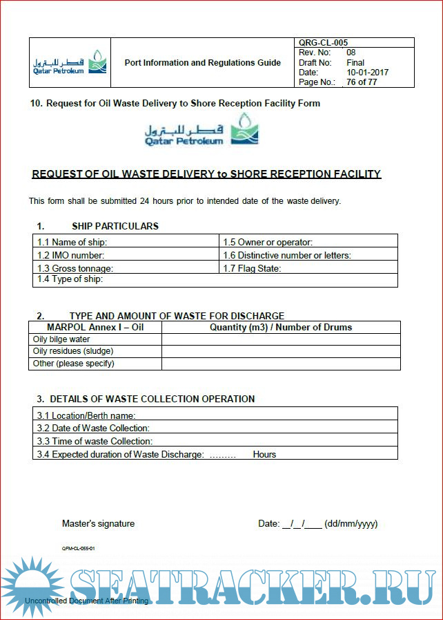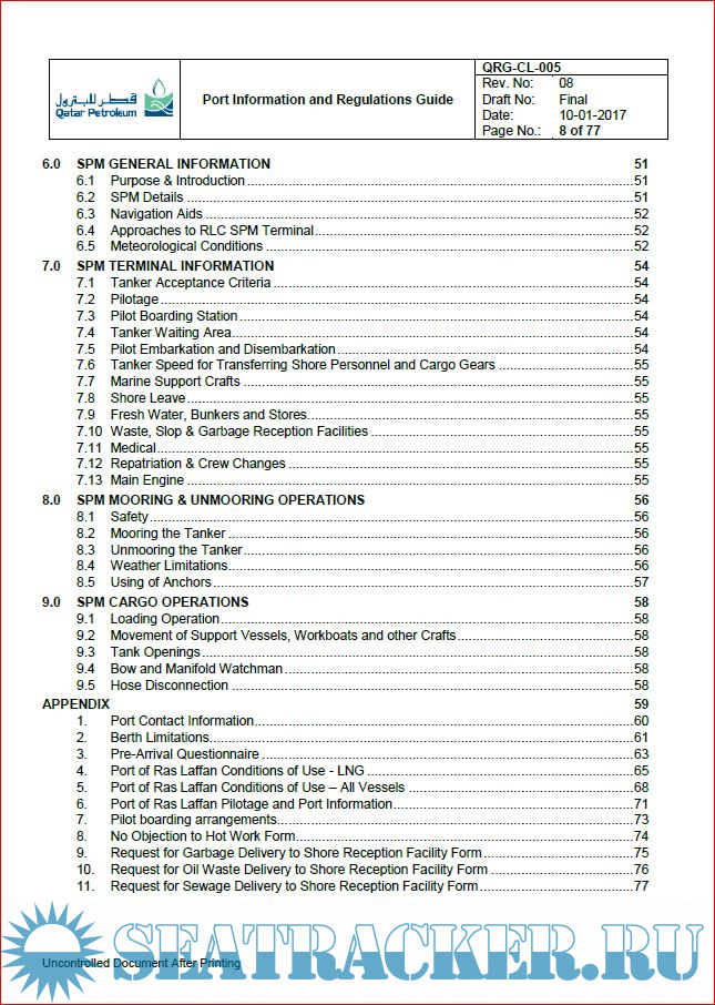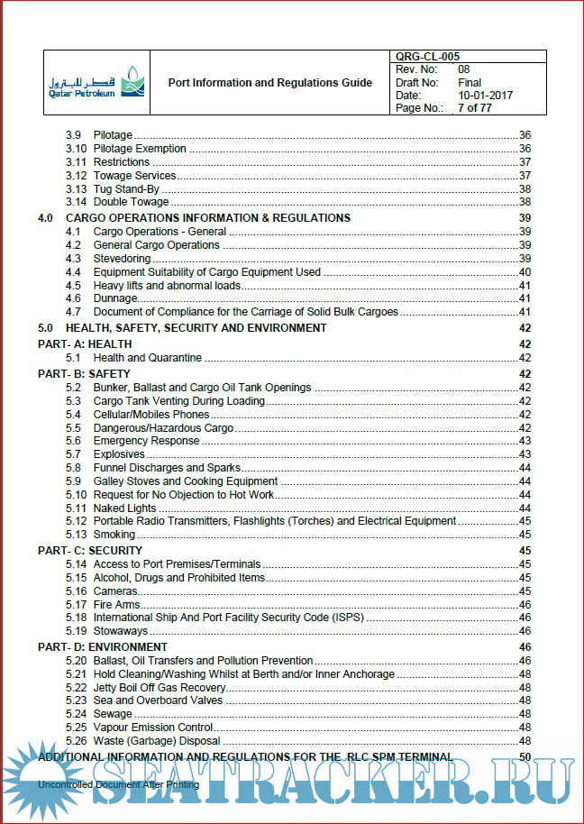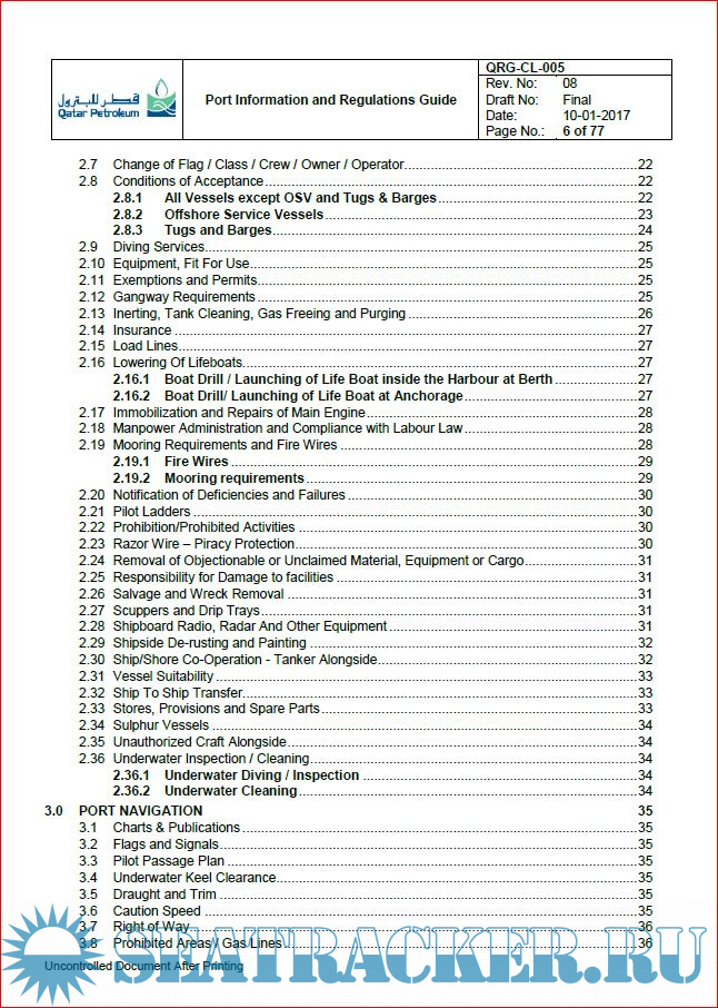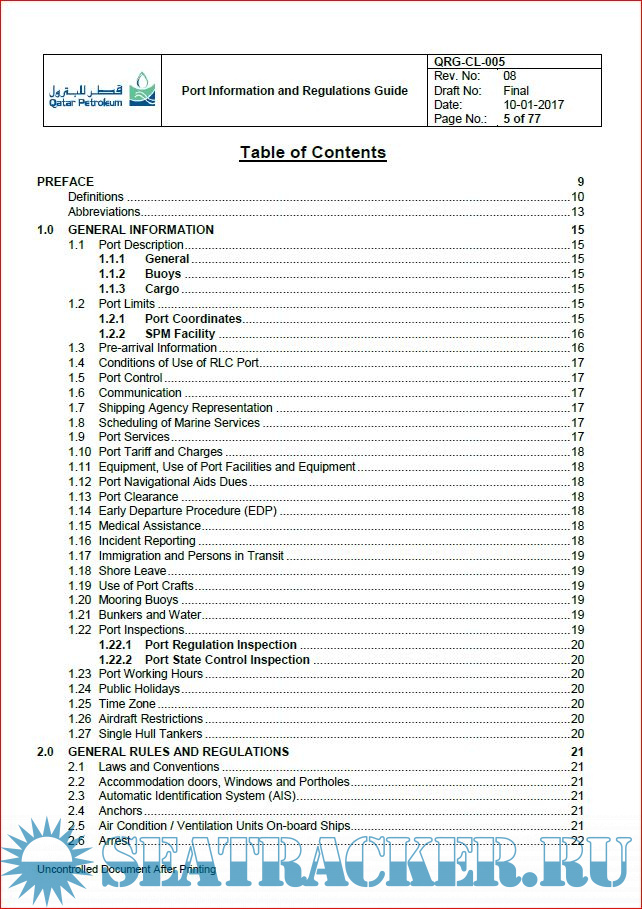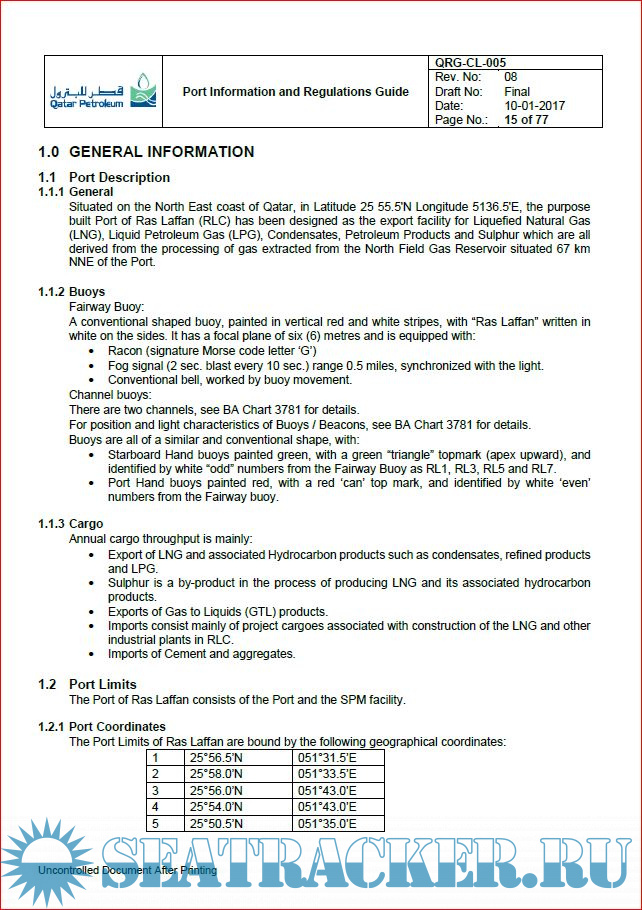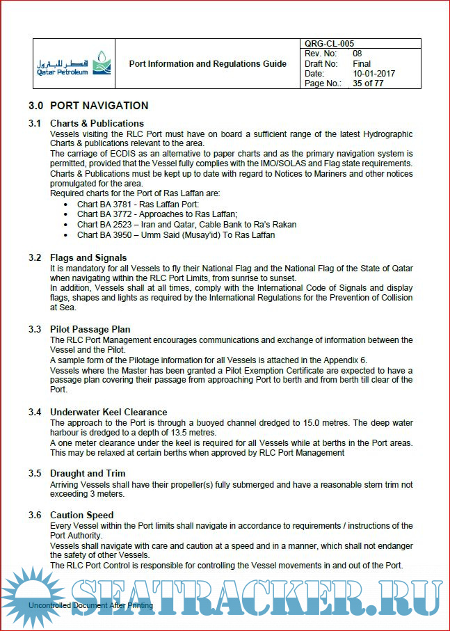 Description: This Port Information and Regulations Guide is intended as a reference for the purpose of acquainting Owners, Charterers, Masters of Vessels and other interested parties with general information pertaining to facilities, requirements, regulations and services available at Ras Laffan Port.