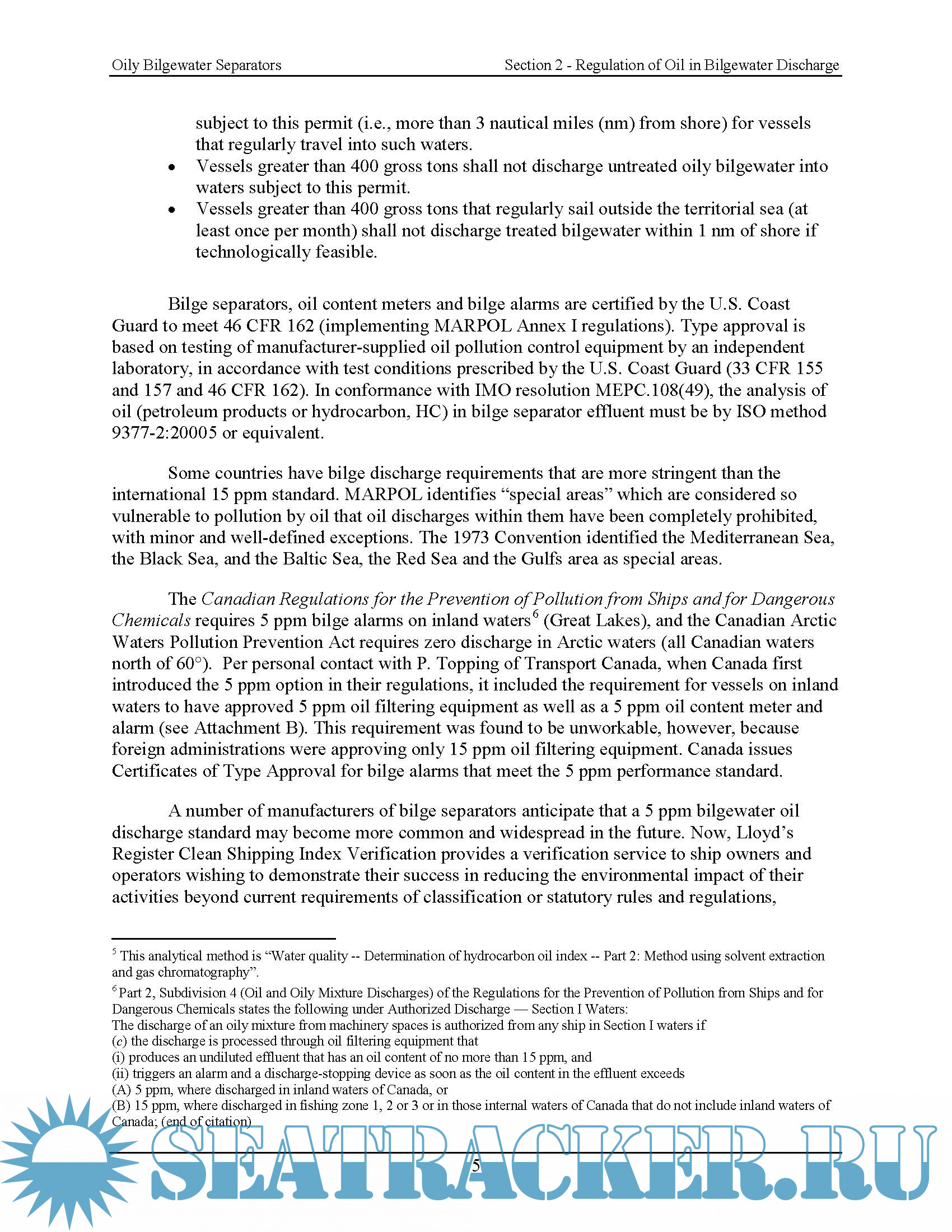 Year: 2011 Language: english Author: EPA Genre: Documentation Format: PDF Quality: eBook Pages count: 98 Description: EPA’s 2008 Vessel General Permit for Discharges Incidental to the Normal Operation of Vessels (VGP) also addresses discharges of oil, including oily mixtures, from ships subject to MARPOL. Such discharges must have concentrations of oil less than 15 ppm. The VGP also includes technology-based effluent limits and related requirements for specific discharge categories, including bilgewater discharges. Bilge separators, oil content meters and bilge alarms are certified by the U.S. Coast Guard to meet 46 CFR 162, which implements MARPOL Annex I regulations in the U.S. More than one hundred bilge separators have been certified by the U.S. Coast Guard to meet the MARPOL 15 ppm oil discharge standard. All of these bilge separators are treatment systems that combine a gravity oil-water separator (OWS) or centrifuge with one or more additional unit operations that “polish” the bilgewater effluent to reduce concentrations of emulsified oil. Unit operations that are added to OWS/centrifuge-based bilge separator systems include: • Absorption and Adsorption, • Biological Treatment, • Coagulation and Flocculation, • Flotation, and • Ultrafiltration . EPA evaluated the effectiveness of bilge separators by their ability to achieve low effluent oil concentrations.