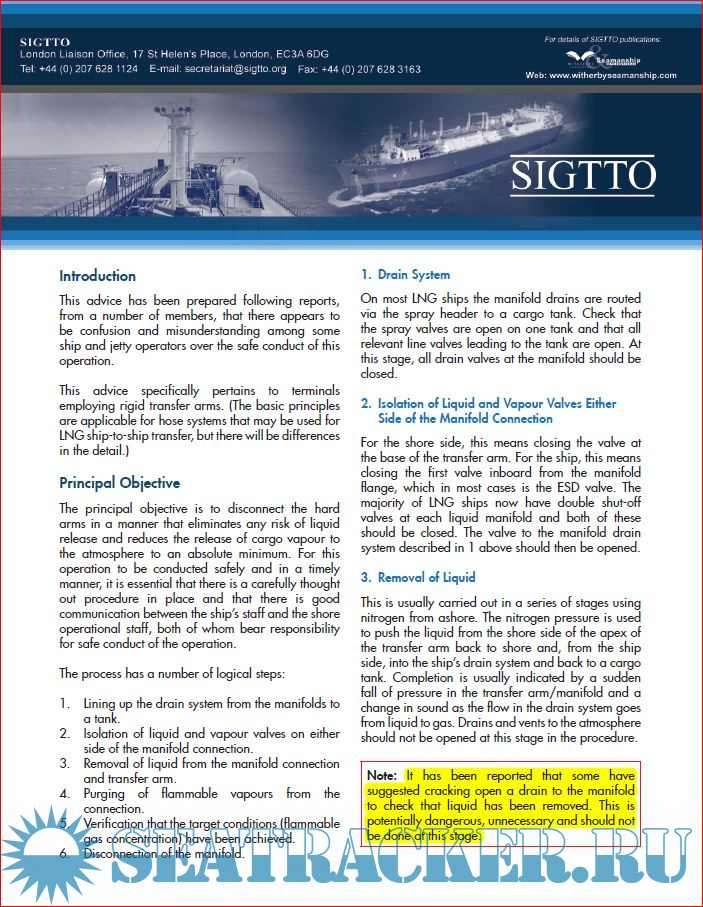 Description: SIGTTO has published an advice on LNG transfer arms and manifold draining, purging and disconnection procedure which has been prepared following reports from a number of their members that there appears to be confusion and misunderstanding among some ship and jetty operators over the safe conduct of disconnection procedures following loading and discharge.