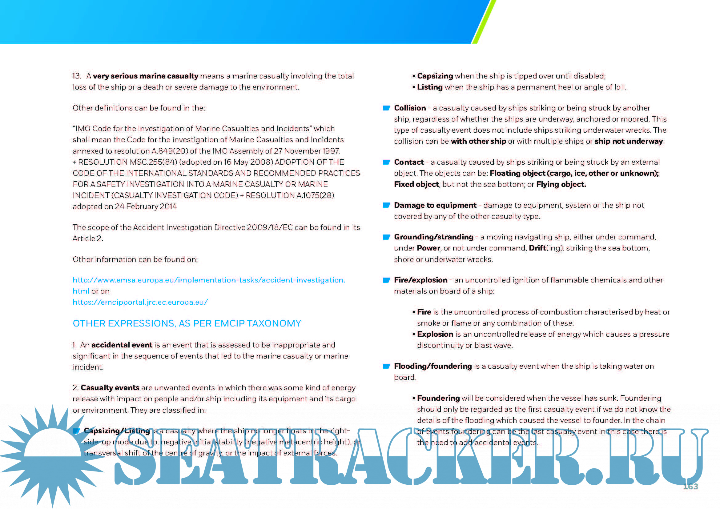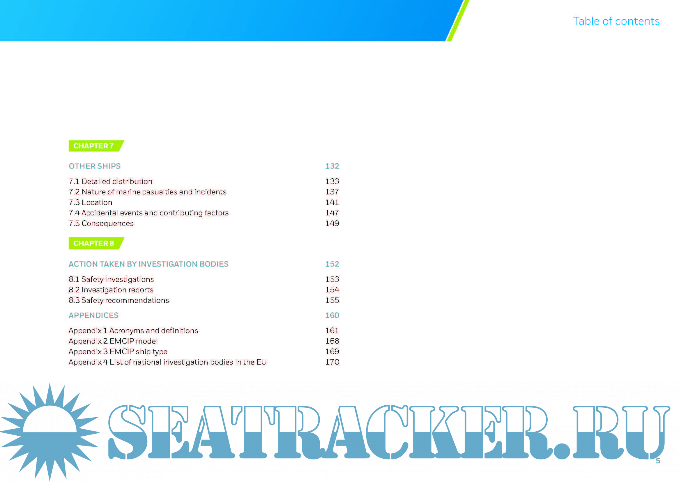 Year: 2018 Language: english Author: EMSA Genre: Presentation Format: PDF Quality: eBook Pages count: 175 Description: With 3301 occurrences reported in 2017, the total number of occurrences recorded in EMCIP has grown to over 20000. This amounts to an average of 3315 casualties per year over the past four years. The number of very serious casualties has continuously decreased since 2014 with 74 reported in 2017. A similar improvement was noted for the number of ships lost, with 12 reports as compared with 41 in 2014. During the 2011-2017 period, 405 accidents led to a total of 683 lives lost, which represents a significant decrease since 2015. Crew have been the most affected category of victims with 555 fatalities. In 2017 there were 1018 injured persons reported. This number has remained relatively steady since 2014, at around 1000 per year. Again, crew represent the main category of persons injured at sea (5329 during the 2011-2017 period). While the number of occurrences involving cargo ships and service ships stabilised and the number of passenger ships and ‘other ships’ slightly decreased in 2017, a continued increase has been noted in relation to fishing vessels since 2014. More than 1500 cargo ships were involved in accidents that resulted in 25 fatalities in 2017, the lowest number since the EU legislation is in place. With a total of almost 120, fishing vessels remains the category of ship with the highest number of ships lost over the 2011-2017 period. However, the number of fishing vessels lost dropped from 21 to six in two years’ time. Moreover, there was a decrease from 60 to 13 lives lost in 2017. Almost half of the casualties that occurred on board a passenger vessel involved ferries. While no ships were lost in 2017, the number of fatalities has also continued to decrease with less than five fatalities. No service ships were lost in 2017. While the number of fatalities remained identical, fewer injuries were reported. 200 ‘other types’ of ships have been involved in a marine accident. Despite the limited number of such ships, this resulted in an increase in fatalities and injuries, mainly on leisure boats with engines or sails. Half of the casualties were related to issues of a navigational nature, such as contacts, grounding/stranding and collision. As concerns occupational accidents, 40% were attributed to the slipping, stumbling and falling of persons. While the departure phase appeared to be the safest phase of a voyage for most ships, it was noted that casualties mainly occurred in internal waters and port areas. Human error represented 58% of accidental events and 70% of accidental events had shipboard operations as a contributing factor. EU Member State investigation bodies have launched 1070 investigations over the 2011-2017 period and almost 900 reports have been published. Among the 2000 safety recommendations issued, 40% were related to operational practices, and in particular to safe working practices. Half of the safety recommendations were addressed to the shipping companies and the positive response rate was around 50%.