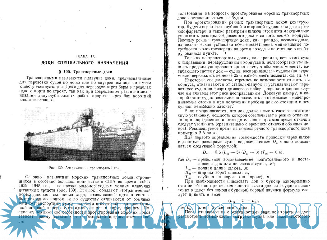 Год выпуска: 1964 Язык: русский Автор: М. Ловягин Жанр: Справочное издание Издательство: Судостроение Формат: PDF Качество: Отсканированные страницы Количество страниц: 336 Описание: В книге обобщены опыт проектирования, постройки и эксплуатации металлических доков, а также сведения о теоретических исследованиях в области теории корабля и прочности доков за последние 15 лет. Даны анализ весовых характеристик доков, коэффициенты для определения в первом приближении главных элементов проектируемого дока, а также выведенные авторами формулы для определения выгоднейшей с точки зрения прочности высоты борта, момента всплытия дока при продольном спуске и пр. Специальная глава посвящена методу составления заданий на проектирование доков. Книга предназначена для инженеров и техников, работающих в области проектирования, постройки и эксплуатации плавучих доков, а также может быть полезна студентам кораблестроительных вузов, факультетов и учащимся техникумов.