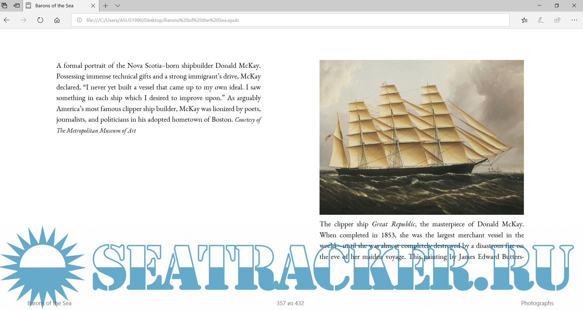 Year: 2018 Language: english Author: Steven Ujifusa Genre: History Publisher: Simon & Schuster ISBN: 978-1-4767-4597-8 Format: EPUB Quality: eBook Pages count: 432 Description: Steven Ujifusa tells the story of a handful of cutthroat competitors who raced to build the fastest, finest, most profitable clipper ships to carry their precious cargo to American shores. They were visionary, eccentric shipbuilders, debonair captains, and socially ambitious merchants with names like Forbes and Delano—men whose business interests took them from the cloistered confines of China’s expatriate communities to the sin city decadence of Gold Rush-era San Francisco, and from the teeming hubbub of East Boston’s shipyards and to the lavish sitting rooms of New York’s Hudson Valley estates. Additional info: This book format can be opened with Microsoft Edge, or with any other app., which is able to work with EPUB.