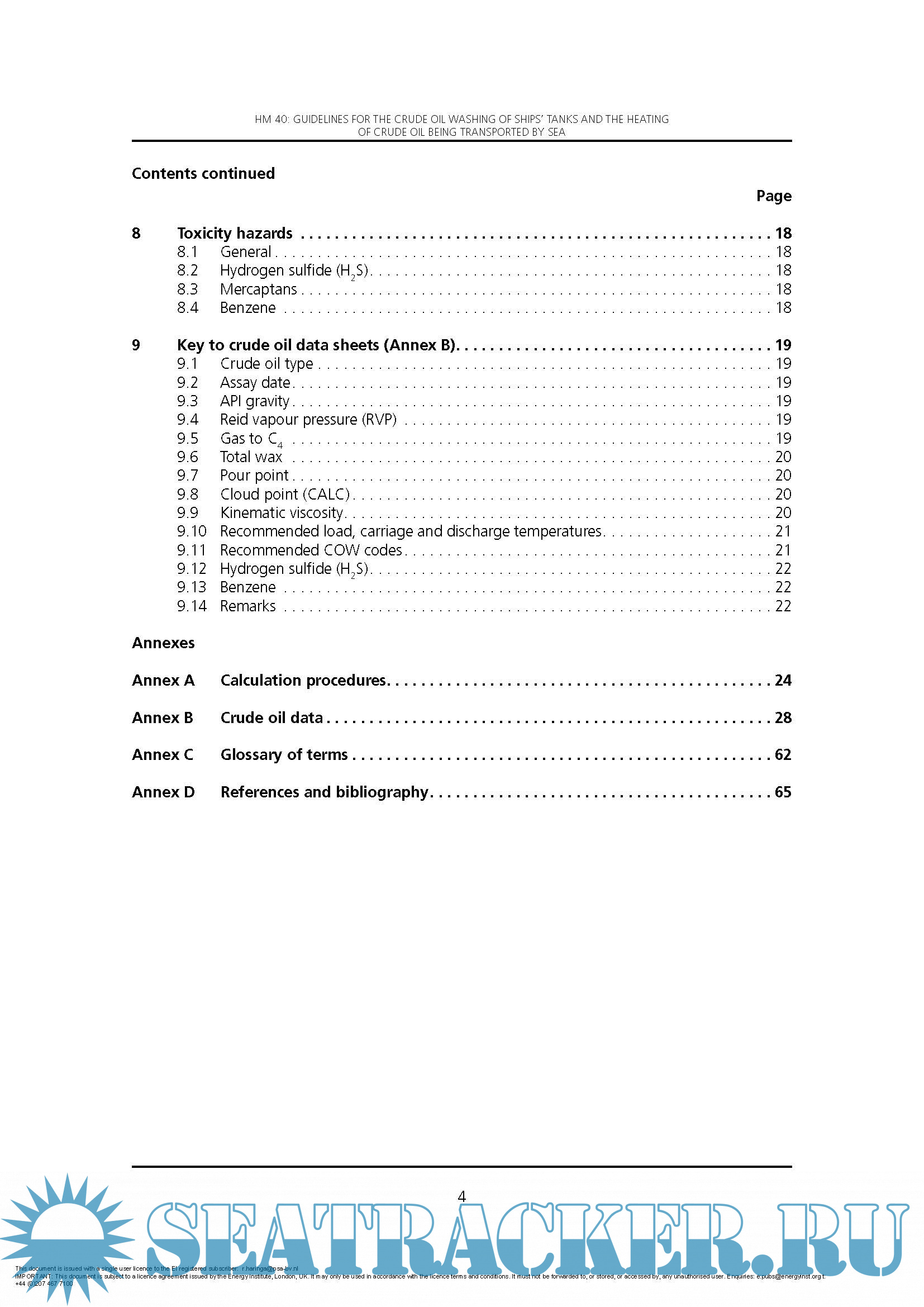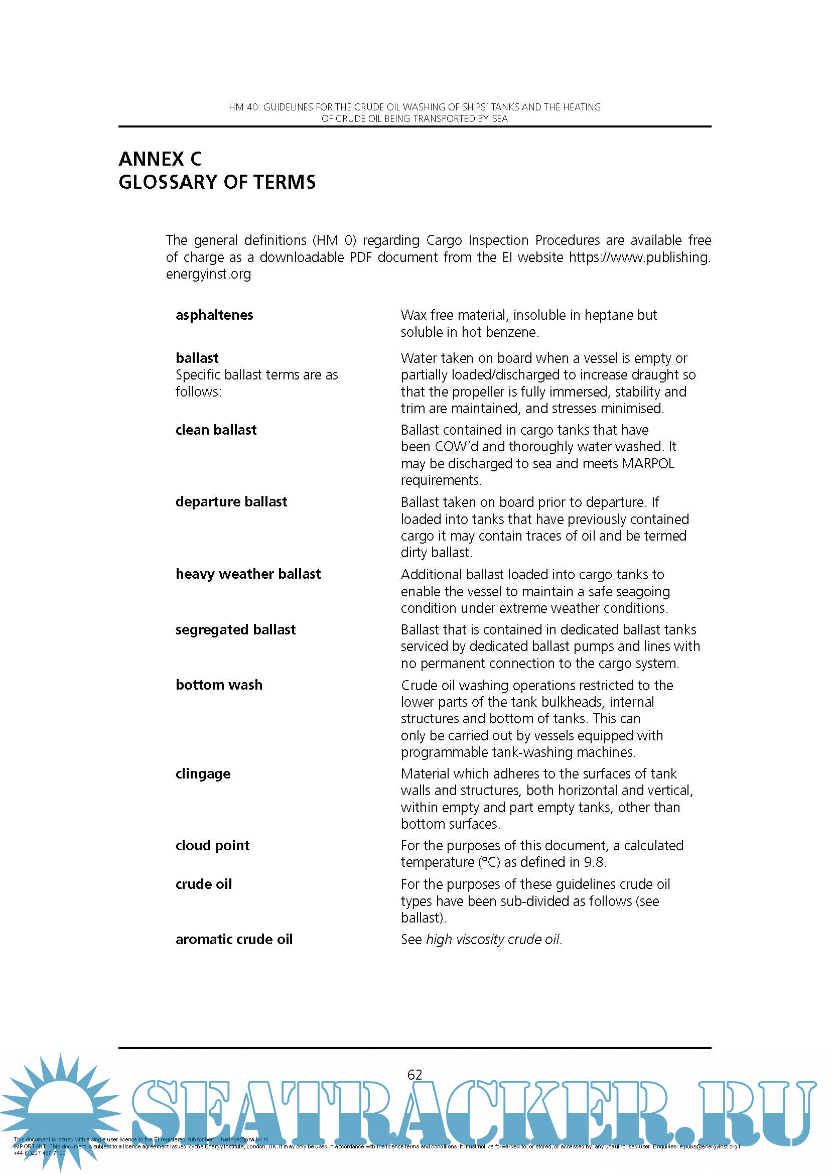 Year: 2016 Language: english Author: ENERGY INSTITUTE Genre: Handbook ISBN: 978 0 85293 932 1 Format: PDF Quality: eBook Pages count: 68 Description: MARPOL regulations regarding COW were introduced into the shipping industry in the late 1970s. The purpose of these regulations was to reduce the chances of marine pollution by reducing the need for water washing ships’ tanks after discharge of cargo. Notwithstanding anything written hereunder, the current MARPOL regulations should be adhered to. One of the older IMO resolutions regarding the specifications for design, operation and control of crude oil washing systems 'recognizes that further improvement may be required in the specifications, taking into account the development of technology in this field and in the light of experience gained'. This publication has been compiled with the aim of sharing the experiences of the oil companies represented on committee HMC-4 with other branches of the oil industry, and to provide guidance with regard to the carriage, heating and COW of different crude oils. Some of the companies on the committee also operate tanker fleets thus enabling the data to be reviewed by the marine industry at large. A table of crude oil properties can be found in Annex B. The data should not be used without consulting the other sections of this publication.