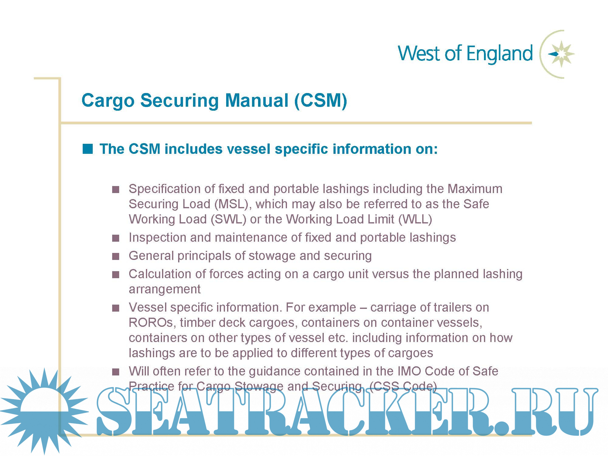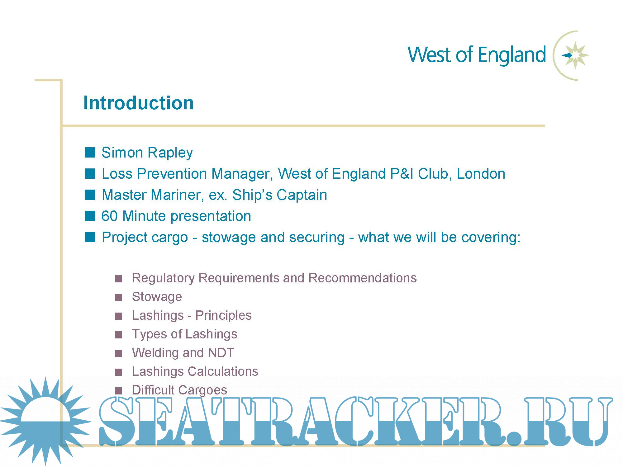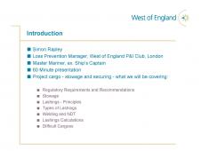Year: 2018 Language: english Author: West of England P&I Genre: Presentation Format: PDF Quality: eBook Pages count: 69 Description: This presentation covers the Project cargo -stowage and securing from the aspects of Regulatory Requirements and Recommendations, Stowage, Lashings -Principles, Types of Lashings, Welding and NDT, Lashings Calculations, Difficult Cargoes.