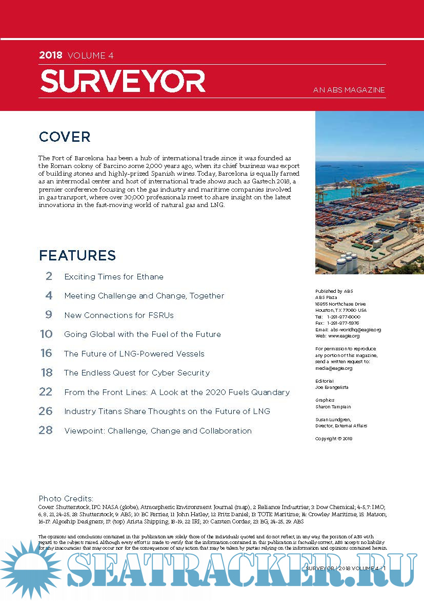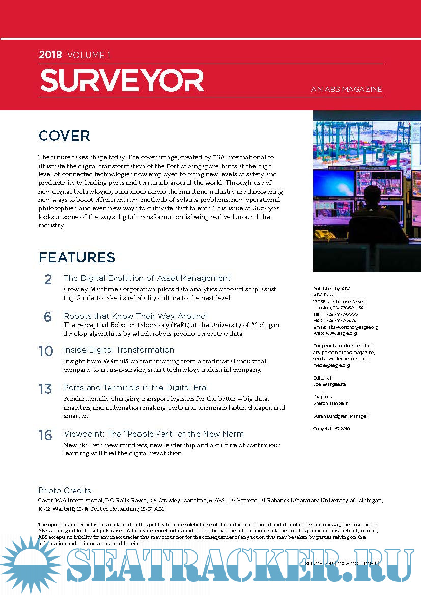 Year: 2018 Language: english Author: ABS Genre: Periodical (magazine) Format: PDF Quality: eBook Pages count: 108 Description: Digital Future Now: The future takes shape today. The cover image, created by PSA international to illustrate the digital transformation of the Port of Singapore, hints at the high level of connected technologies now employed to bring new levels of safety and productivity to leading ports and terminals around the world. Through use of new digital technologies, businesses across the maritime industry are discovering new ways to boost efficiency, new methods of solving problems, new operational philosophies, and even new ways to cultivate staff talents. This issue of Surveyor looks at some of the ways digital transformation is being realized around the industry. Posidonia Special Issue: Greece is a maritime nation by tradition, with a rich history in the shipping industry. Shipping continues as the most significant industry in the Greek economy. The Hellenic Merchant Marine boasts the world’s largest merchant fleet in terms of tonnage which includes over 5,000 vessels engaged in commerce and transportation of goods and services across the globe. The Greek shipping industry works closely with marine industry stakeholders, universities, equipment manufacturers, ship designers and classification organizations to advance technology that improves efficiency and performance, while reducing environmental impact. SMM Special Issue: The Port of Hamburg, a pioneer in fully automated logistics, echoes the emphasis on technology for which the SMM exhibition is famous. As a whole, the German Shipping Community works closely with marine industry stakeholders, standards bodies, and classification organizations to advance technology that improves efficiency and performance while reducing environmental impact, in initiatives ranging from developing greenhouse gas-neutral forms of propulsion to introduction of alternative fuels. Gastech Special Issue: The Port of Barcelona has been a hub of international trade since it was founded as the Roman colony of Barcino some 2,000 years ago, when its chief business was export of building stones and highly-prized Spanish wines. Today, Barcelona is equally famed as an intermodal center and host of international trade shows such as Gastech 2018, a premier conference focusing on the gas industry and maritime companies involved in gas transport, where over 30,000 professionals meet to share insight on the latest innovations in the fast-moving world of natural gas and LNG.