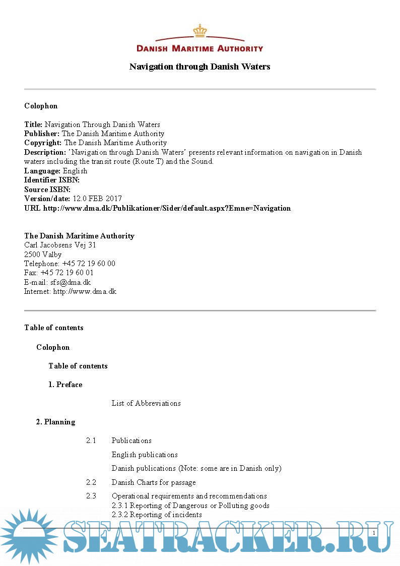 Description: In spite of the good buoyage, navigation through Danish waters presents, however, in certain areas difficulties to large ships due to narrow waters, sharp bends, strong currents and shallow depths. In all parts of Danish waters intensive fishing is carried out by large and small fishing vessels, and a large number of pleasure craft are sailing in these waters during the summer season. This publication is undergoing changes and updates. Therefore not all text, figures and charts can be expected up to date.