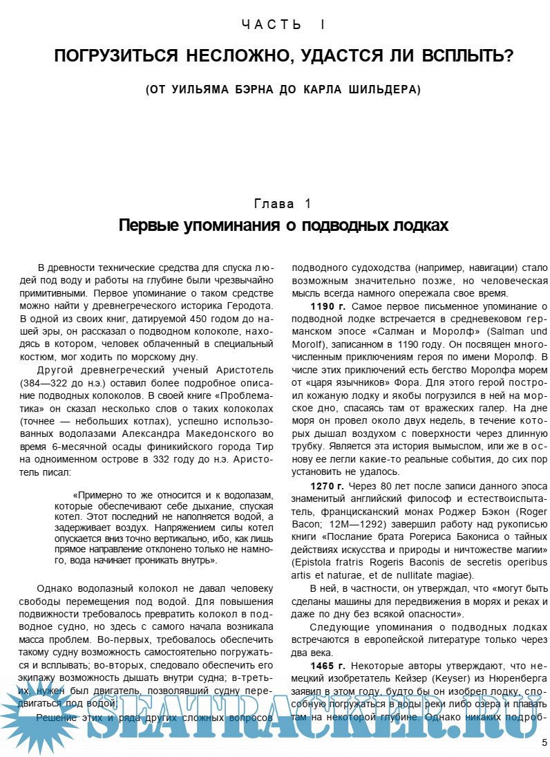 Предисловие Часть I. Погрузиться несложно, удастся ли всплыть? (От Уильяма Бэрна до Карла Шильдера) Глава 1. Первые упоминания о подводных лодках 1578 г. Бэрн Глава 2. Подводная галера Ван Дреббеля Глава 3. Подводные аппараты XVII–XVIII веков Мерсенн (1644 г.) Уилкинс(1648 г.) «Гроза морей» Де Сона (1654 г.) Борелли (1680 г.) Аппараты Папена (1692 г.) «Морель» Никонова (1724 г.) Саймоне (1729 г.) «Мария» Дэя (1774 г.) Глава 4. «Черепаха» Бушнелла Глава 5. Подводные лодки Фултона «Nautilus-1» (1800 г.) «Nautilus-2» (1801 г.) Проект «Nautilus-3» (1804 г.) «Turtle-boat» (1812 г.) «Mute» (1814 г.) Глава 6. Подводные лодки после Фултона «Подводный Наутилус» (1809 г.) Субмарина Хэлси (1813 г.) Джонсон (1815-20 гг.) Проект «L'lnvisible» Монжери (1823 г.) Проекты Кастера (1827 г.) Лодка Пти (1834 г.) Проект д'Обюссона (около 1835 г.) Глава 7. Подводная лодка Шильдера Часть II. В поисках двигателя (От Проспера Пайерна до Саймона Лейка) Глава 1. Подводные лодки с мускульным двигателем «Hydrostate» Пайерна (1846 г.) «Ныряющие брандеры» Бауэра (1850-64 гг.) «Ныряющий брандер» (1850 г.) Второй проект Англо-германский «Hyponeon» (1854-55 гг.) «Морской черт» (1855 г.) Проект «Прибрежного поджигателя» (1861 г.) Субмарины Филипса (1851-62 гг.) Субмарина Бэббэджа (1854 г.) Подводные лодки Герна (1854-64 гг.) Субмарины Дешана (1855-56 гг.) Подводная лодка Конселя (1859 г.) «Ictineo» Монтуриоля (1859 г.) Подводные лодки Вильруа (1859-62 гг.) «Аллигатор» (1862 г.) Подводные лодки Мак-Клинтока (1862-63 гг.) «H. L. Hunley»(1863 r.) «Intelligent Whale» Мериэма (1863 г.) Субмарина Ребера (1866 г.) Проект подводной байдарки Холланда (1875 г.) «Resurgam» Гэррета (1878 г.) Подводные лодки Джевецкого (1878-80 гг.) «EI Toro» Блюма (1879 г.) «Подводная минная шлюпка» Коромальди (1904 г.) Глава 2. Подводные лодки с паровым двигателем «Pyrohydrostate» Пайерна (1854 г.) Подводная мортира Нэсмита (1856 г.) «lctineo-2» Монтуриоля (1864 г.) Подводные лодки Гэррета и Норденфельта (1879-87 гг.) «Peacemaker» Така (1886 г.) Германские лодки типа Норденфельт (1890-91 гг.) Давид, побеждающий Голиафа (1863 г.) «Дьявол с иглой» (1864 г.) Полуподводное судно Фогеля (1870 г.) «Alarm» Портера (1874 г.) Британский «Полифем» (1881 г.) Проект миноноски Гочкиса (1880 г.) «Katahdin» Эммена (1893 г.) Глава 3. Подводные лодки с пневматическим двигателем «Plongeur» Брюна и Буржуа (1863 г.) Подводная лодка Александровского (1865 г.) Проект «Антроторпедо» Кастелло (1898 г.) Глава 4. Подводные лодки с двигателем внутреннего сгорания Субмарина Барбура с газовым мотором (1866 г.) Субмарины Холланда с моторами Брайтона (1879-85 гг.) «Кета» Яновича (1904 г.) «Челим» Боткина (1904 г.) «Порт-Артурец» Налетова (1904 г.) Подводная лодка «Y» (1905 г.) «Почтовый» Джевецкого (1906 г.) Глава 5. Подводные лодки с электрическим двигателем Проект Мари-Дэви (1854 г.) Электроход Така (1884 г.) Электроход Джевецкого (1885 г.) Подводные лодки Губэ (1885-89 гг.) «Porpoise» Уоддингтона (1886 г.) «Nautilus» Кэмпбелла и Аша (1886 г.) Субмарина «Isaac Peral» (1888 г.) «Gymnote» Зедэ (1888 г.) Электроходы Фонтеса (1890–1901 гг.) Германская субмарина «U-3» (1891 г.) «Audace» Абатти (1892 г.) «Pullino» и «Delfino» (1892-94 гг.) Субмарина «Gustave Zede» (1893 г.) «Morse» Ромацотти (1899 г.) «Транспортное средство № 333» Лепса (1898 г.) Французские электроходы 1901-04 гг. «Петр Кошка» Колбасьева (1901 г.) «Forelle» д'Эквиля (1903 г.) Глава 6. Подводные лодки с комбинированной силовой установкой «American Ram» Алстита (1862 г.) Проект Ховгаарда (1884 г.) Проекты Джевецкого (1887-97 гг.) Пароэлектроход Бейкера (1892 г.) Конкурсные проекты 1896 г. и субмарины Лобёфа Проект Фореста «Narval» Лобёфа (1898 г.) Субмарины типа «Sirene» (1901 г.) Подводные лодки Холланда (1878–1901 гг.) Подводные лодки типа 