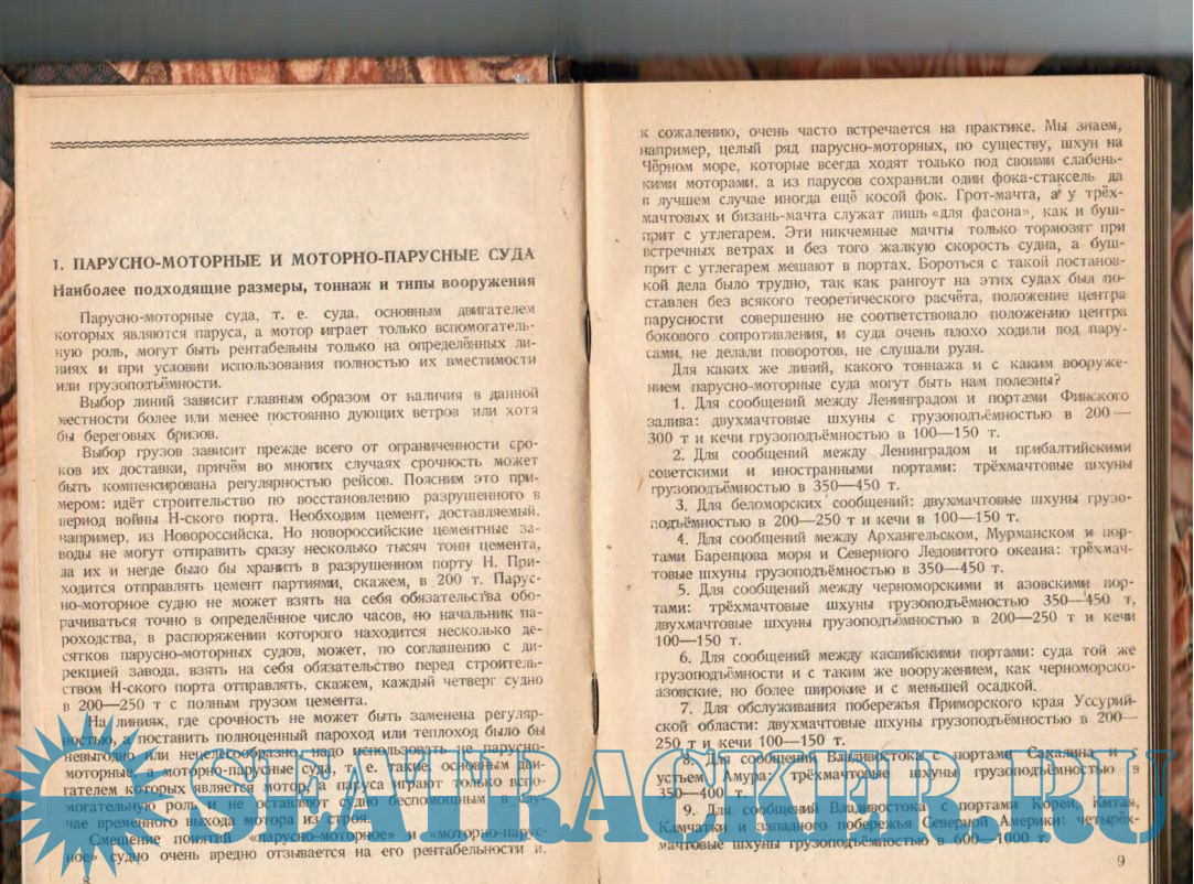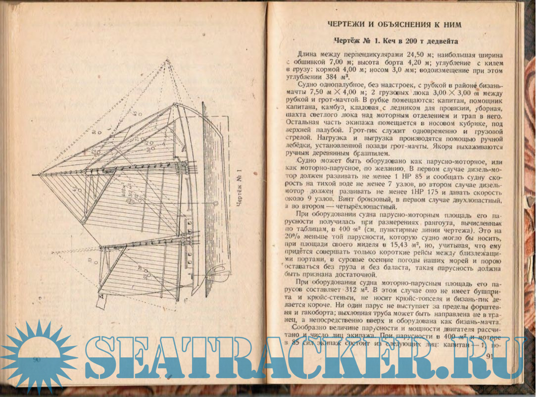 В виде приложения даны чертежи вооружения и парусности пяти примерных парусно-моторных и моторно-парусных судов.