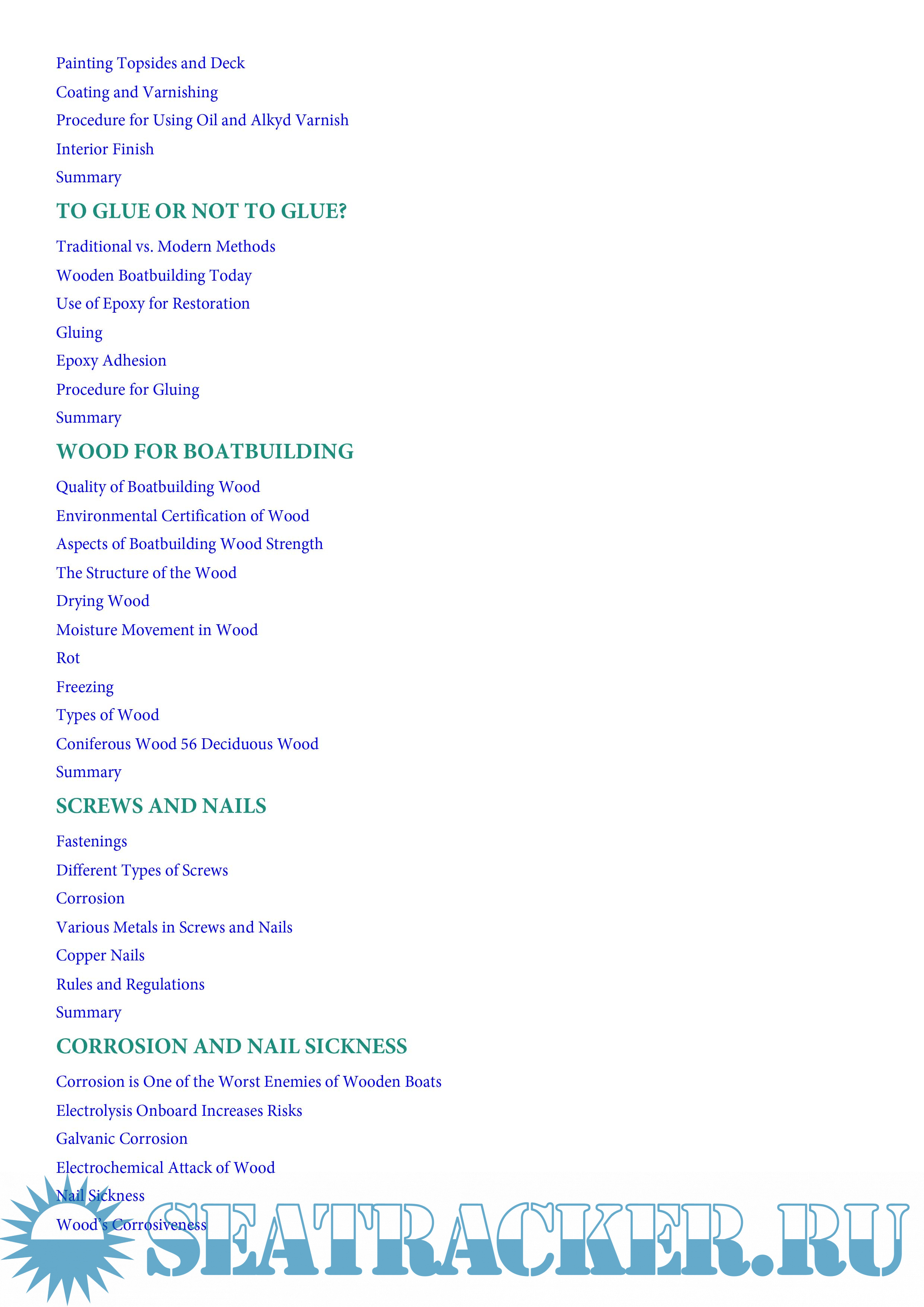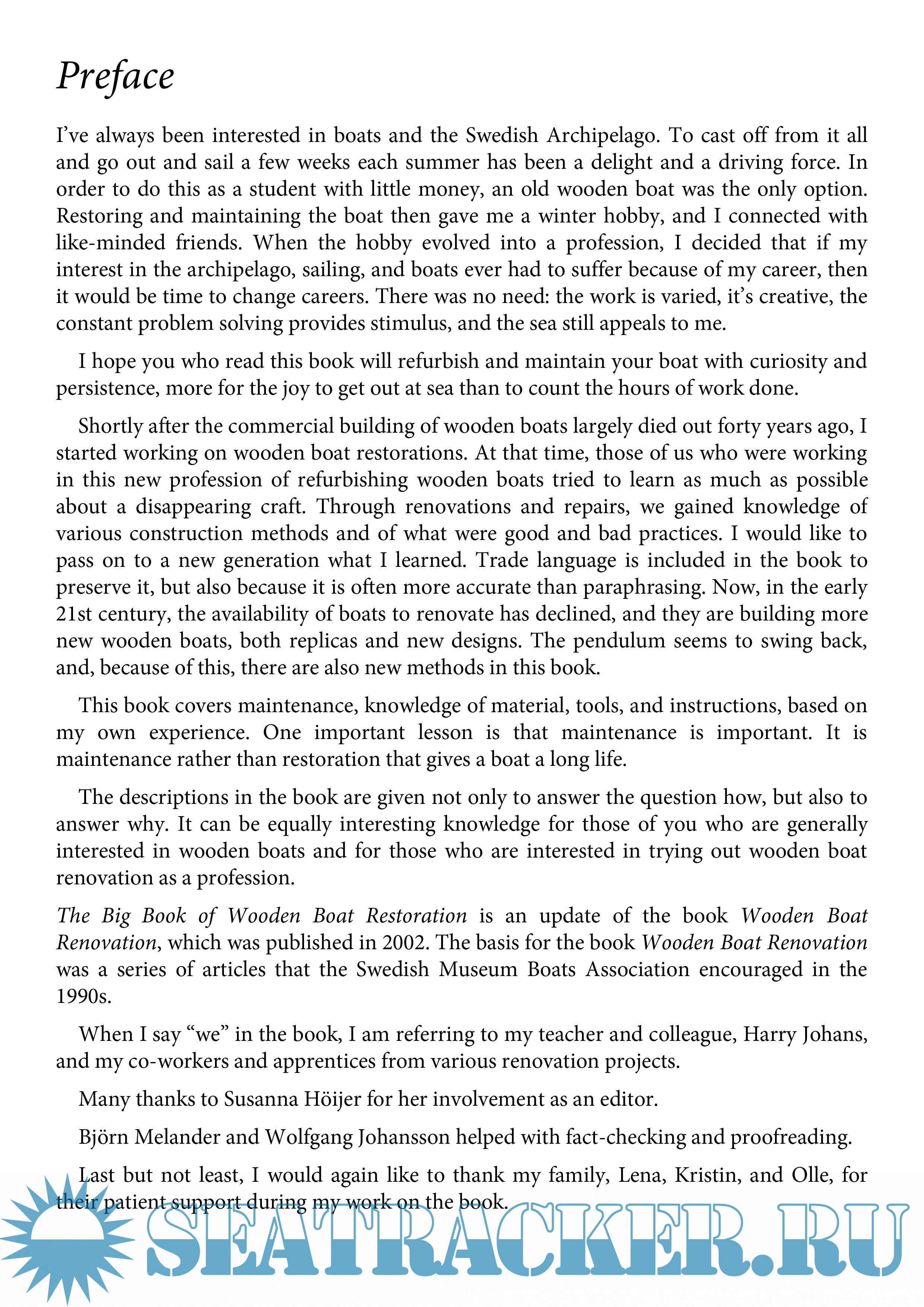 Year: 2013 Language: english Author: Thomas Larsson Genre: Reference book Publisher: Skyhorse Publishing, Inc. ISBN: 978-1-62087-051-8 Format: PDF Quality: eBook Pages count: 315 Description: The Big Book of Wooden Boat Restoration is the perfect introduction or reference guide for wooden boat lovers both experienced and new. Author Thomas Larsson, one of Sweden's most experienced and premier wooden boat restorers, has gathered his thorough knowledge of the subject for the reader and placed it in this book with informative facts and an extensive glossary, accessible to new hobbyists and longtime boat lovers alike. This book contains chapters on boat care, including winter maintenance, racing, finishing, and stripping. You will also find current information on boat building, gluing, and tools. The most extensive part of this book consists of chapters that describe the detailed clean repair of wooden boats”everything from plug-accession and bonding to changing socks and bottom engine installation. Larsson includes a history of boat building and provides a nice glimpse of different wooden boats with over 200 sketches and photos in both color and black-and-white. He explains how staying on top of maintenance keeps a unique fleet of wooden boats alive. With practical instructions and fact-boxes with advice and tips, this book will teach you all about maintenance: surface treatment, scraping the hull, equipping the boat in the spring, and looking after it in the winter, as well as tips about buying a boat, installing an engine, and more.