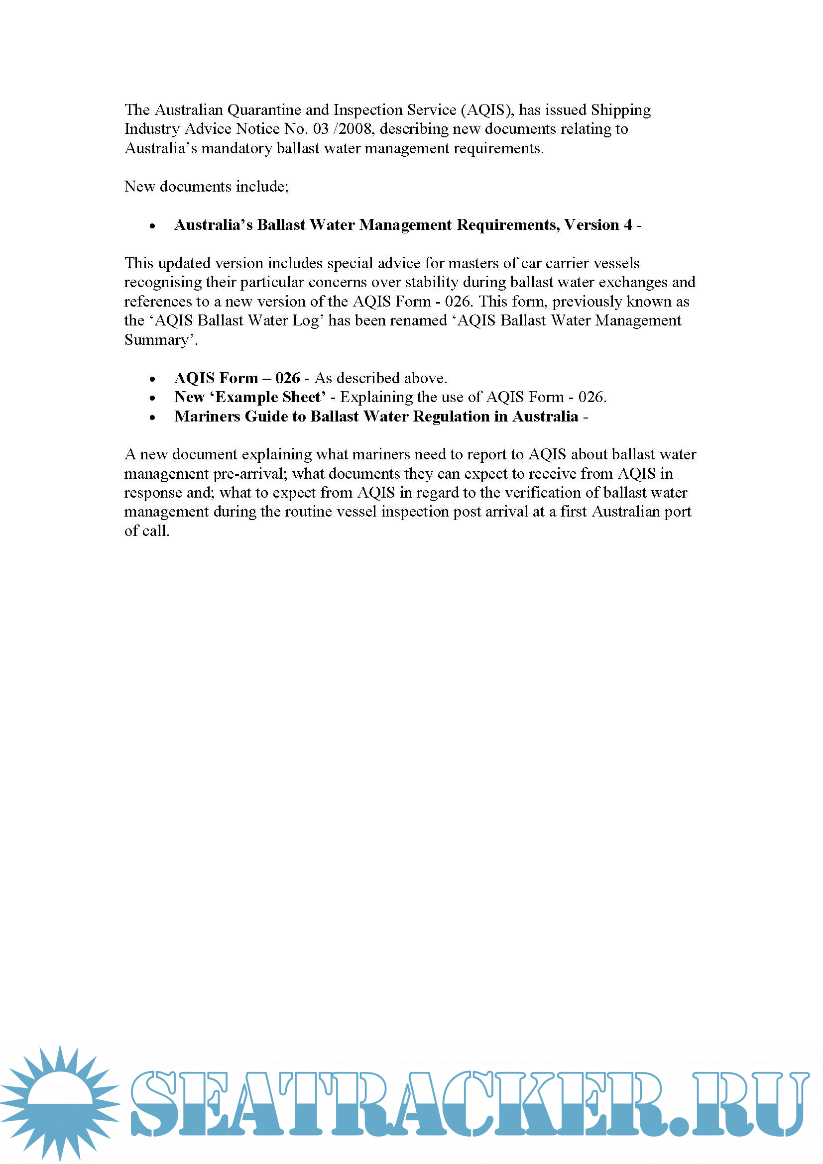 1. Shipping Industry Advice Notice No. 03-2008 with Australian Ballast Water Management Requirements Version 4, AQIS (2008) - pages 222. Australian Ballast Water Management Requirements Version 7, Department of Agriculture and Water Resources, (2017) - 34 Pages
