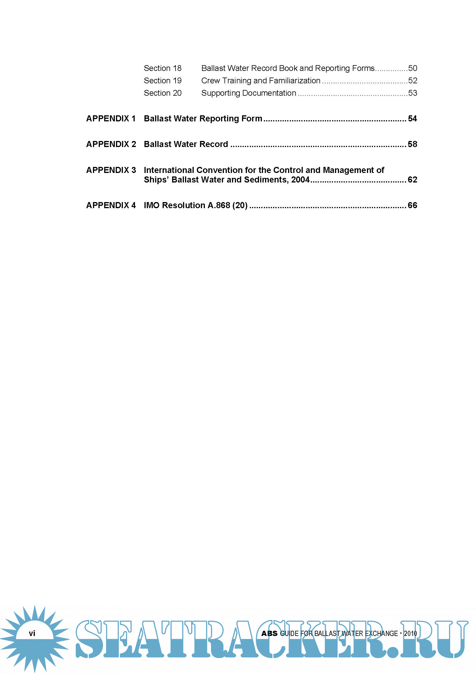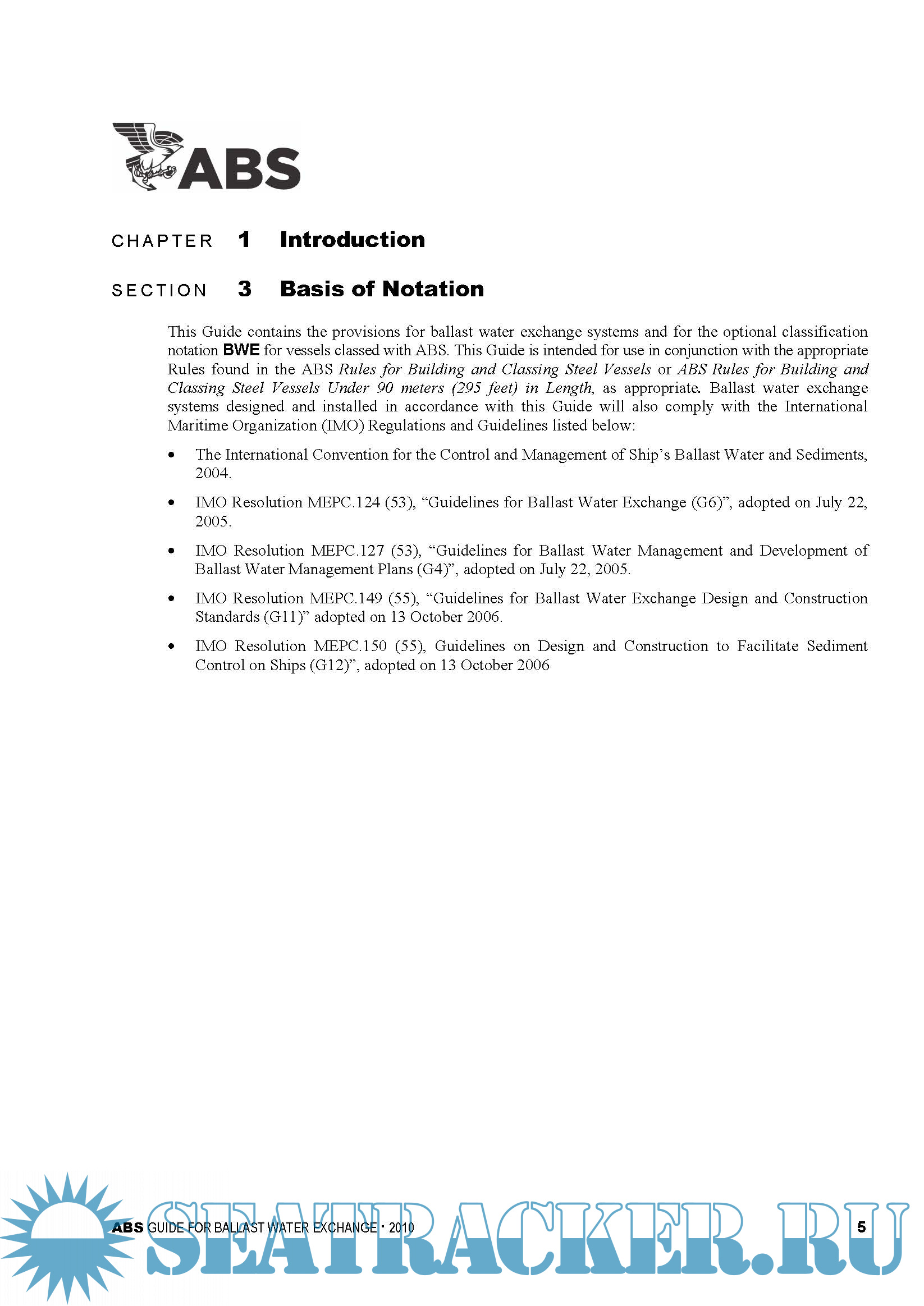 Year: 2018 Language: english Author: ABS Genre: Guide Format: PDF Quality: eBook Pages count: 84 Description: This Guide for Ballast Water Exchange is provided for the use of designers, builders, owners, and operators of vessels classed with ABS and specifies the requirements for obtaining the optional classification notation Ballast Water Exchange (BWE). The BWE notation identifies a level of compliance with the applicable regulations contained in the IMO “International Convention for the Control and Management of Ships’ Ballast Water and Sediments, 2004”, as well as those IMO Guidelines referenced in the Convention addressing ballast water exchange. While the Convention has not yet entered into force, many port States, such as Brazil, Canada and the United States have established national regulations mandating the exchange of ballast water, together with evidence to support that the exchange has taken place (ballast water records). This Guide is to be used in conjunction with other Rules published by ABS and IMO guidelines. Additional info: Updates May 2018 consolidation includes: •February 2016 version plus Notice No. 2 February 2016 consolidation includes: •October 2010 version plus Corrigenda/Editorials October 2010 consolidation includes: •July 2010 version plus Notice No. 1