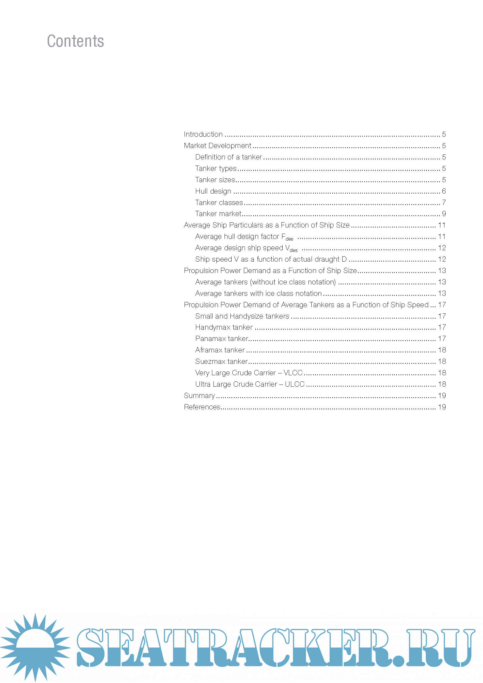 Year: 2013 Language: english Author: MAN Diesel & Turbo Genre: Research papers Publisher: MAN Diesel & Turbo (Copenhagen, Denmark) Format: PDF Quality: eBook Pages count: 22 Description: The economic and technical conditions for the tanker market are continuously changing. For example, 30 years ago the size of a crude oil tanker was to be as large as possible, and the limited safety and environmental demands gave room for the simple mono-hull construction, in comparison to the safer and more advanced double-hull construction of today. In consequence of the globalisation and especially the economic growth in China since the turn of the millennium, the demand for oil has increased and caused increased freight rates because of an increased demand for oil tanker transports. Moreover, the higher the price of oil products, chemicals and other goods, the greater is the demand for main engine propulsion system designs that offer higher ship speeds and, at the same time, optimised fuel consumption. The optimum propeller speed is changing as well, becoming lower and lower, because the larger the propeller diameter that can be used for a ship, the lower the propulsion power demand, and the lower the optimum propeller speed. All of these factors might have an influence on which main engine type is selected/installed as the prime mover, and also on the size of the tanker to be built. The purpose of this paper – dealing with tanker sizes above 5,000 dwt, and based on an analysis of tankers built/ordered over the last eight years – is to illustrate the latest ship particulars used for modern tankers, and to determine their impact on the propulsion power demand and main engine choice, using the latest MAN B&W two-stroke engine programme as the basis.