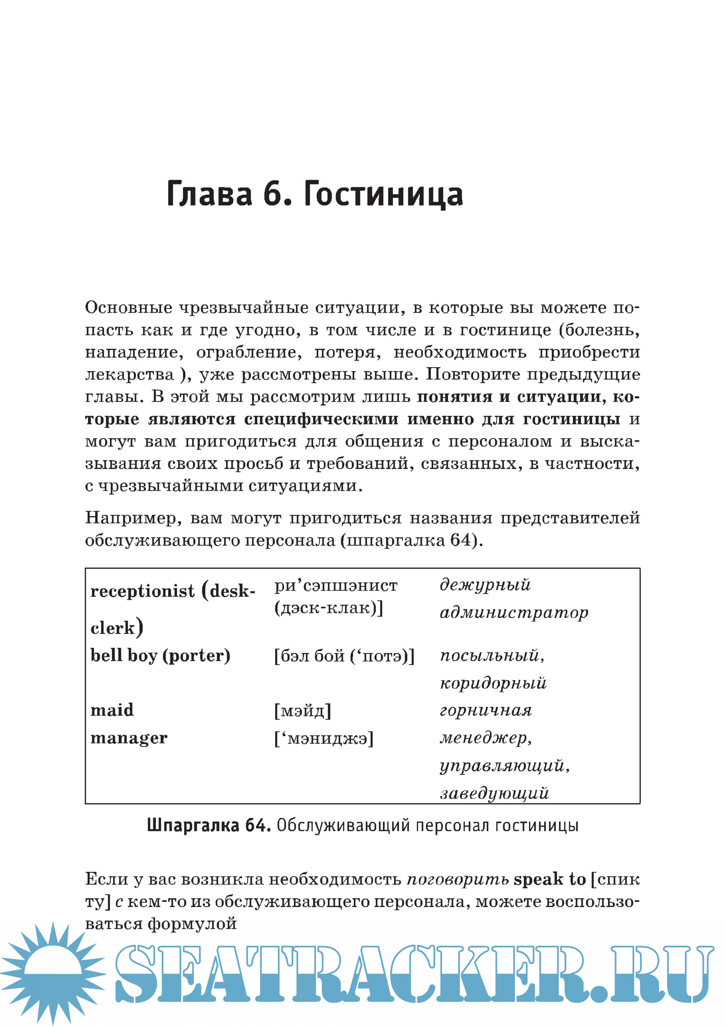 Введение 5 Глава 1. Чрезвычайная ситуация со здоровьем, потребность объясниться с врачом или неравнодушными окружающими 7 Урок 1. Без чего не обойтись 7 Урок 2. Простейшие предложения 14 Урок 3. Становимся вежливыми 22 Урок 4. Повышаем свои шансы на выживание 26 Урок 5. Как сообщить многое о себе по одной простой схеме 38 Урок 6. Чего не можете вы, а может кто-то другой 45 Урок 7. Дополнительные полезные фразы 57 Глава 2. Ориентация на местности... 73 Урок 8. Какие объекты вам могут понадобиться 73 Урок 9. Ваши дополнительные возможности 80 Урок 10. Опорные слова для ориентации на местности 90 Урок 11. Городской общественный транспорт 100 Глава 3. Покупка чего-либо 116 Урок 12. Самое необходимое 116 Урок 13. Формулировка желания купить и покупка продуктов 126 Урок 14. Покупка промышленных товаров 145 Урок 15. Заказ в кафе или ресторане 161 Урок 16. Покупка билетов на транспорт и выезд в другой населенный пункт 170 Урок 17. Обмен валюты 180 Глава 4. Вы что-то или кого-то потеряли 189 Глава 5. Вы подверглись воздействию злоумышленников: у вас что-то украли или на вас напали 198 Глава 6. Гостиница.. 211 Глава 7. Таможня.... 225 Глава 8. Если власти имеют к вам претензии 229 Итоговая шпаргалка ко всей книге: самое необходимое 234
