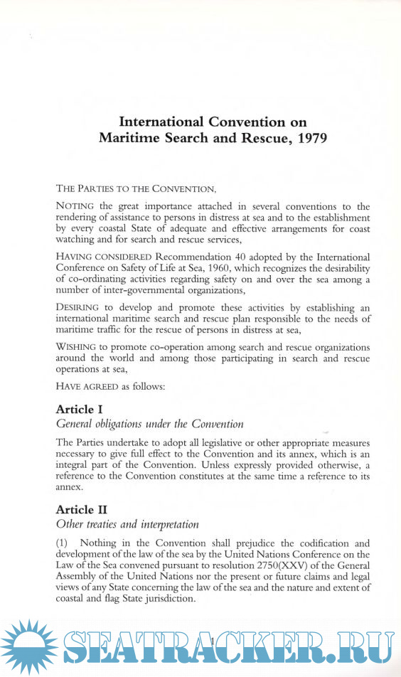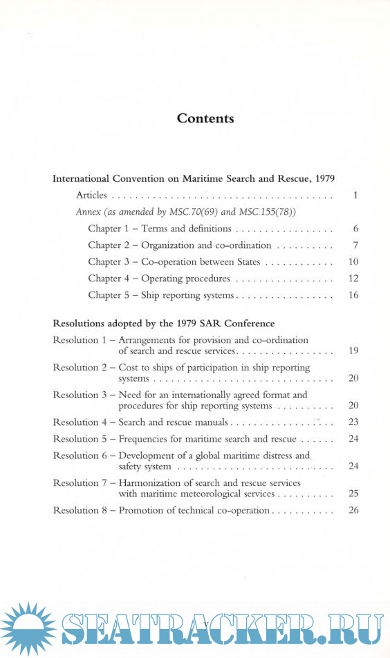 Year: 2006 Language: english Author: IMO Genre: Convention (rules) Publisher: MPG Books Edition: Third edition Format: PDF Quality: Scanned pages Pages count: 31 Description: The International Conference on Maritime Search and Rescue, in April 1979, concerned the establishment of an international maritime search and rescue (SAR) plan covering the needs for ship reporting systems, SAR services and the rescue of persons in distress at sea. Included in the publication are: Final Act of the Conference; International Convention on Maritime Search and Rescue (SAR), 1979; Resolutions adopted by the Conference.