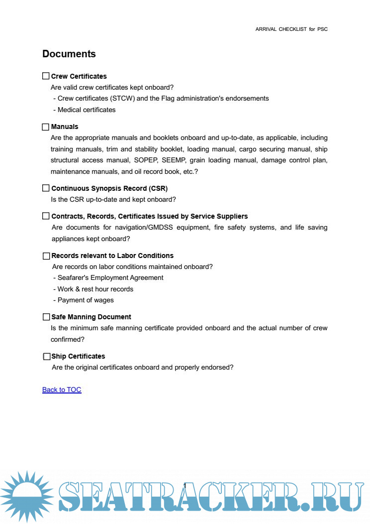 To minimize the risk of your ship being detained by PSC, the checklist should be used by the vessel’s crew prior to arrival into port. The items identified in this checklist focus on areas where deficiencies that have often resulted in PSC detention.