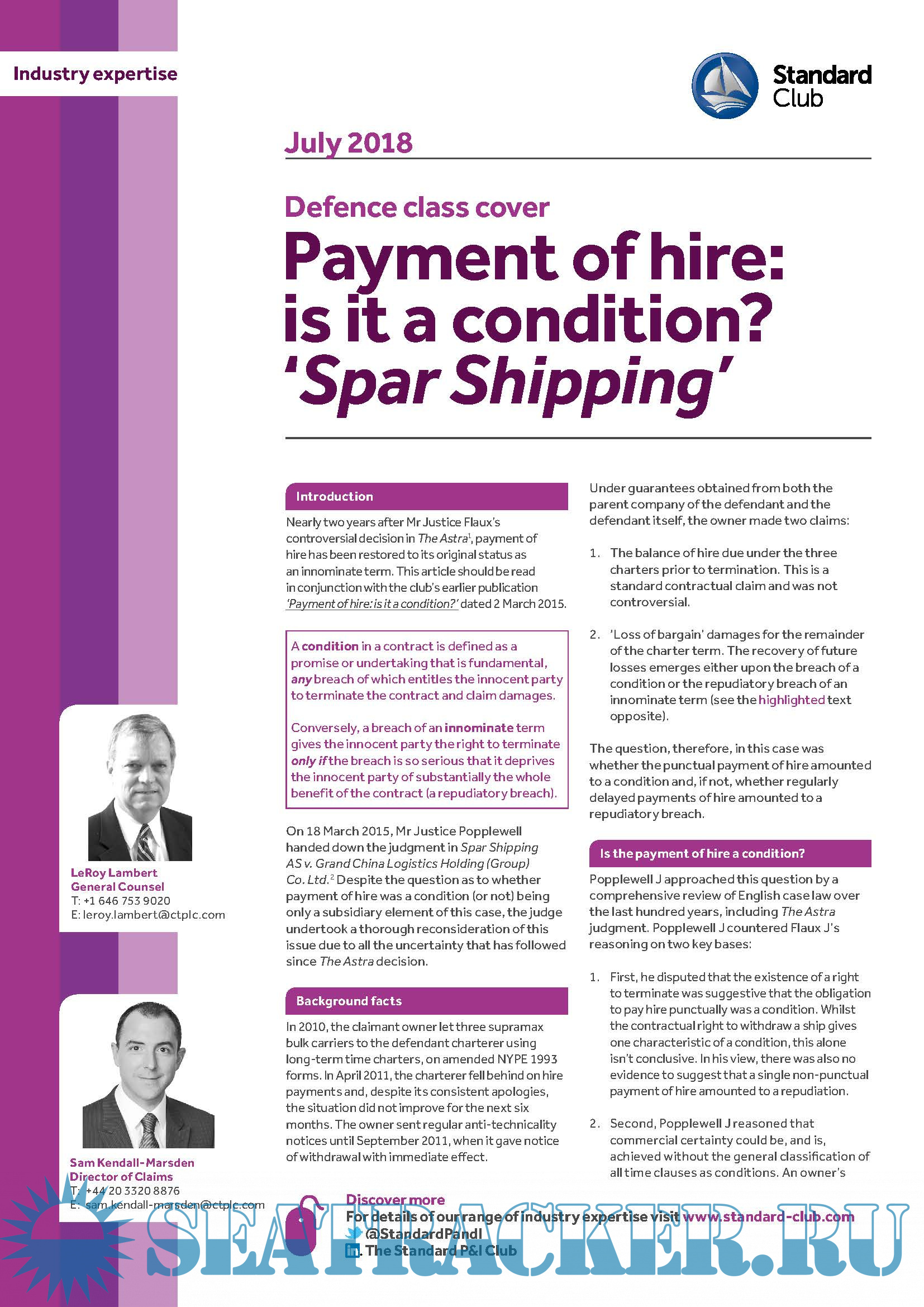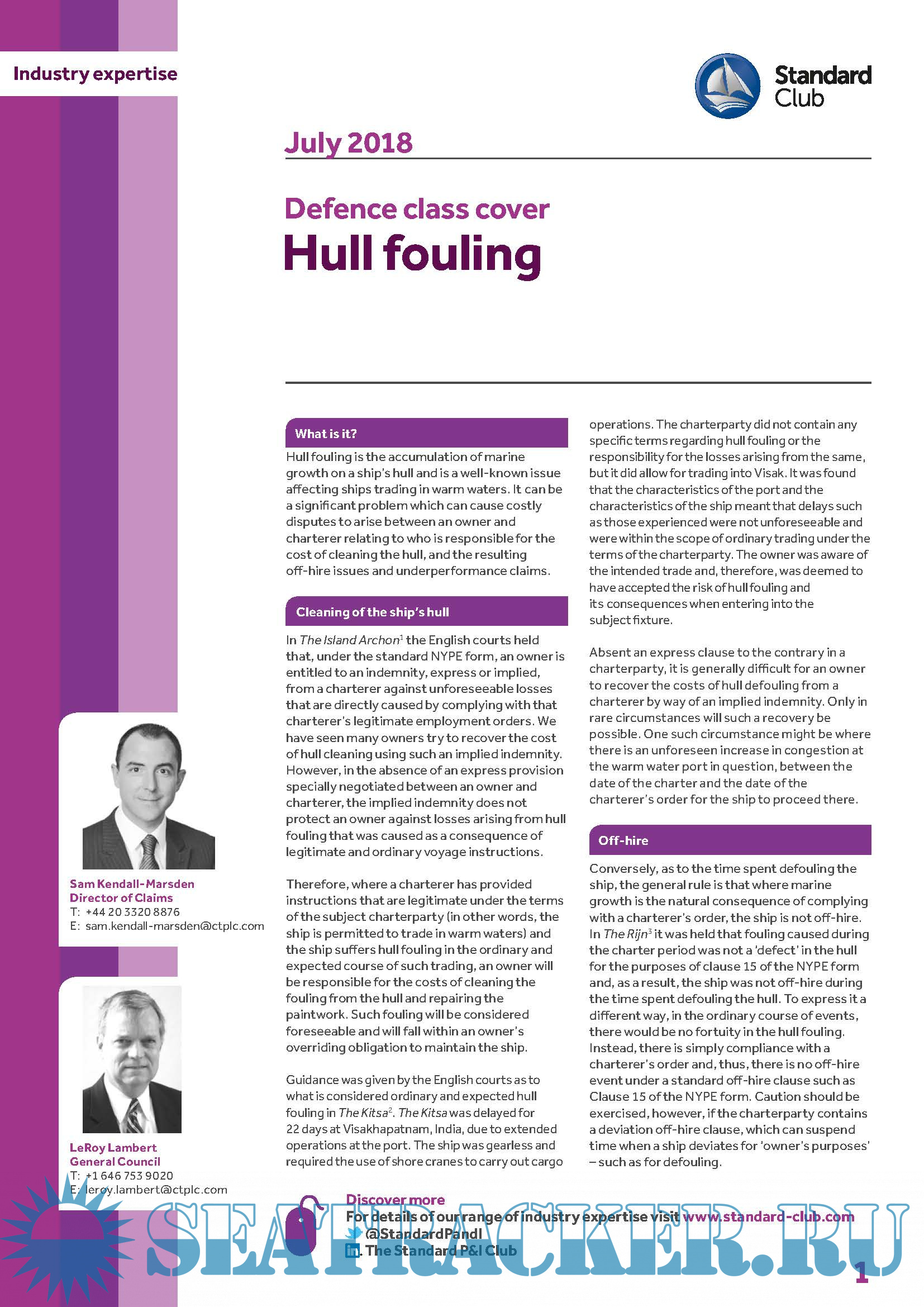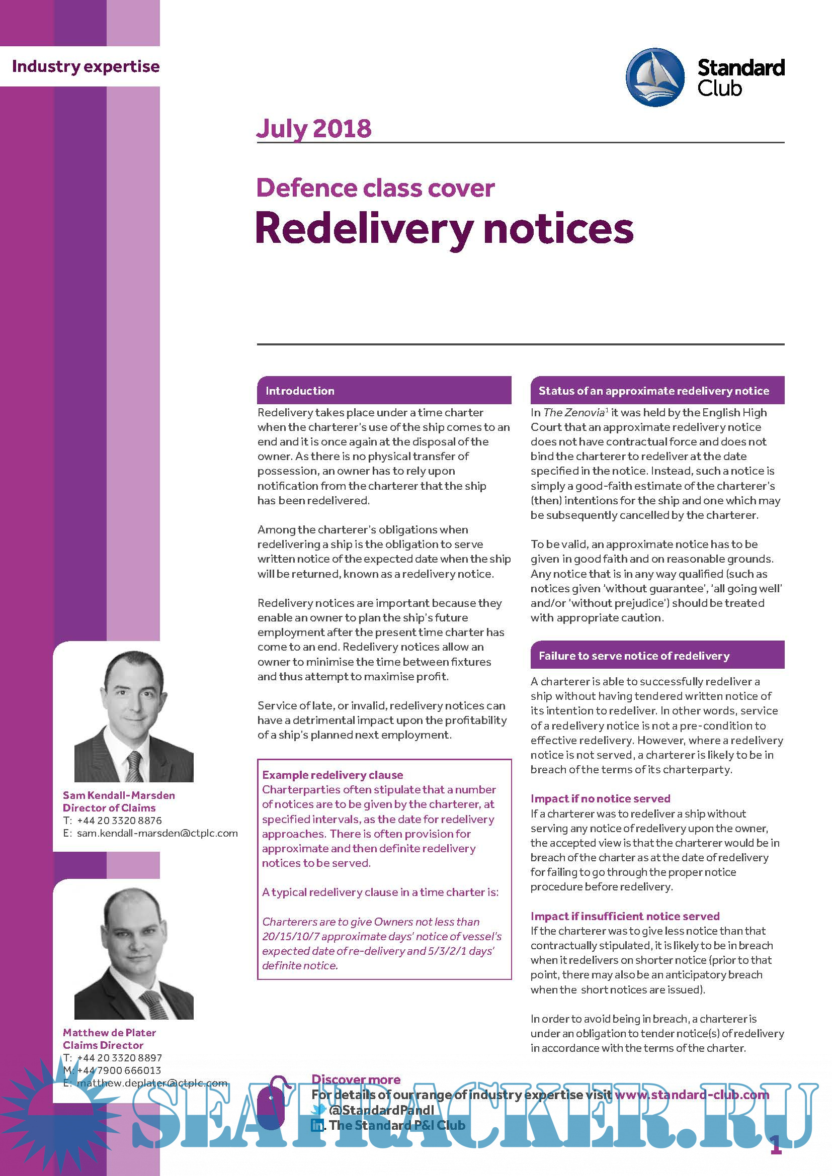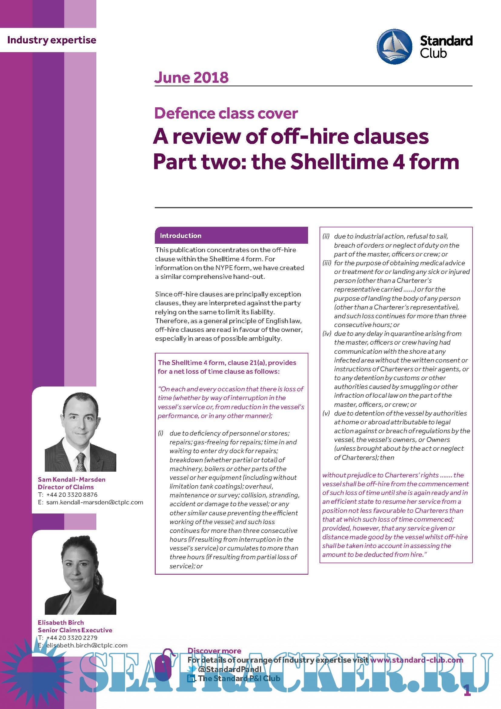 Description: This Download contains Industry expertise from The Standard P&I Club 2018 Bulletins relating to Defense class cover & Contracts of carriage and bills of lading The Hague Visby Rules. For a complete description refer to contents.