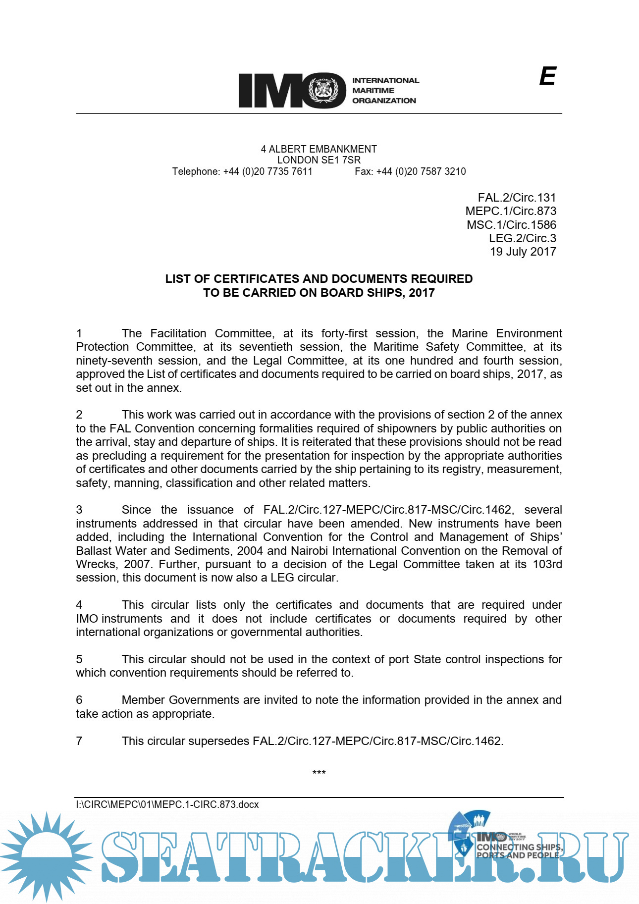 Description: This circular lists only the certificates and documents that are required under IMO instruments and it does not include certificates or documents required by other international organizations or governmental authorities