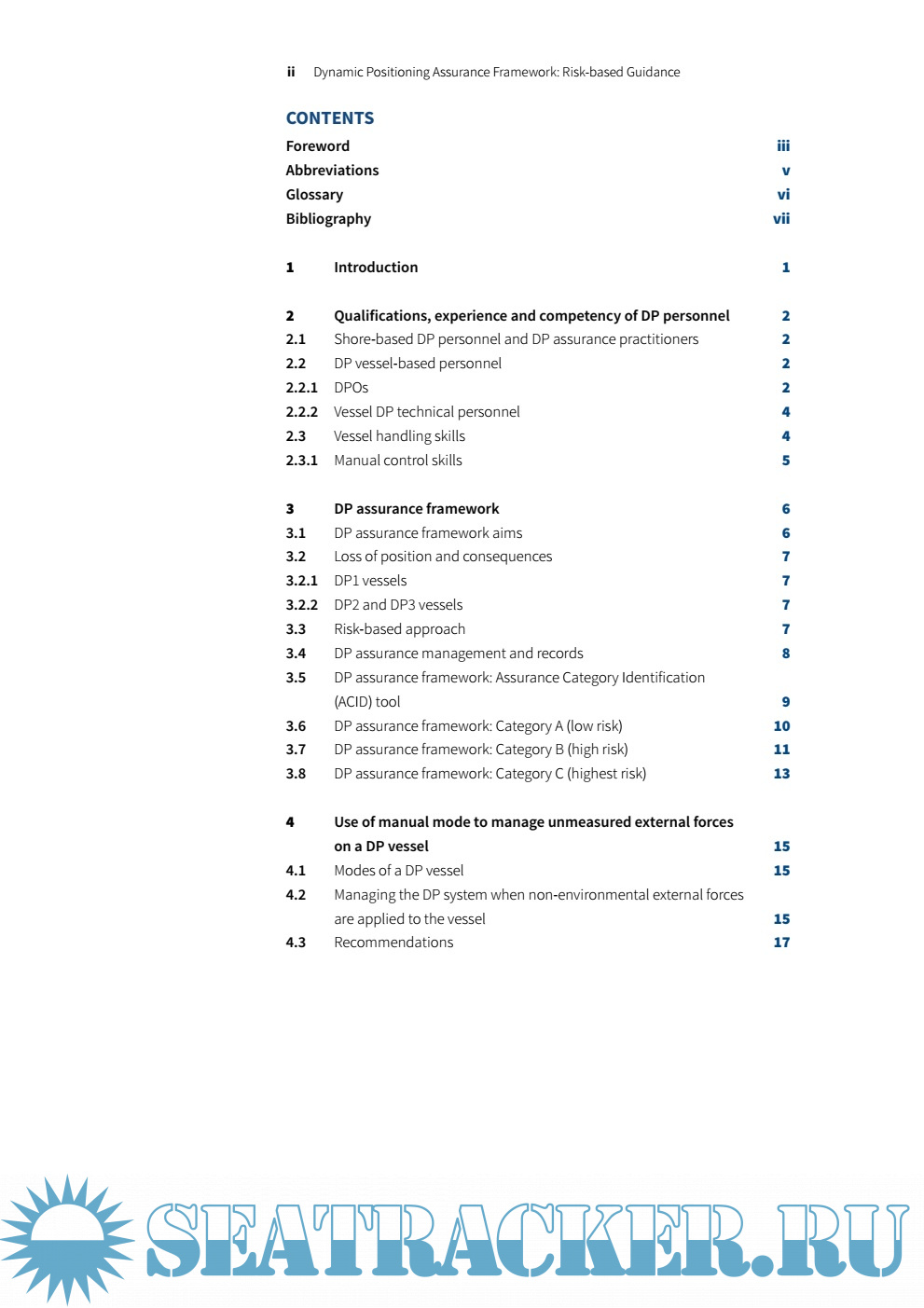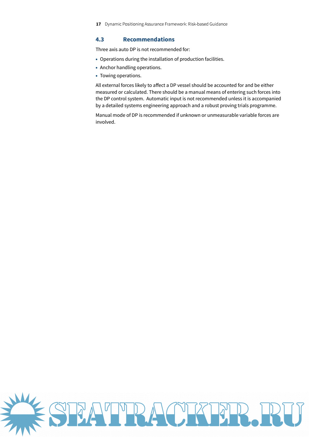 Year: 2016 Language: english Author: Oil Companies International Marine Forum Format: PDF Quality: eBook Pages count: 27 Description: This paper aims to define sound Dynamic Positioning (DP) assurance practices which are scalable based upon the level of risk. It also sets out DP operational best practices focused on external forces. External forces may include tow wires, running risers, anchors, i.e. any force that is unmeasured but that might act on the vessel to exceed its capability. This paper specifically addresses high risk operations both within and outside of the 500m safety zone.