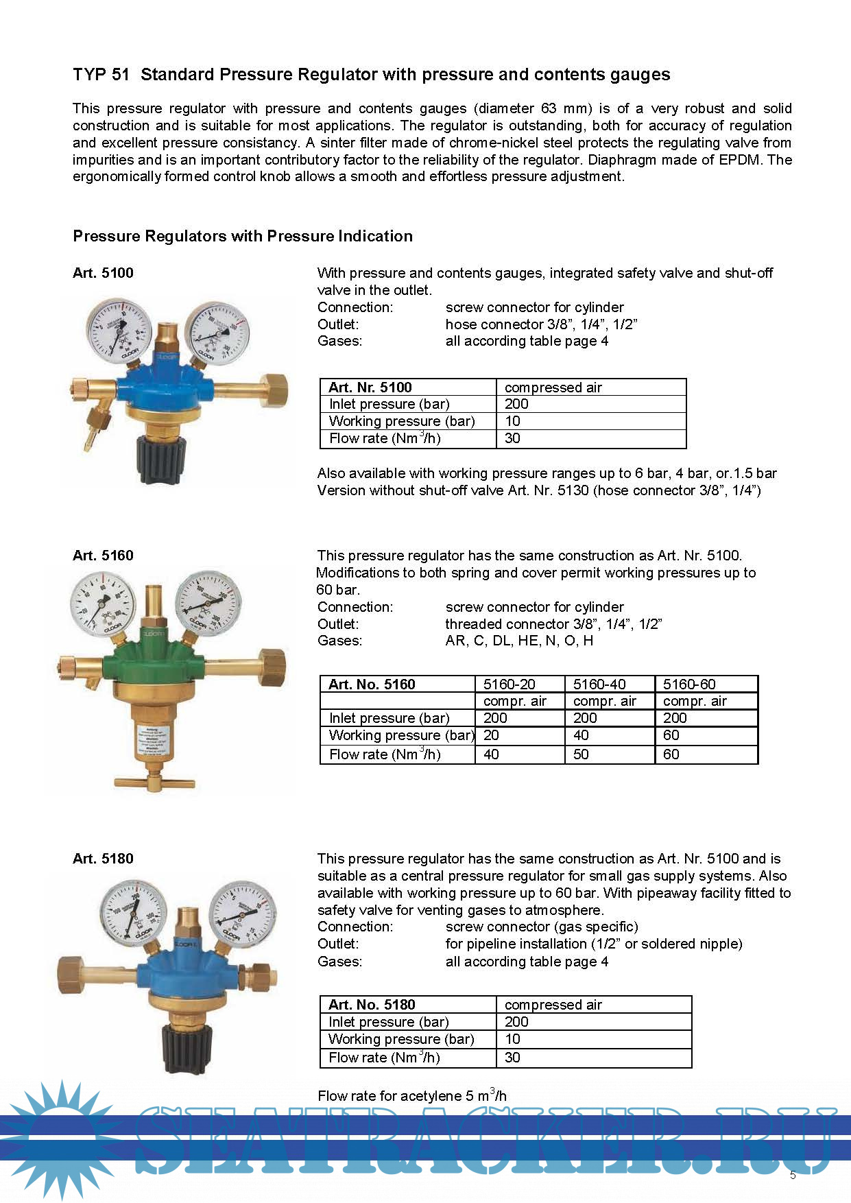 Year: 2018 Language: english Author: Various Genre: Catalogue Format: PDF Quality: eBook Pages count: 207 Description: Pressure regulators are used to reduce a gas from a higher input pressure (p1) to a lower output pressure (p2). They are used everywhere where compressed gas from tank systems or high-pressure cylinders has to be reduced to a particular working pressure. Important quality features of our pressure regulators include high regulation accuracy at various gas outlet rates (V) together with an automatic response to the reduction in inlet pressure as the cylinder contents decrease. For a complete list of catalogs refer to contents.