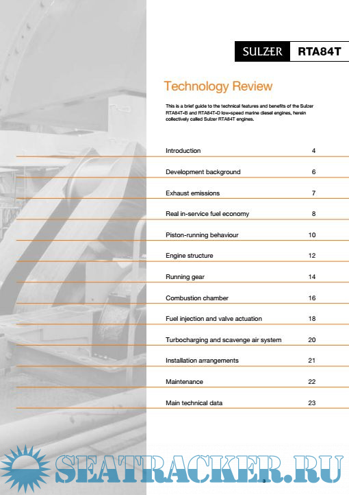 Description: This is a brief guide to the technical features and benefits of the Sulzer RTA84T-B and RTA84T-D low-speed marine diesel engines, herein collectively called Sulzer RTA84T engines.