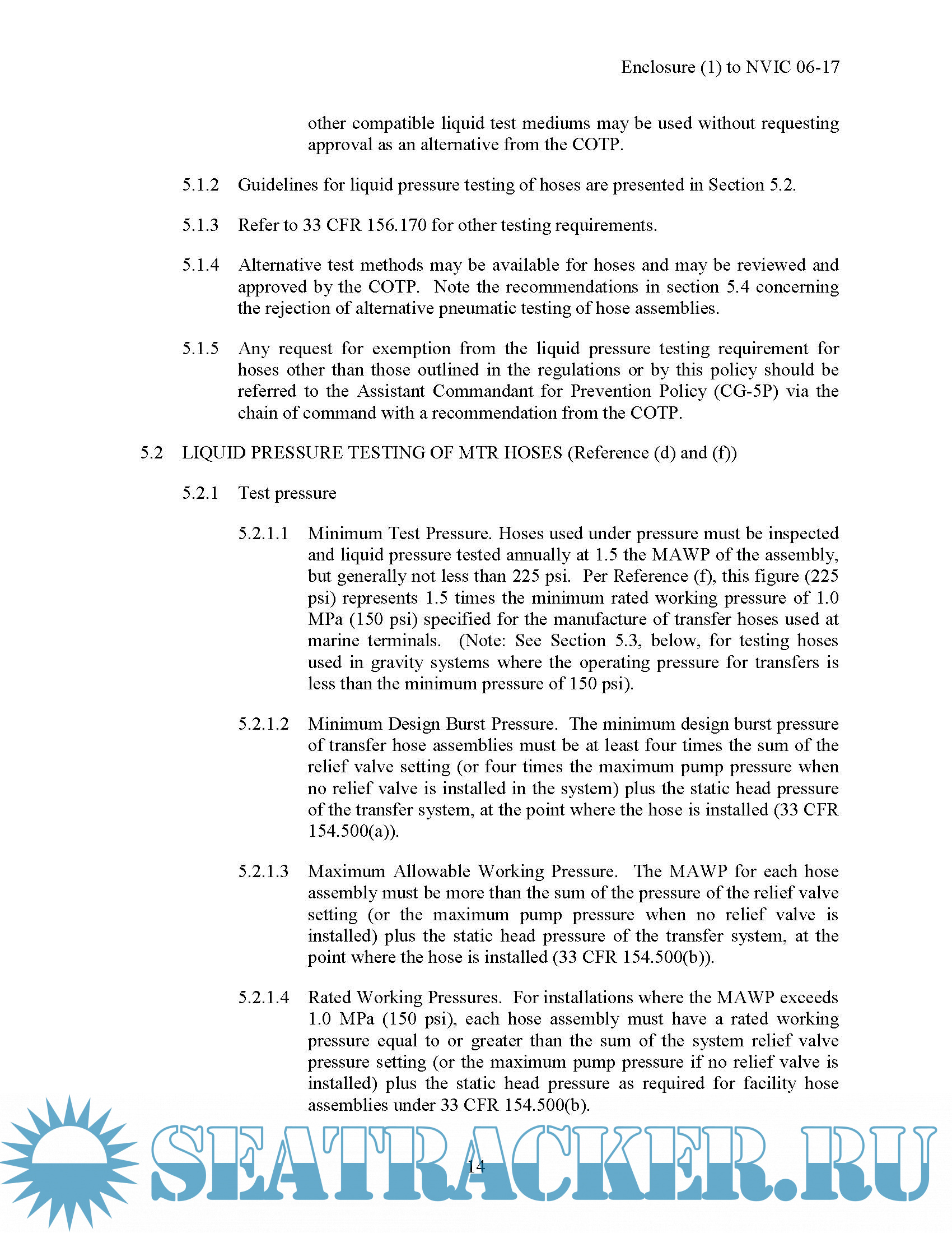 Navigation and Vessel Inspection Circular No. 06-17, Pipeline and Hose Testing Guidance for Marine Transportation Related Facilities Handling Oil or Hazardous Material in Bulk