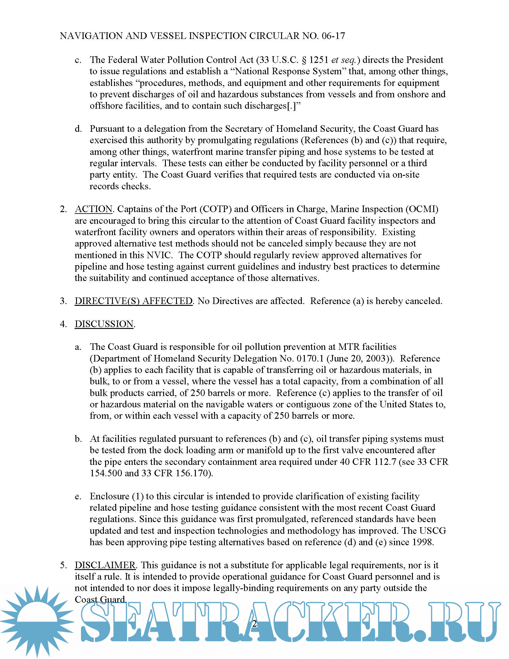 Description: This circular replaces the guidance contained in Reference (a) and provides expanded information concerning pipeline and hose testing guidance at facilities that are capable of transferring oil or hazardous materials in bulk, to or from a vessel. This guidance is consistent with existing regulations, and it provides expanded information and recommendations for the Captain of the Port (COTP) and Officer in Charge, Marine Inspection (OCMI) to consider when evaluating the acceptability of proposed alternative test methods for jurisdictional facility pipe and hose tests and inspections