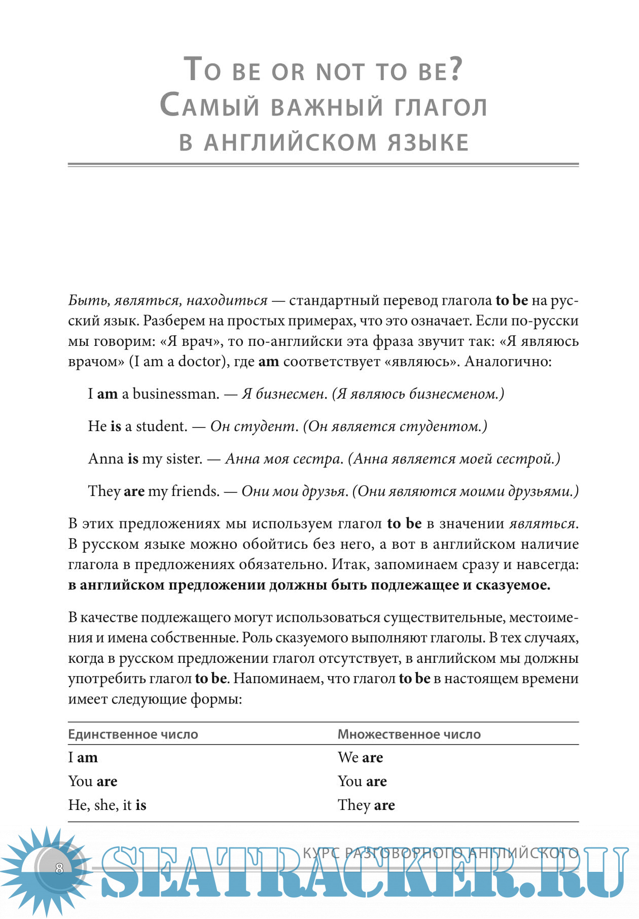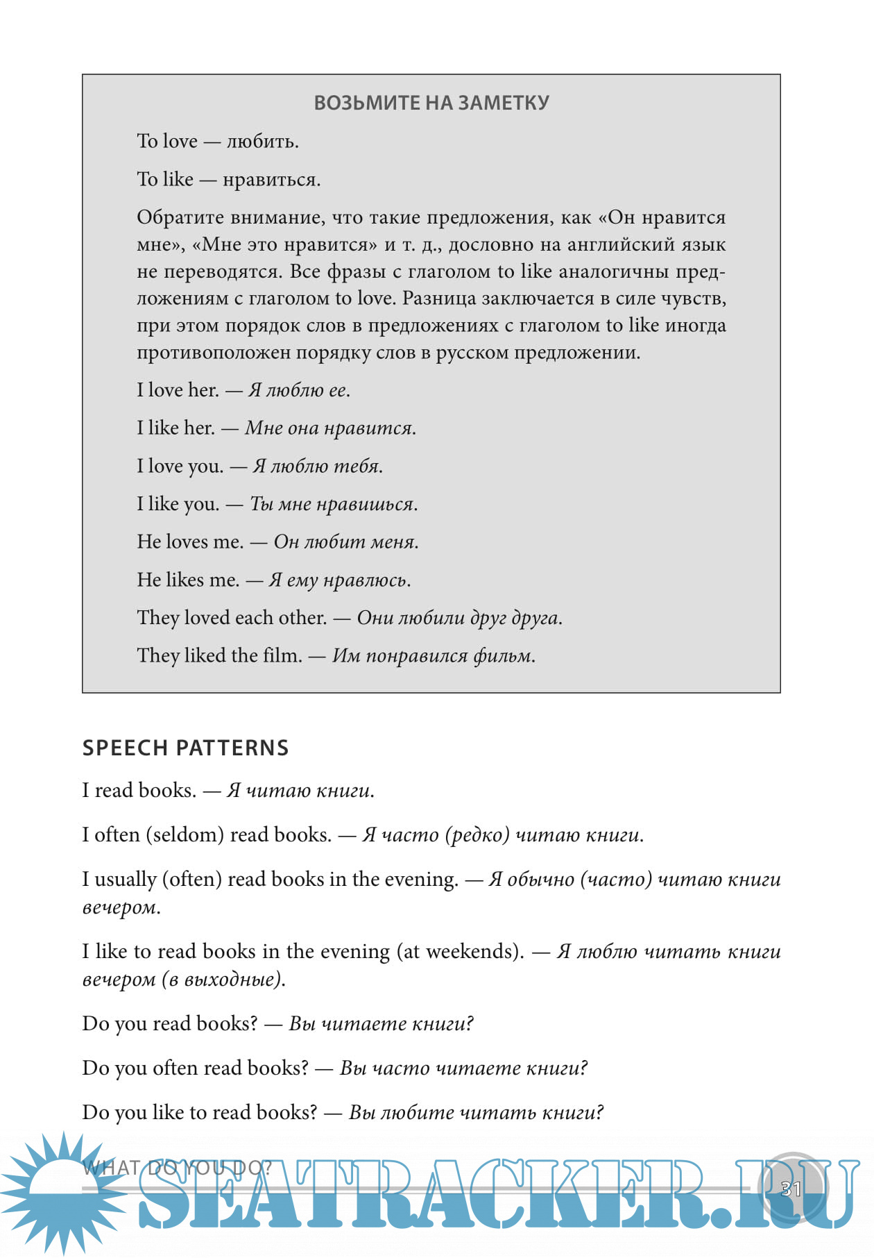 К читателям. То be or not to be? Самый важный глагол в английском языке. What are you doing at the moment? Чем вы занимаетесь в данный момент?. What do you do? Чем вы занимаетесь?. What are you plans for tomorrow? Какие у вас планы на завтра?. What did you do yesterday? Что вы делали вчера?. Have you already done it? Вы уже сделали это?. Summary. Порядок слов в предложениях. What's happened? Вопрос к подлежащему. Have you got.? Глагол to have и оборот have got. Оборот to have to. Is there.? Мы выясняем, есть ли то, что нам нужно, и где это находится. What would you like? Глаголы to need, to want, оборот would like. What can we do for you? Что мы можем сделать для вас?. What should we do? Что нам следует делать?. Summary. Особенности модальных глаголов. It must be done. Пассивные конструкции. То do or not to do? Простой инфинитив. I know nothing. Отрицание в английском предложении. I know it. Местоимение it. Something and somebody. Употребление местоимений some, any и их производных. Prepositions. Английские предлоги. Phrasal verbs. Фразовые глаголы. Right choice of words. Правильный выбор слов. Существительные, прилагательные и наречия. Conversational formulas. Формулы общения и общеупотребительные фразы. Список базовых глаголов английского языка. Grammar review. Краткий грамматический справочник.