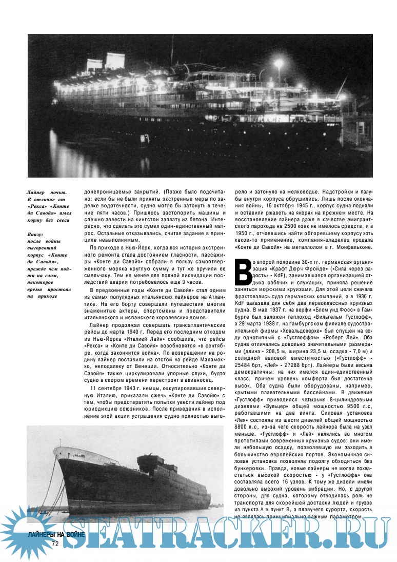 Год выпуска: 2002 Язык: русский Автор: Кудишин И., Челядинов М. Жанр: История Издательство: Техника - молодежи Формат: PDF Качество: Отсканированные страницы + слой распознанного текста Количество страниц: 84+101 Описание: В первой половине прошлого века пассажирские лайнеры оставались единственным транспортным средством, позволявшим путешественнику с комфортом переправиться с одного континента на другой. Это были прекрасные океанские суда — воплощение последних достижений гидродинамики, энергетики, корабельной архитектуры, декора… На таком лайнере пассажир должен был чувствовать себя, как дома. О судьбе этих судов известно до обидного мало. А ведь многие из них успели показать себя не только в мирное время, но и принимали активное участие в мировых войнах и локальных конфликтах XX столетия. В предлагаемых книгах рассказывается о малоизвестных фактах биографии знаменитых пассажирских лайнеров, в том или ином качестве участвовавших в боевых действиях. Текст сопровождают редкие фотоснимки пассажирских судов. Первая книга посвящена лайнерам, построенным до Первой мировой войны таким, как «Кронпринц Вильгельм», «Лузитания», «Олимпик», «Британник», «Фатерлянд» и некоторым другим. Вторая книга рассказывается о судах, построенных в период между двумя мировыми войнами — «Куин Мэри», «Нормандия», «Рекс», «Бремен», «Вильгельм Густлофф», «Канберра» и других.