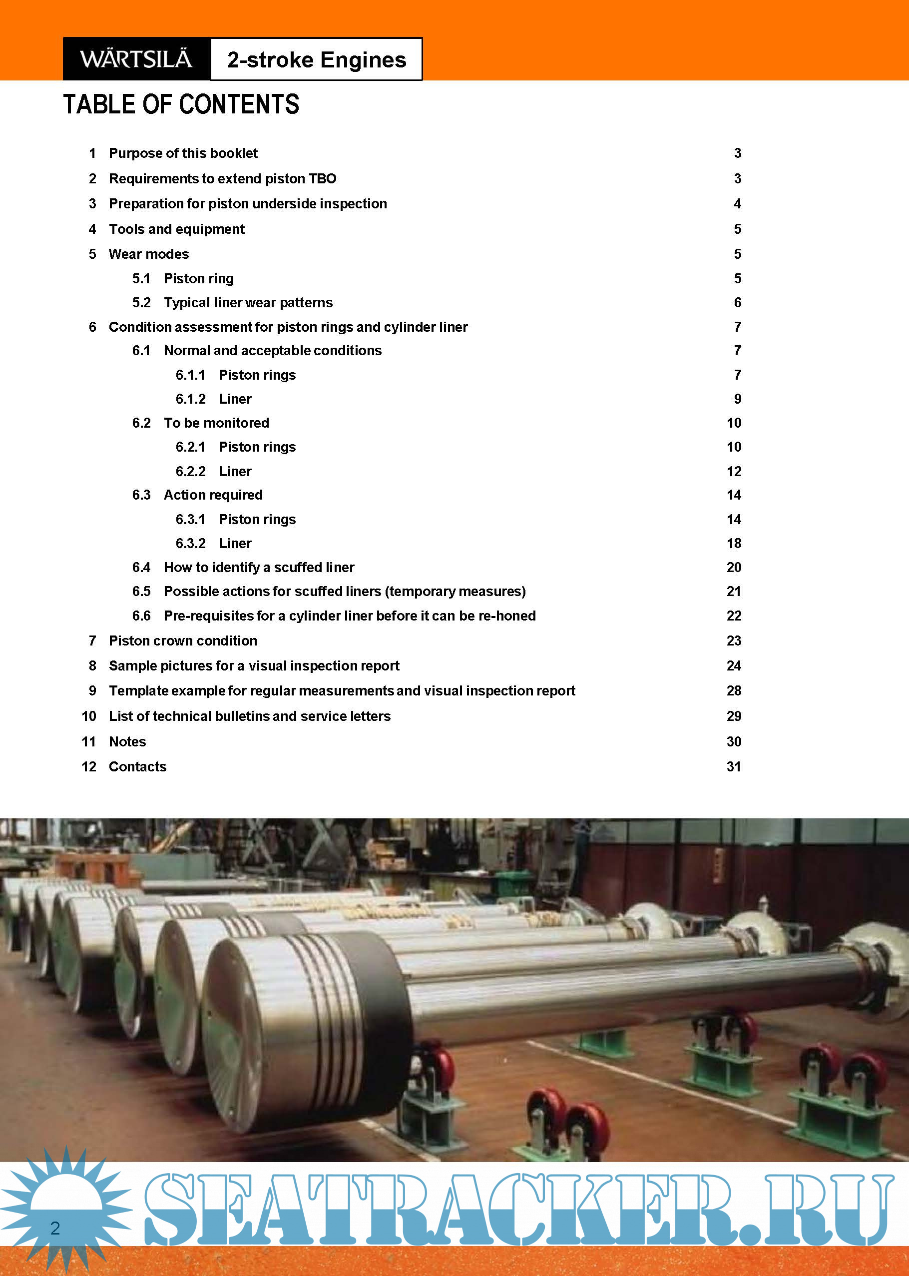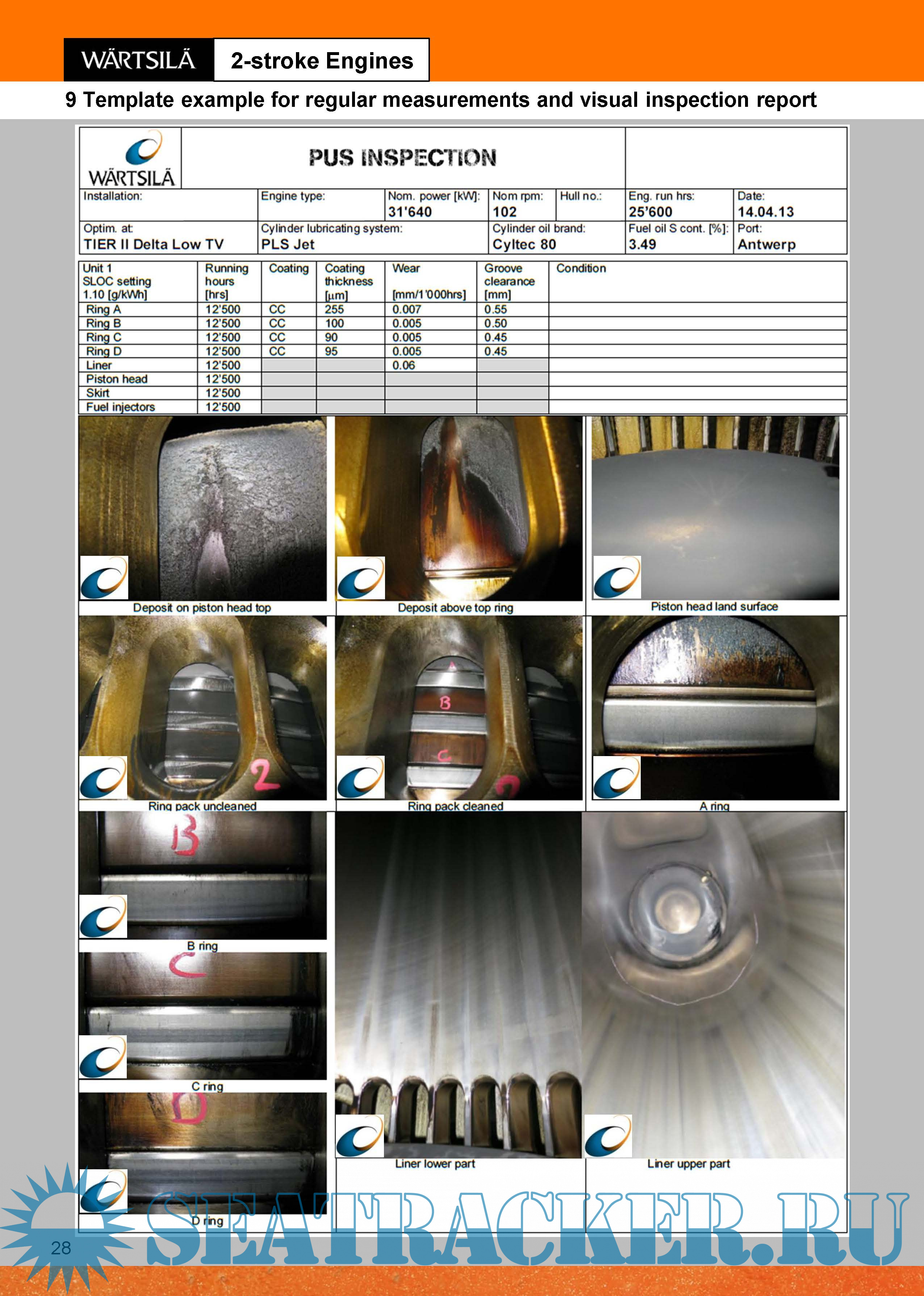 Year: 2014 Language: english Author: Wärtsilä Genre: Guide Format: PDF Quality: eBook Pages count: 32 Description: This booklet shall serve as a guide for judging the condition of relevant components (liners, pistons and piston rings) for the condition-based maintenance during piston and liner overhauls of engines with latest piston-running standard with full CC (chromium ceramic) piston ring packages or CC top ring and lower RC (running-in coating) rings for smaller bores. Actual wear rates strongly depend on operational factors, such as fuel oil in use, engine load profile, ambient conditions etc. Especially with today’s slow steaming, engines may suffer from cold corrosion resulting in an increased wear on cylinder liners and piston rings, considerably reducing the TBO (time between overhauls). With this guide the overhauls can be planned, taking the operational conditions into account. On the other hand, for engines running under moderate operation conditions, piston overhauls can be extended, and piston TBO beyond 30’000 hours is achievable.