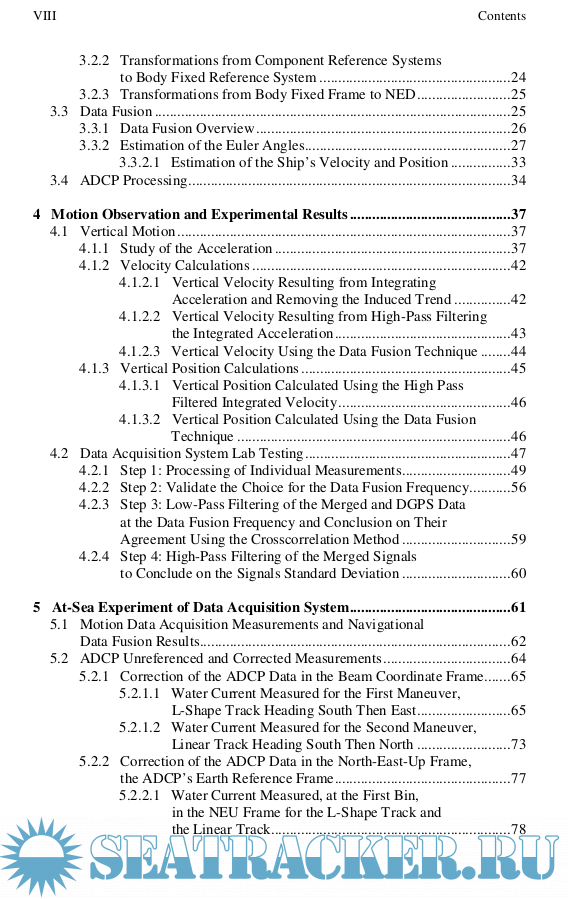 Year: 2013 Language: english Author: Chrystel Gelin Genre: Textbook / Research book Publisher: Springer International Publishing Edition: 1 ISBN: 978-3-642-32015-6 Format: PDF Quality: eBook Pages count: 112 Description: Dead-Reckoning aided with Doppler velocity measurement has been the most common method for underwater navigation for small vehicles. Unfortunately DR requires frequent position recalibrations and underwater vehicle navigation systems are limited to periodic position update when they surface. Finally standard Global Positioning System (GPS) receivers are unable to provide the rate or precision required when used on a small vessel. To overcome this, a low cost high rate motion measurement system for an Unmanned Surface Vehicle (USV) with underwater and oceanographic purposes is proposed. The proposed onboard system for the USV consists of an Inertial Measurement Unit (IMU) with accelerometers and rate gyros, a GPS receiver, a flux-gate compass, a roll and tilt sensor and an ADCP. Interfacing all the sensors proved rather challenging because of their different characteristics. The proposed data fusion technique integrates the sensors and develops an embeddable software package, using real time data fusion methods, for a USV to aid in navigation and control as well as controlling an onboard Acoustic Doppler Current Profiler (ADCP). While ADCPs non-intrusively measure water flow, the vessel motion needs to be removed to analyze the data and the system developed provides the motion measurements and processing to accomplish this task. Additional info: Springer Series on Naval Architecture, Marine Engineering, Shipbuilding and Shipping Vol.1