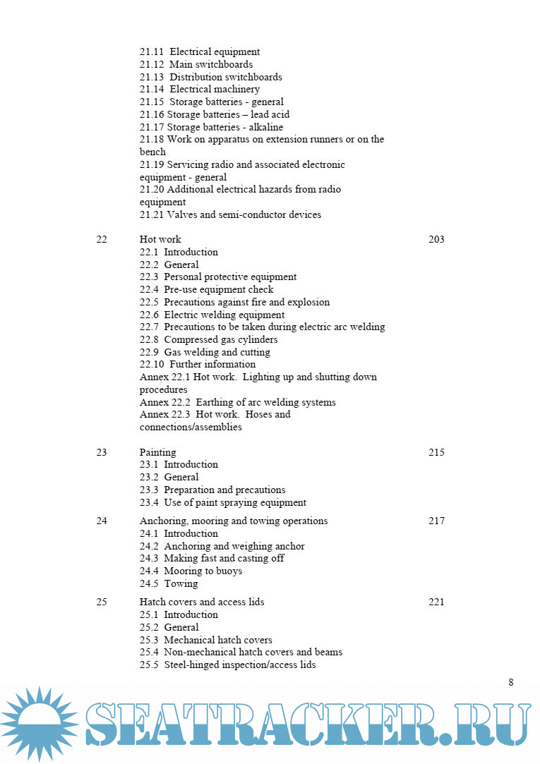 Year: 2006 Language: english Author: Department of Merchant Shipping of Cyprus Genre: Convention (rules) Format: PDF Quality: eBook Pages count: 288 Description: This Code of Safe Working Practices is intended primarily for seamen on Cyprus registered vessels which goon international voyages, or, for fishing vessels, operating outside Cyprusterritorial waters. It is not intendedfor seamen on pleasure craft, or ships which do not go on international voyages, although the guidance in itmay be of use to them also. Copies of the current edition of the Code must be carried on all Cyprus ships mentioned in the first sentenceabove, and a copy must be made available to any seamanin the ship who requests it. This Code is addressedto everyone on a ship regardless ofrank or rating because the recommendations can be effective only if theyare understood by all and if all co-operate in their implementation. Those not them selves actually engaged ina job in hand should be aware of whatis being done, so that they may avoid putting themselves at risk orthose concerned at risk by impeding or needlessly interfering with the conduct of the work.