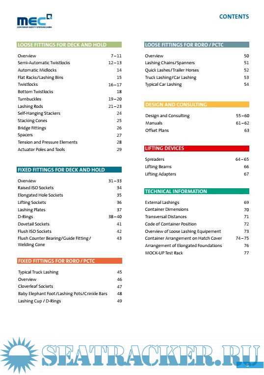 Year: 2015 Language: english Author: MEC Container Safety System GmbH Genre: Catalogue Publisher: MEC Format: PDF Quality: eBook Pages count: 78 Description: MEC CSS is a German-owned company with more than 25 years experience inlashing equipment. Their global network has helped them grow into a global company. Their range of services and deliveries comprises stowage systems in close cooperation with shipyards and shipowners, taking into consideration the practical requirements of the vessel. Their main mission is to simplify cargo operation. The development and production of fixed and loose fittings for container ships, PCTC’s and RoRo carriers are approved by all major classification societies such as DNV GL, LRoS and ABS. All design projects such as cell guide systems, lashing bridges, container stanchions and working platforms are carried out by experienced shipbuilding engineers in head office in Hamburg. In order to render best service on shortest notice to customers, Company maintain agencies/representations in big ports worldwide. Their locations such as Hamburg, Shanghai, Singapore and Houston have well-equipped stocks to handle customers‘ needs.