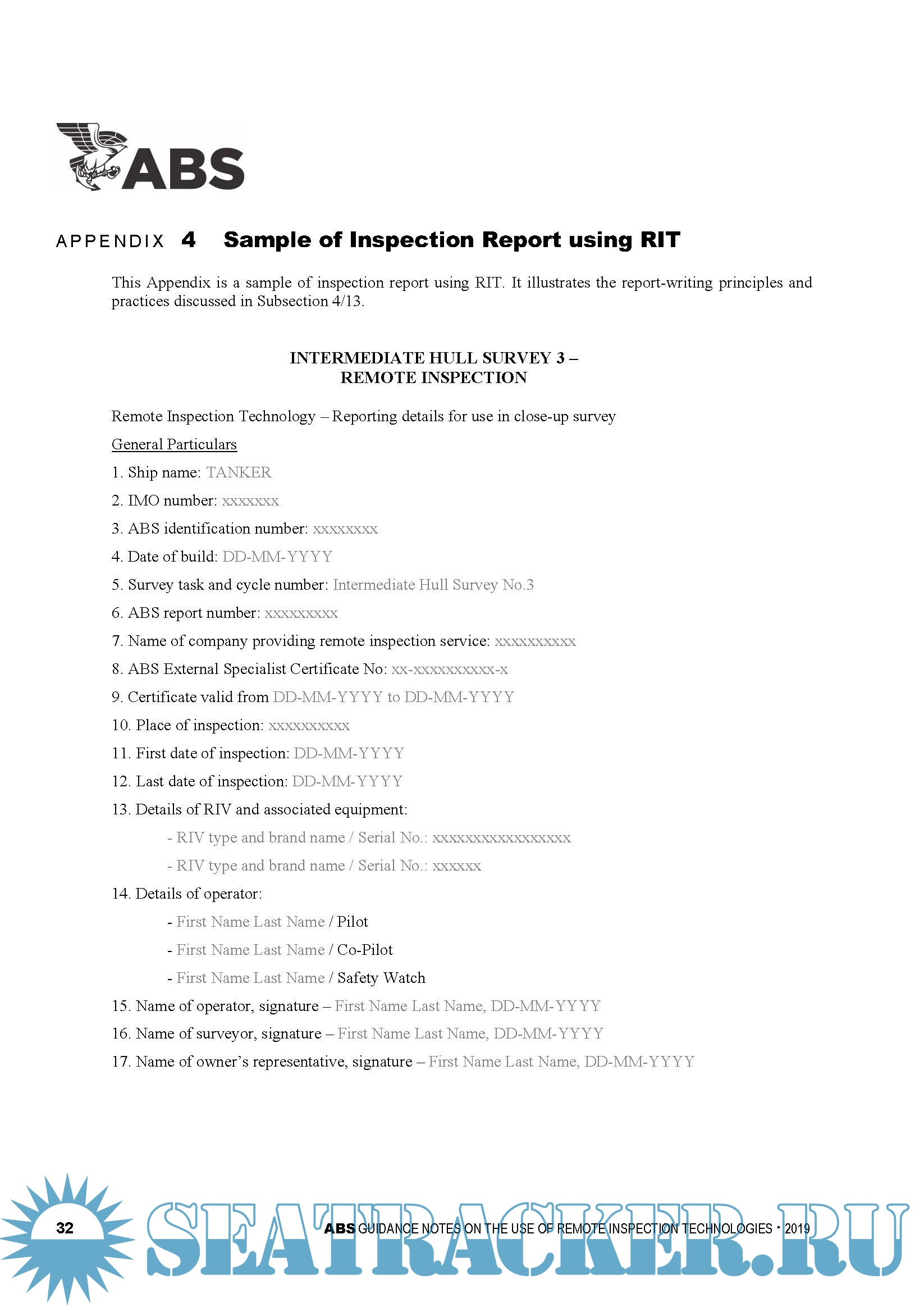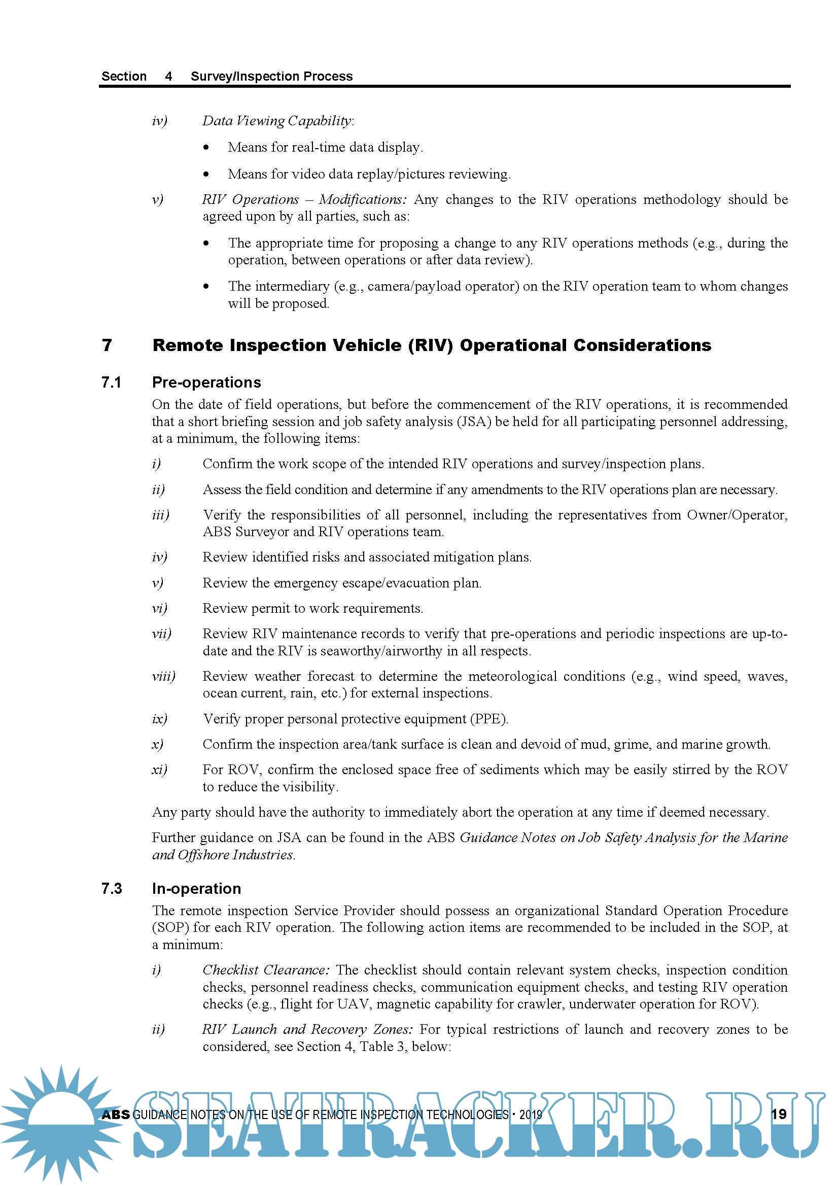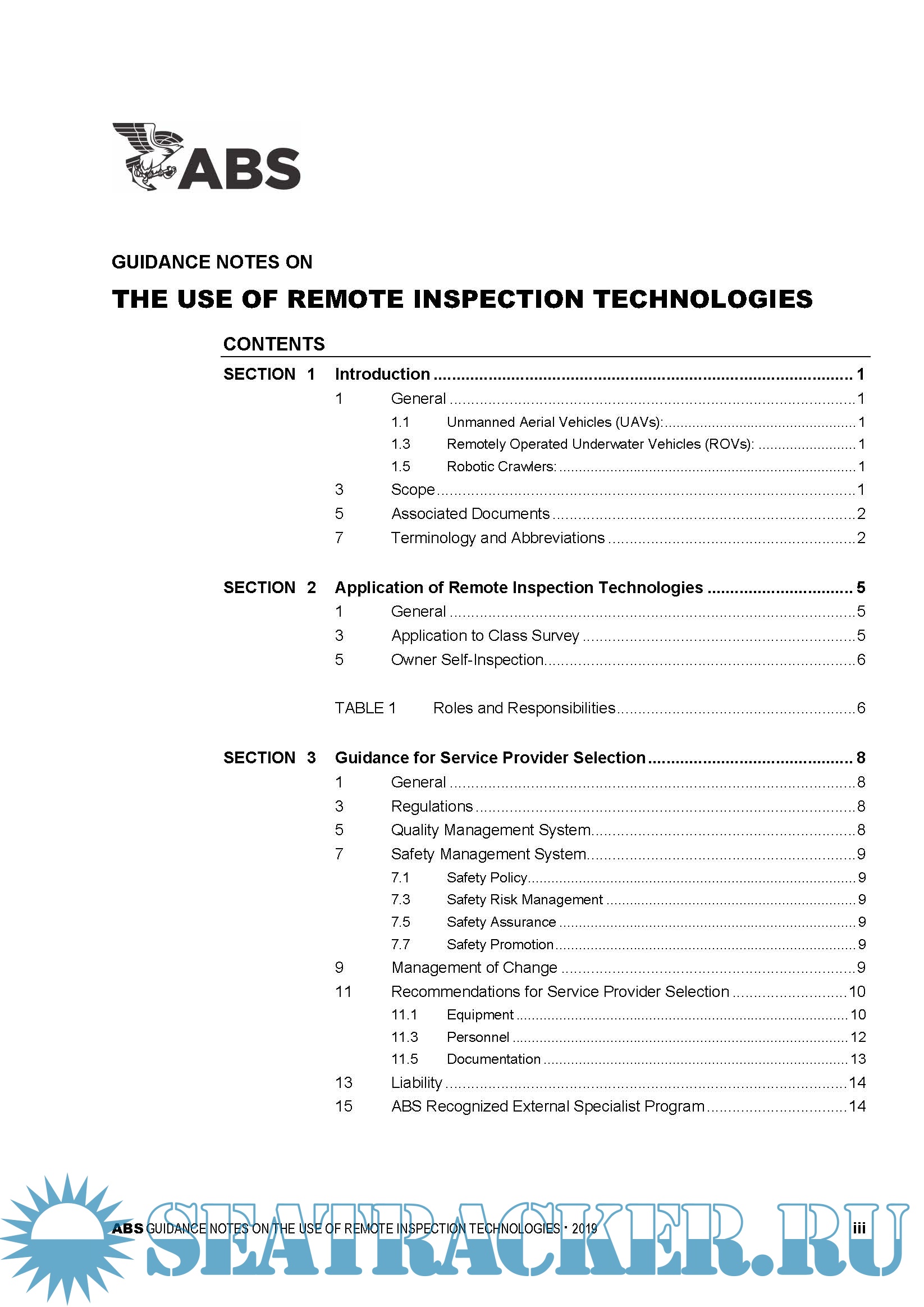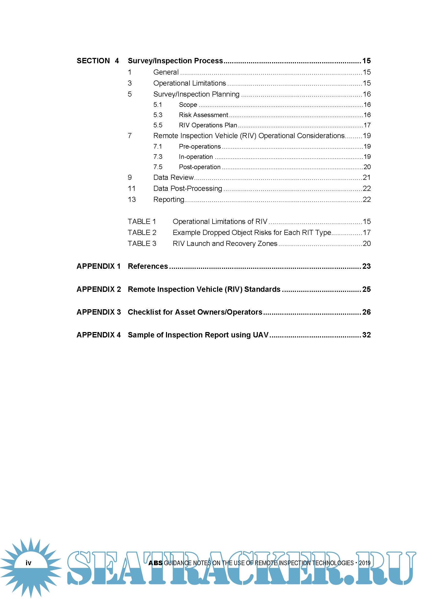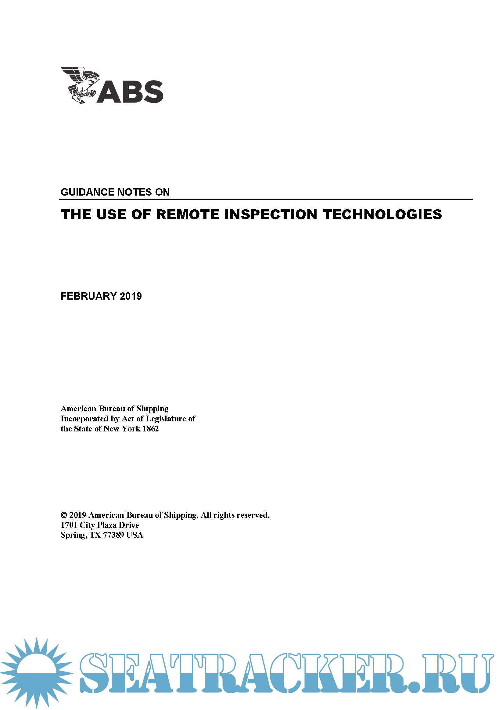 Year: 2019 Language: english Author: ABS Genre: Guide Format: PDF Quality: eBook Pages count: 37 Description: There are several different remote inspection technologies (RITs) which can assist the attending Surveyor in evaluating the condition of the structure. Remote Inspection Technologies (RITs) enable a Remote Inspection Vehicle (RIV) to provide access for the inspection of structures. Some common types of RIV include Unmanned Aerial Vehicles (UAVs), Remotely Operated Underwater Vehicles (ROVs), and Robotic Crawlers. These RITs also provide a benefit to the asset Owner/Operator by reducing operational intrusiveness. These Guidance Notes offer best practices for class surveys and non-class inspections carried out using RITs. These best practices include recommendations and guidance on applications of RITs, qualification and proficiency of the remote inspection Service Providers, Remote Inspection Vehicle (RIV) operation, data handling and data analysis. These best practices are intended to facilitate a safer, more effective and efficient survey.