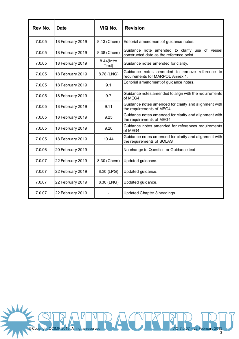 Description: Vessel Inspection Questionnaires for Oil Tankers,Combination Carriers, Shuttle Tankers, Chemical Tankers and Gas Tankers. (VIQ 7). In 1993, OCIMF established a Ship Inspection Report (SIRE) Programme, which enabled OCIMF members to submit their ship inspection reports to OCIMF for distribution to OCIMF members and certain qualifying non-OCIMF members.Participation in the original programme, as either an inspecting OCIMF Member or a programme recipient, was strictly voluntary and each programme recipient determined independently how to evaluate the information contained in the reports received from OCIMF.Under the SIRE Programme, the operator of any ship that is the subject of a report was given a copy of that report and the opportunity to submit written comments relating to the report, to both the inspecting OCIMF Member and to OCIMF.Report recipients accessed the SIRE System Index by computer and this permitted the index to be viewed or downloaded. Programme recipients could order reports and any matching operator comments from the SIRE system. Reports and comments were transmitted by facsimile to the programme recipients' pre-registered facsimile numbers on request.