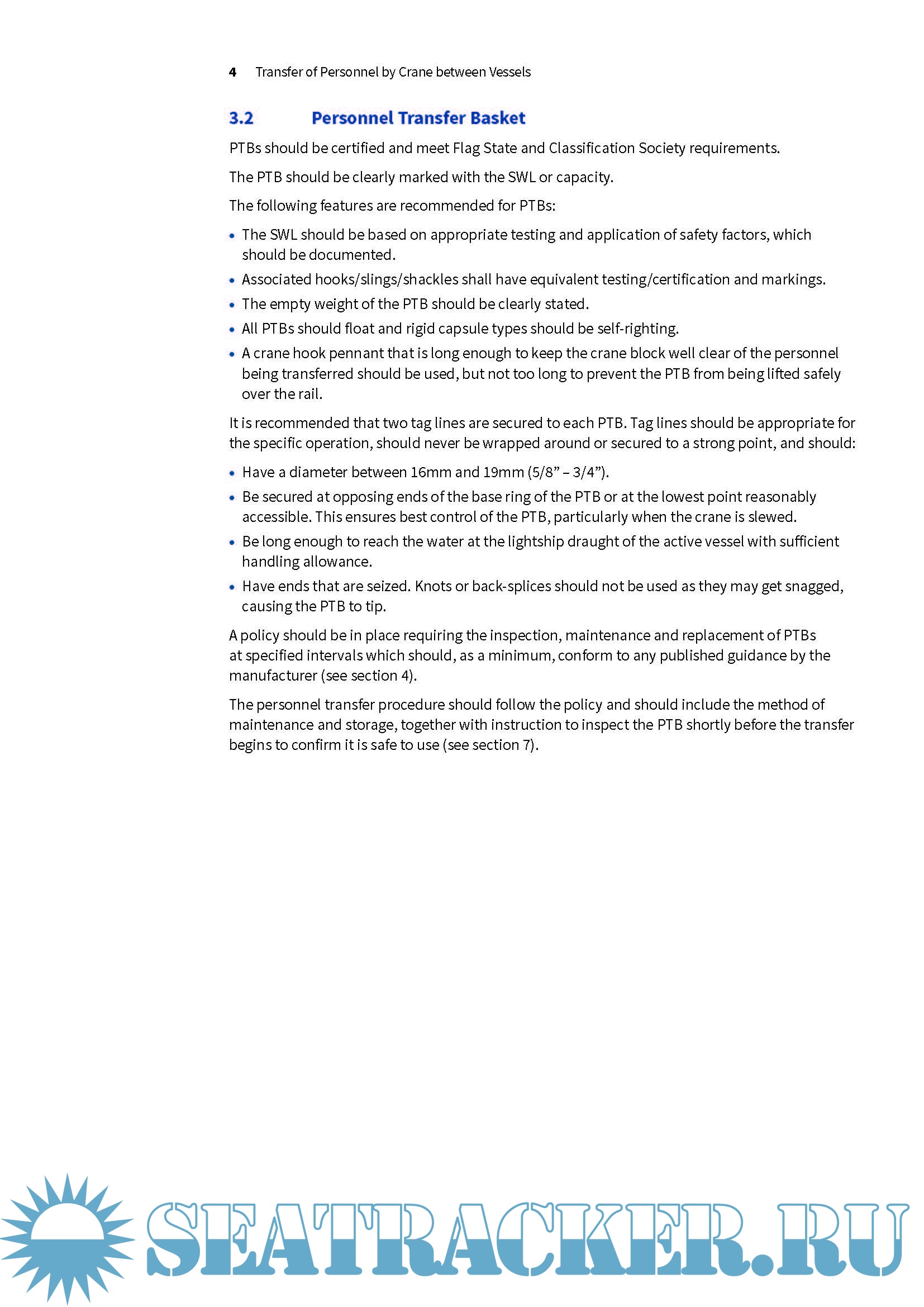 Year: 2018 Language: english Author: Oil Companies International Marine Forum Genre: Guide Publisher: OCIMF Edition: 1st Format: PDF Quality: eBook Pages count: 39 Description: This information paper is intended to help vessel operators and owners, Masters, officers, Marine Superintendents and Mooring Masters evaluate the risks associated with the transfer of personnel by a vessel’s onboard crane. The paper contains recommendations on equipment and good operating practices that will enhance the overall safety of personnel transfer operations. It is not a set of rules and if more stringent international, national or local regulations apply they must always take precedence. The use of an onboard crane for the transfer of personnel has inherent risks. This paper highlights those risks and provides guidance that should be used in the risk assessment process to determine the method of transfer. Cranes can be used to transfer personnel between two vessels of similar size, e.g. Ship to Ship (STS) transfers, but also between vessels of different sizes, e.g. between a large tanker and a smaller vessel. Crane transfers are typically completed using a Personnel Transfer Basket (PTB). In this paper, the term PTB is used to describe the piece of equipment in which personnel are transferred and includes collapsible basket and rigid capsule types.