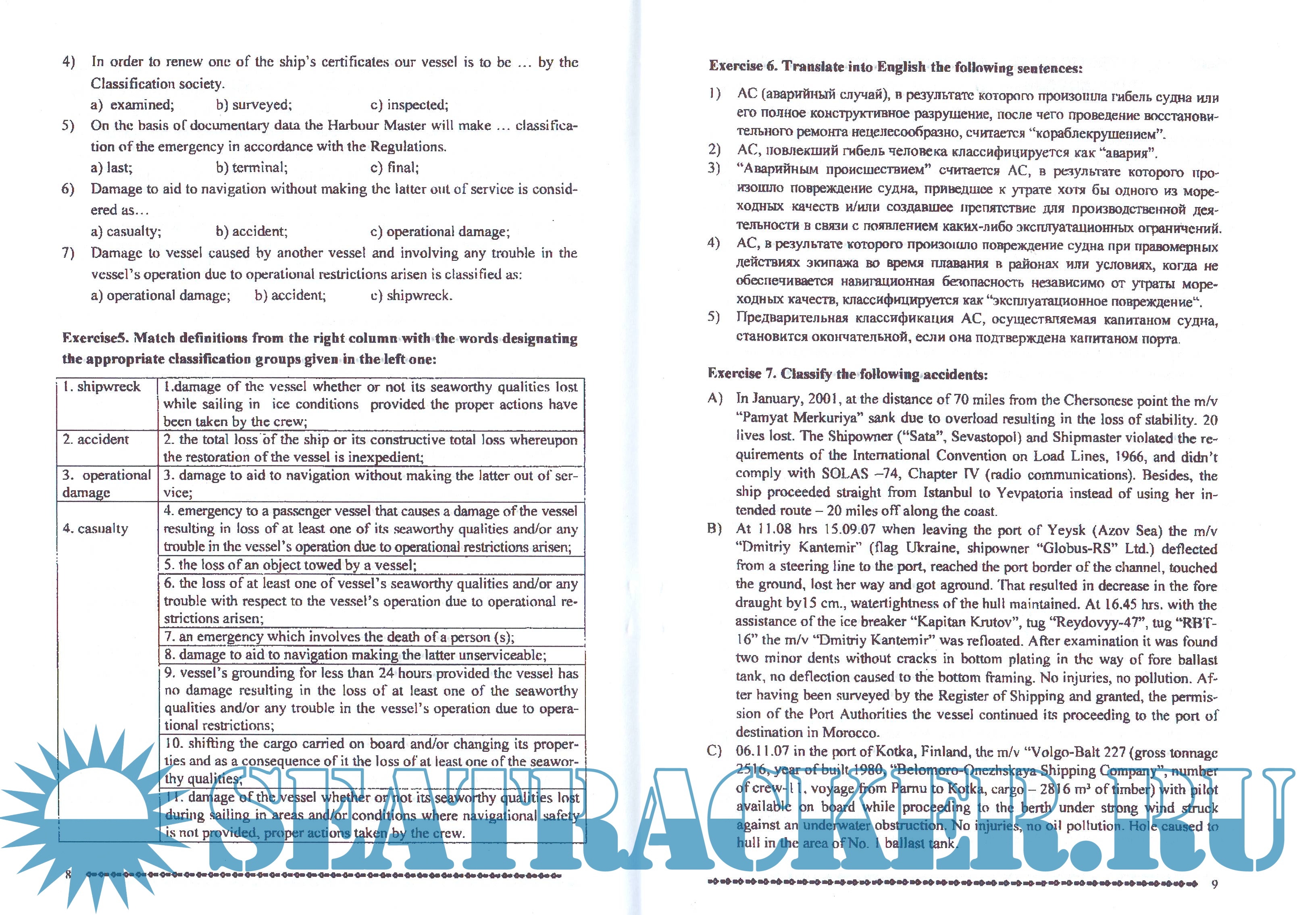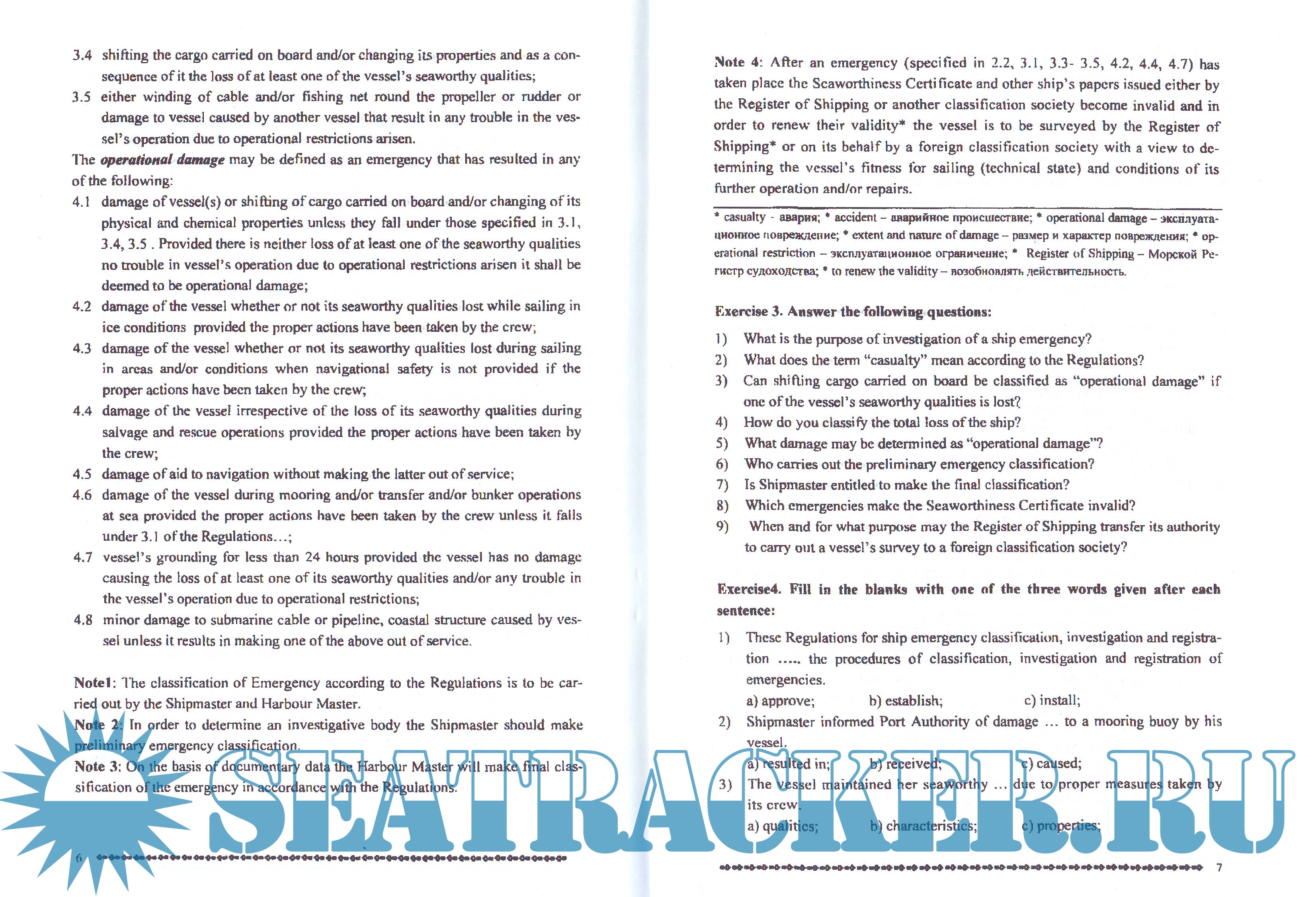 Год выпуска: 2007 Язык: Русский, Английский Автор: Л. Ходус Жанр: Учебное пособие Издательство: Редакционно-издательский отдел ФГБОУ ВПО "ГМУ им. адм. Ф.Ф.Ушакова" Формат: PDF Качество: Отсканированные страницы Количество страниц: 29 Описание: Учебное пособие предназначено для формирования речевых умений и навыков активного использования языкового материала в типичных ситуациях профессиональной деятельности. Пособие состоит из пяти частей: Часть I - классификация аварийных случаев в соответствии с Положением о порядке классификации, расследования и учета аварийных случаев с судами (ПРАС-90); Часть II - Органы расследования и порядок донесения; Часть III - Порядок расследования аварийных случаев с российскими и иностранными судами; Часть IV - Перечень, передаваемых судовладельцу/министерству сведений по аварийному случаю; Часть V - Рекомендованные формы согласно Инструкциям по применению положения о порядке классификации, расследования и учета аварийных случаев с судами (ИПРАС-92). Пособие предназначено для студентов старших курсов факультетов морского права и судовождения, владеющих основами нормативной грамматики и имеющих запас общеупотребительной лексики.