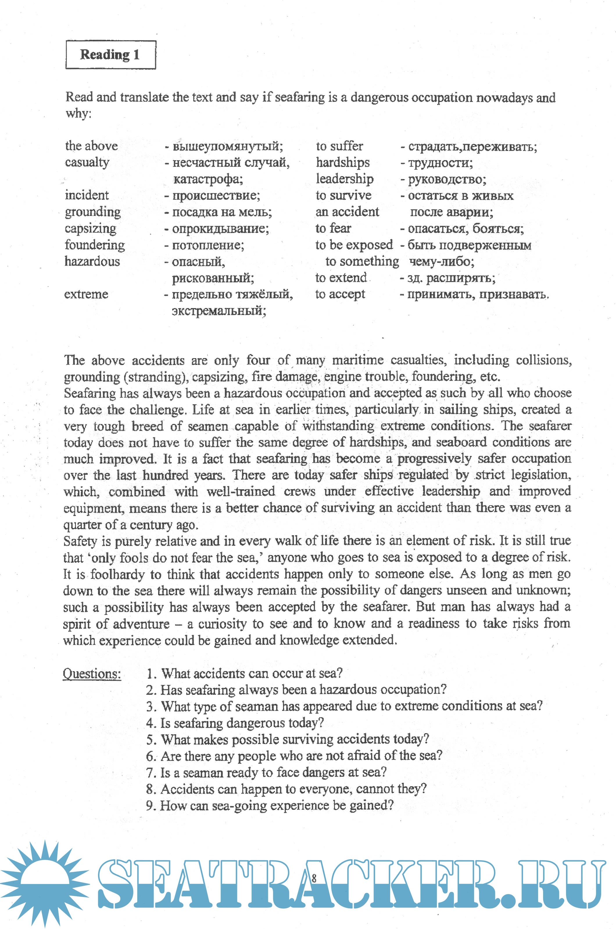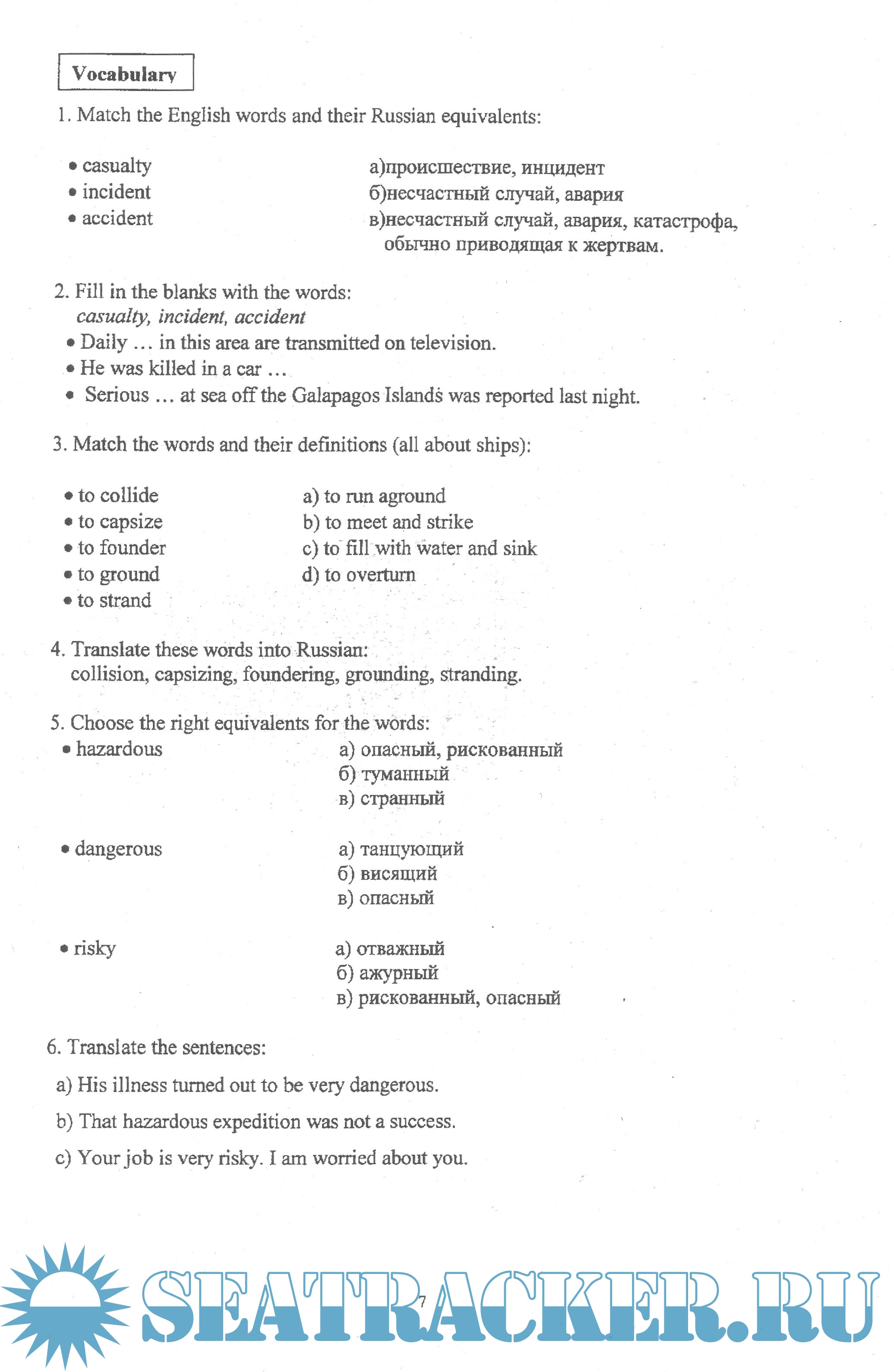 Год выпуска: 2003 Язык: Русский, Английский Автор: Е.Ю.Ульянова, И.Д.Минаева Жанр: Учебное пособие Издательство: ГМА им. адм. С.О.Макарова Формат: PDF Качество: Отсканированные страницы Количество страниц: 80 Описание: Предлагаемое учебное пособие, составленное в соответствии с утвержденной Министерством транспорта РФ программой по дисциплине английский язык специальности "Судовождение", знакомит курсантов с индивидуальными и коллективными средствами спасения, их описанием и использованием в аварийной ситуации, а также учит рассказывать о них и давать инструкции по их применению. При создании пособия были использованы аутентичные материалы. Пособие, составленное по тематическому принципу, имеет четыре раздела, каждый из которых включает подразделы: - Warming-up - упражнения для предварительной беседы на тему, рассматриваемую в этом разделе (за исключением раздела 4); - Reading - текст для чтения и последующего обсуждения; -Vocabulary & Practice - лексические и речевые упражнения для активизации лексики; -Talking point - упражнения для закрепления речевых навыков. В разд. 2 имеется подраздел Writing, предназначенный для выработки практических навыков письменной речи. Грамматические упражнения в пособии не предусмотрены, поскольку его содержание построено на пройденном материале 1-го курса. В случае возникновения сложностей при выполнении грамматических, лексических и речевых упражнений по усмотрению преподавателя могут быть использованы специальные тренировочные упражнения, позволяющие легко усвоить материал. В конце пособия помещен англо-русский словарь незнакомых слов.