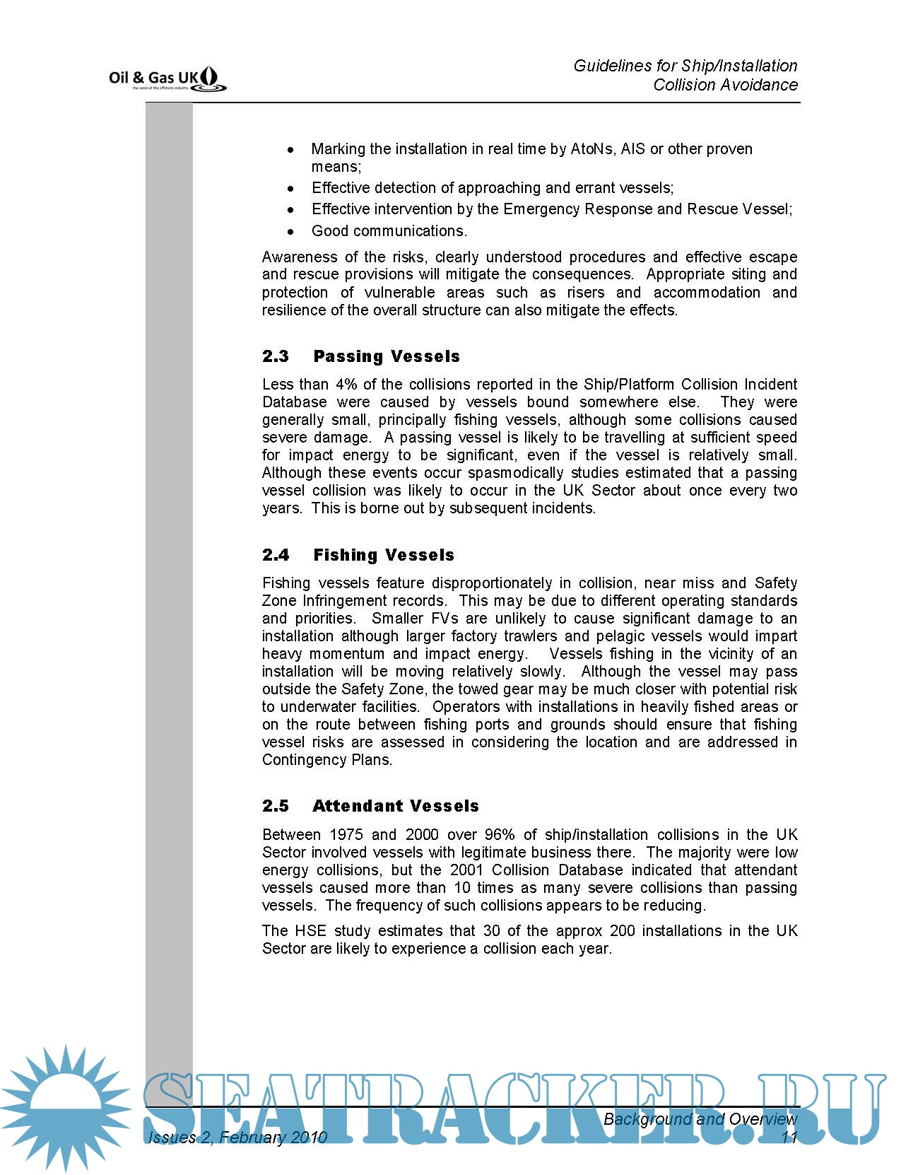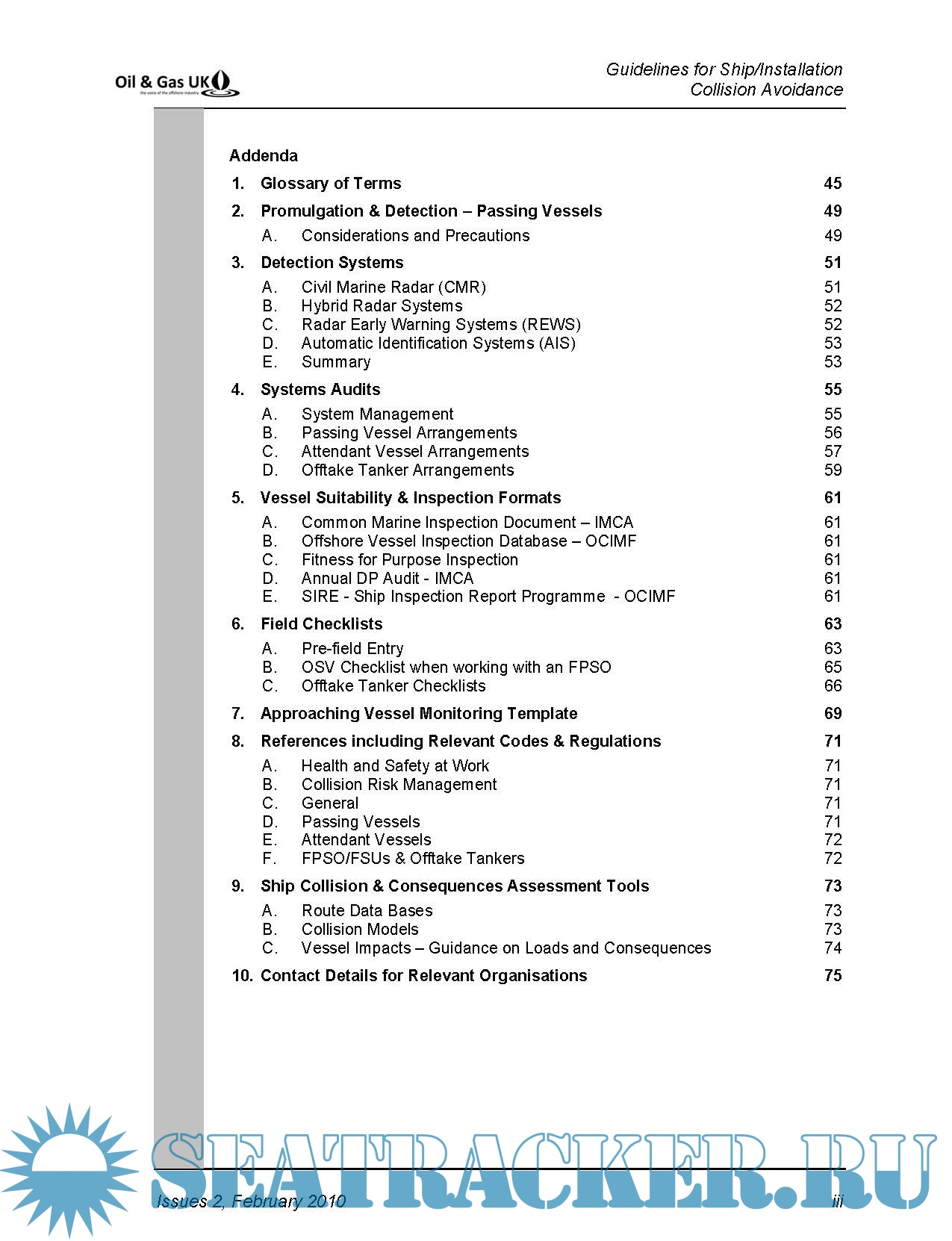 Year: 2010 Language: english Author: Oil & Gas UK Genre: Guide Publisher: Oil & Gas UK ISBN: 1 903 003 62 8 Format: PDF Quality: eBook Pages count: 83 Description: This document focuses on the reducing the risk of ship-installation collisions. Consequences are only considered insofar as they dictate timely appropriate response to imminent or actual impact. It gives guidance on good practice and suggests benchmarks against which to assess compliance. ALARP principles apply. Although procedures and equipment are suggested it is recognised that suitable alternatives for the situation of a particular field or installation may be acceptable. The document emphasises that equipment to achieve effective collision avoidance is safety critical and should be maintained as such. For the purposes of this document various vessel types are considered separately: passing vessels - those on route to somewhere else; attendant vessels - that is vessels with legitimate business at the installation; offtake tankers - a subset of attendant vessels, which interact with the installation in a specialised way and are therefore addressed in a dedicated section. Recommendations made in this guidance rely principally on checklists covering management systems, vessel suitability, self-audit and pre-operational checks – a form of risk assessment. They draw, wherever possible, on existing proven industry standards. The guidance is aimed principally at operations in the UK Sector, and hence refers to UK legislation, practices and organisations. Other administrations and national associations may wish to use its principles in their own Sectors.