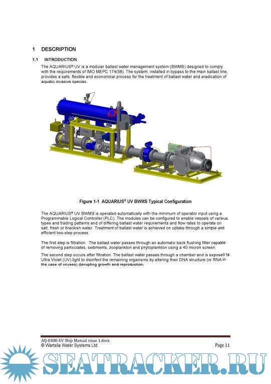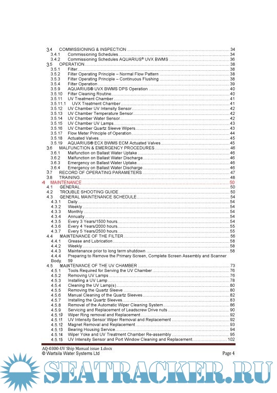 Year: 2016 Language: english Author: Wartsila Water Systems Ltd Genre: Manual Publisher: Wartsila Water Systems Ltd Format: PDF Quality: eBook Pages count: 327 Description: The AQUARIUS UV ia a modular ballast water management system (BWMS) designed to comply with the requirements of IMO MEPC174(58). The system, installed in bypass to the main ballast line, provides a safe and economical process for the treatment of ballast water and eradication of aquatic invasive species.