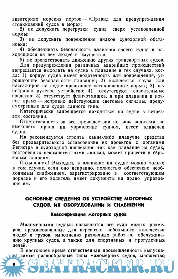 с необходимыми сведениями из общей лоции рек, со знаками судоходной обстановки на реках, каналах, водохранилищах и озерах. В пособии рассмотрены основные положения «Правил плавания по внутренним судоходным путям РСФСР» и «Правил для предупреждения столкновений судов в море», изложены советы по управлению маломерными моторными судами.