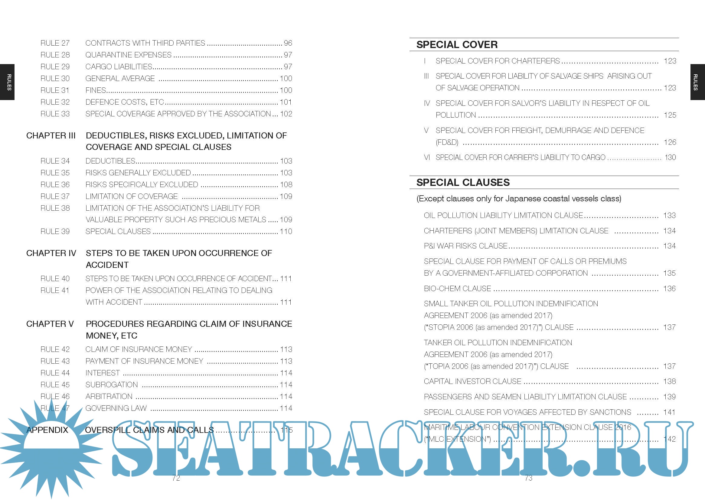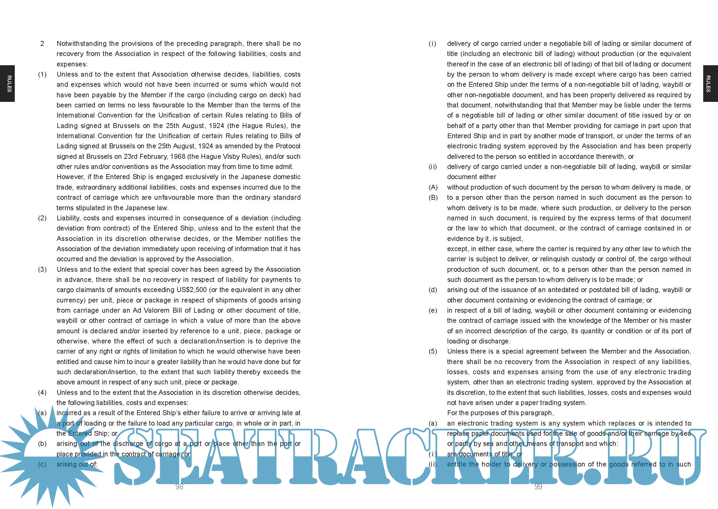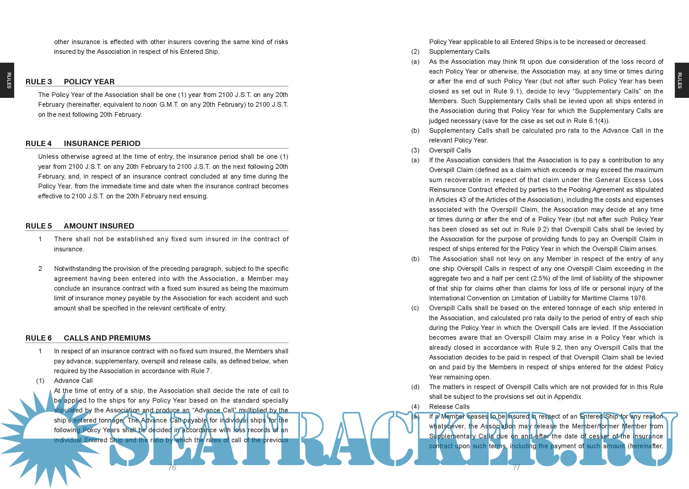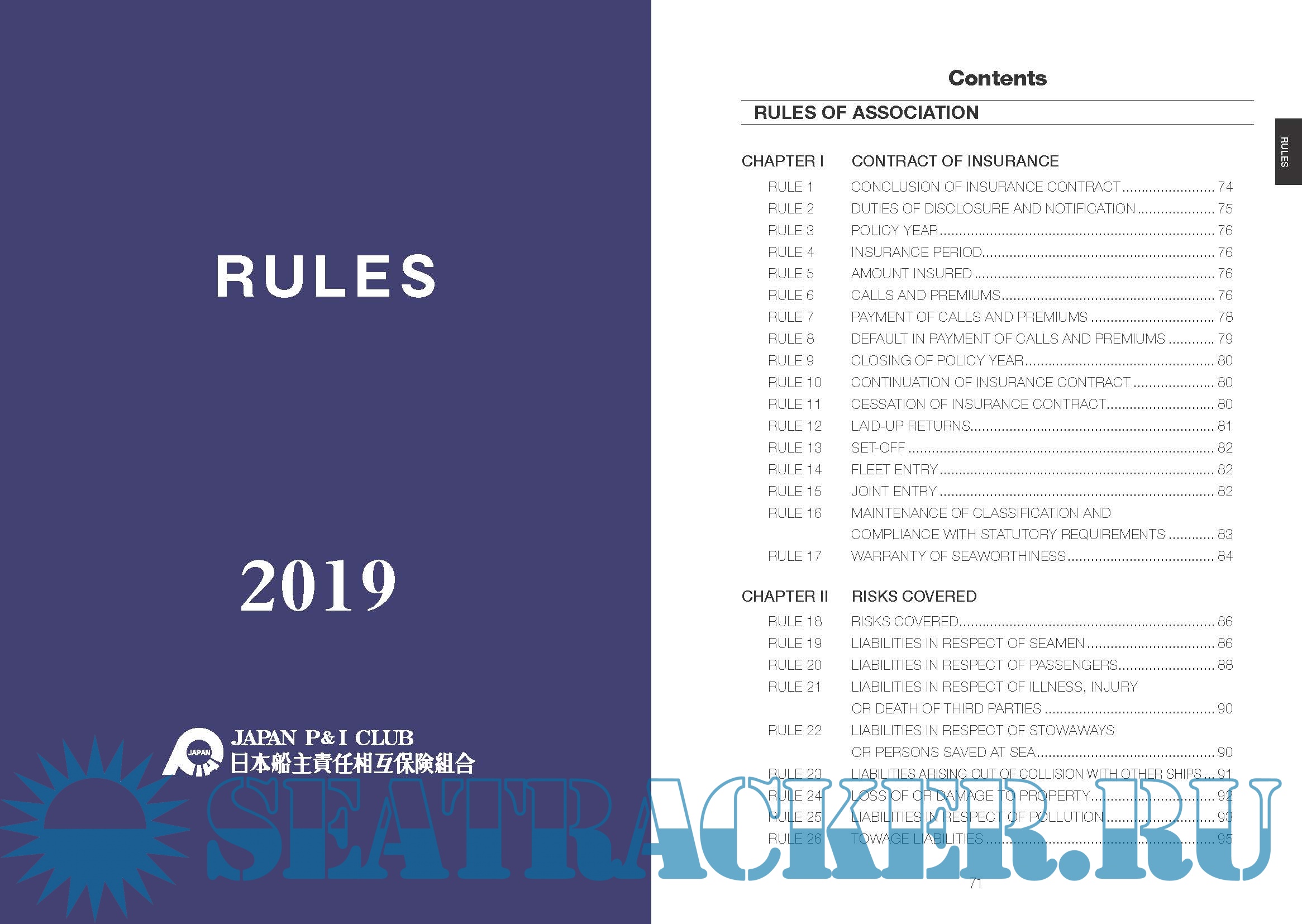 Year: 2019 Language: english Author: Japan P & I Genre: Convention (rules) Format: PDF Quality: eBook Pages count: 38 Description: Any person desiring to insure his ship shall submit to the Association an application form (hereinafter including an “Application for Membership” which is to be submitted to the Association by a person becoming a Member) with his signature or seal affixed stating the ship which is a subject matter of insurance (hereinafter, meaning the ships defined as non-wooden steam or motor ships or other ships in “the Ship Law” or other laws and which are recognised as the ships by the Association, referred to as an “Entered Ship”) and other items specified therein. If and when the Association approved the application, the person shall pay a part or whole of calls or premiums.