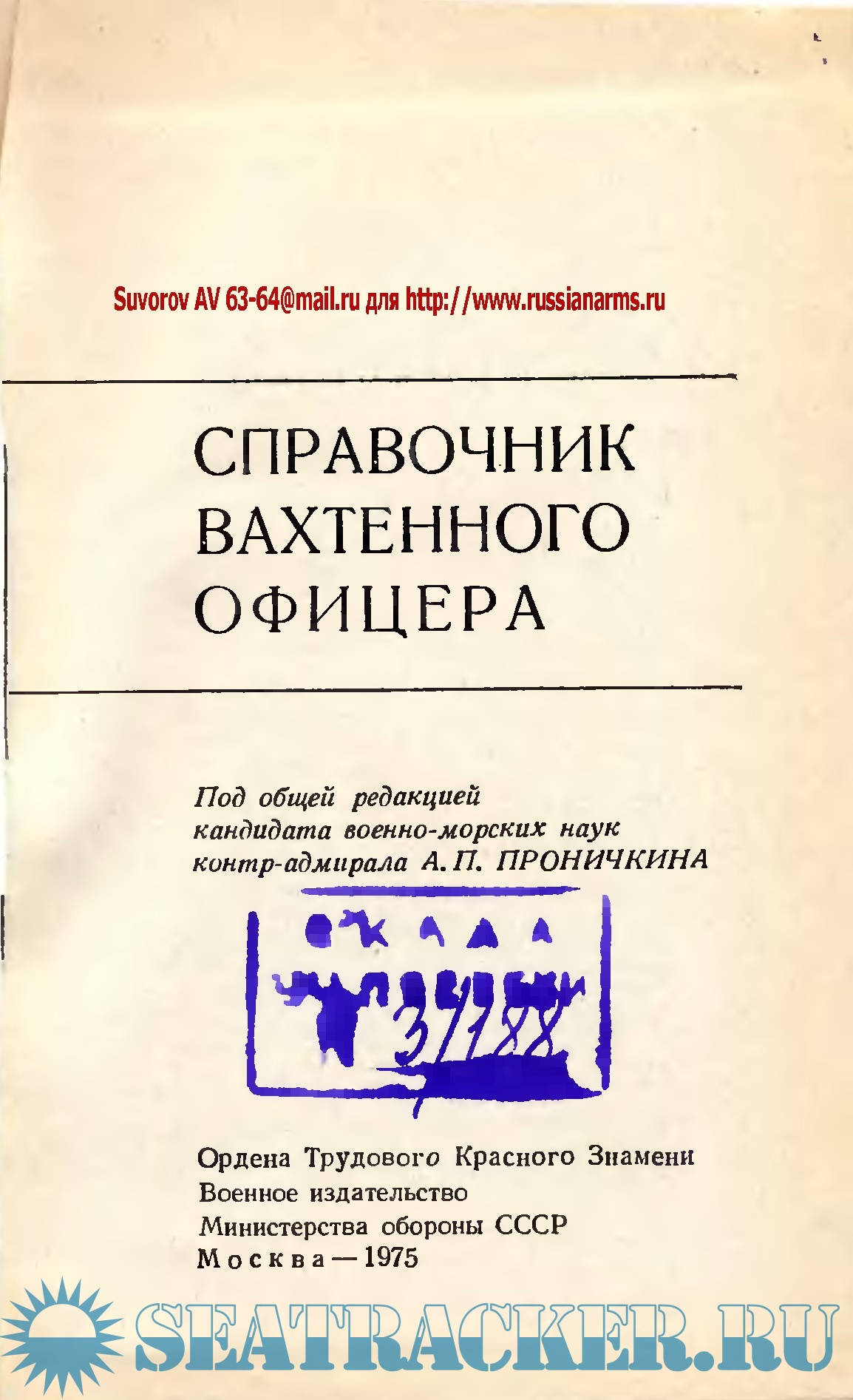 Год выпуска: 1975 Язык: русский Автор: А.П. Проничкин Жанр: Учебное пособие Издательство: Воениздат Формат: DjVu Качество: Отсканированные страницы Количество страниц: 229(423) Описание: Вахтенный офицер управляет корабельной вахтенной службой. Личный состав корабля, кроме лиц, которым вахтенный офицер подчинен, обязан исполнять все требования вахтенного офицера. К исполнению обязанностей вахтенного офицера на ходу и на якоре привлекаются лица, допущенные приказом командира корабля после проверки их знаний в соответствии с требованиями специальной программы. Вахтенный офицер должен иметь бинокль, свисток, мегафон. Кроме того, у него должны быть записная книжка и карандаш. По тревогам вахтенный офицер передает свои обязанности старшему помощнику командира корабля и занимает место согласно расписанию.
