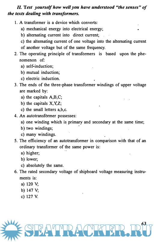 PREFACE UNIT 1. NATURE OF ELECTRICITY 1. PRIMARY INVESТIGATIONS. CLASSES OF ELECTRICITY 2. MAGNETISM. ELECTROMAGNETISM. MAGNETIC FIELD 3. ELECTRIC CURRENTS AND THEIR PROPERTIES 4. BASIC UNIТS OF ELECTRICITY AND MEASURING DEVICES EXERCISES UNIT 2. SHIP'S DIRECT CURRENT ELECTRIC МACHINES 1. ТНЕ CONSTRUCTION AND ТНЕ PRINCIPLE OF OPERATION 2. D.C. GENERATORS AND THEIR CHARACTERISTICS 3. APPLICATION OF D.C. GENERATORS AND THEIR PARALLEL OPERATION EXERCISES UNIT 3. D.C. MOTORS 1. CONVERTIBILITY 2. E.M.F., TORQUE, POWER 3. STARTING, SPEED REGULATION. REVERSAL EXERCISES UNIT 4. ТУРЕS OF D.C. MOTORS AND THEIR DISПNCТIVE FEAТURES 1. SHUNT-WOUND MOTORS 2. SERIES-WOUND MOTORS 3. COMPOUND-WOUND MOTORS EXERCISES UNIT 5. TRANSFORMERS 1. PURPOSE, CONSTRUCTION, TYPES 2. THREE-PHASE TRANSFORMERS 3. SPECIAL TRANSFORMERS 4. AUTOTRANSFORMERS EXERCISES