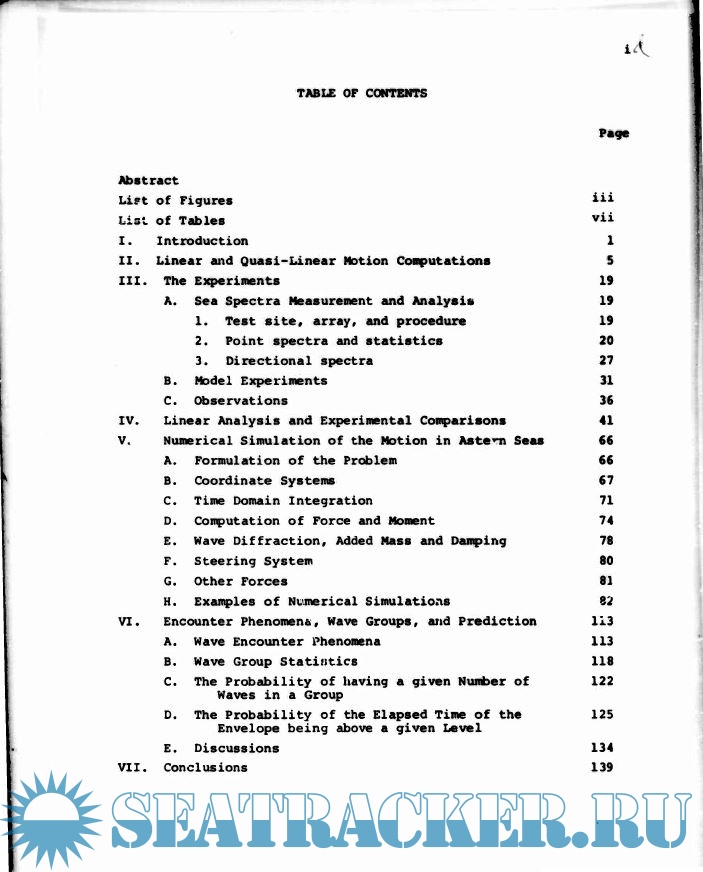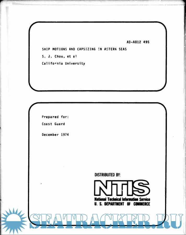 Year: 1974 Language: english Author: S. J. Chou, et al Genre: Research papers Format: PDF Quality: Scanned pages Pages count: 342 Description: An analytical and experimental study of ship motions and capsizing in extreme seas has been deducted. The analysis of linear and quasi-linear one-dimensional roll models has revealed motion anomalies not apparent from the usual linearized ship motion theory. Extensive tests have been conducted using two radio-controlled models in the wind generated seas of San Francisco Bay. Directional spectra were computed, using r. variety of techniques, from the wave measurements by an array of wave gages. Comparisons of the experimentally determined motions and a linear strip theoty prediction are presented. A time domain numerical simulation program for motions and capsizing has been used to investigate motions in a variety of wave group configurations. The results show good agreement with observed capsizing phenomena and have revealed a number of important characteristics associated with large geometry changes in waves.
