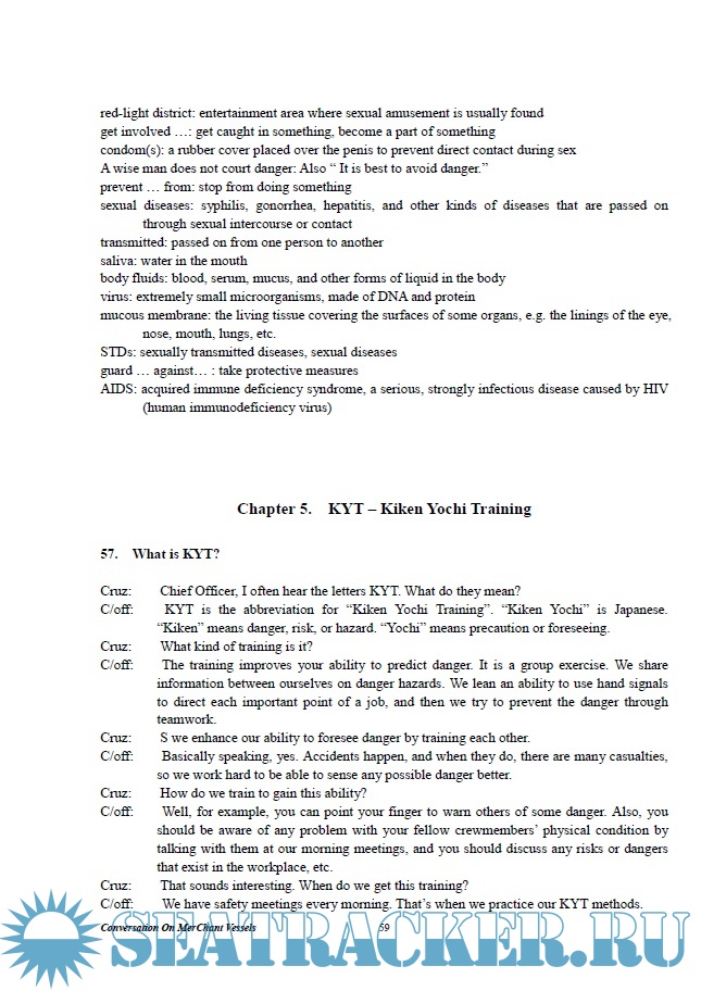 is selected for the purpose of familiarizing seamen with the realities of their life, while learning English, which is the universal language of navigation. By practicing the conversations, notes and keywords, you can experience, first hand, realistic developments that occur on board merchant vessels. The conversations also include some practical advise on seamen’s life, actual navigational operations, realistic descriptions of ship-bound equipment and navigation techniques.