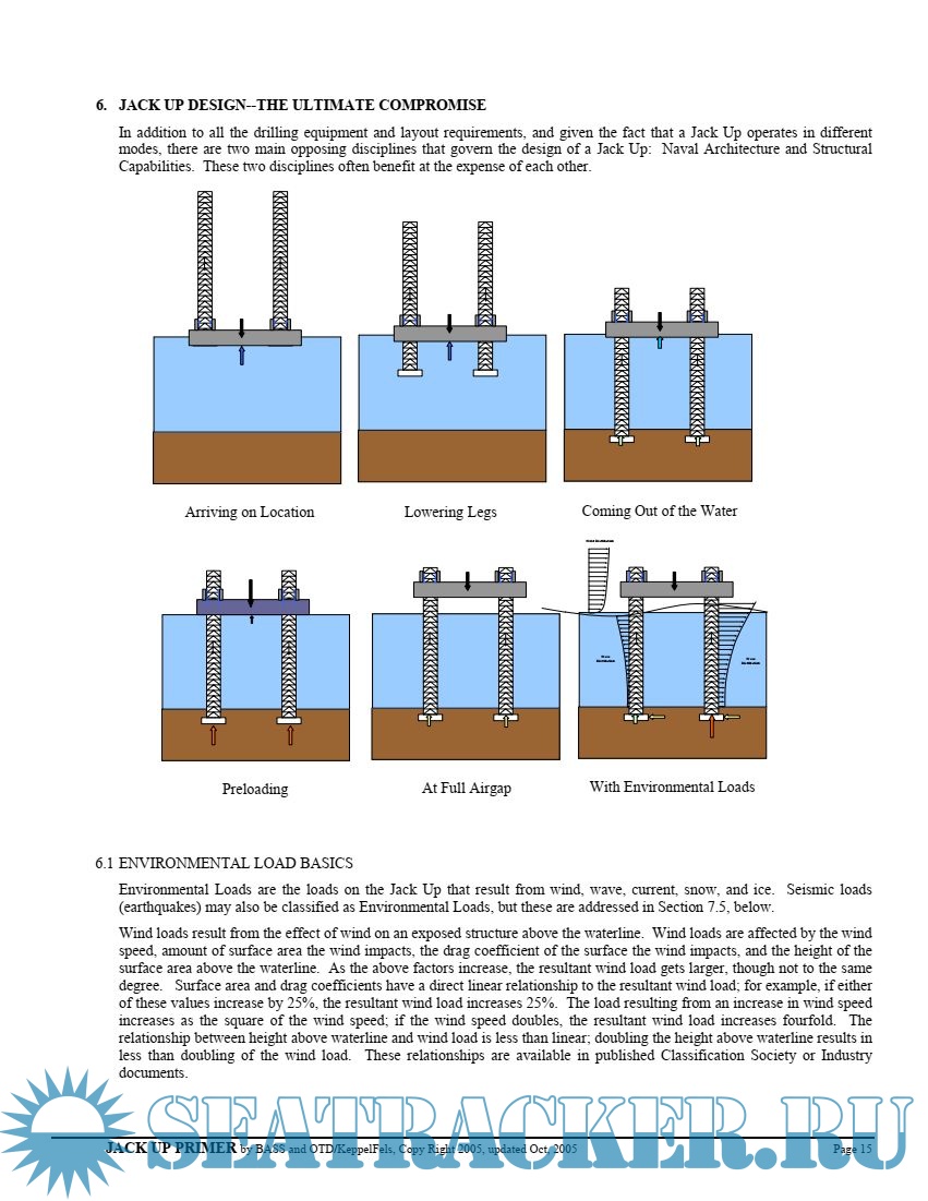 Year: 2005 Language: english Author: J.Vazquez, R.Michel Publisher: Keppel FELS and Keppel Offshore and Marine Format: PDF Quality: eBook Pages count: 24 Description: Jack Up Units are complex structures used offshore in many modes of operation. When using a particular Unit at a givensite, it is important to be aware and understand the basics behind the different designs under different conditions. The focusof this primer is a simplified discussion of the various sensitivities of Jack Ups while in the different modes of operation. Itis hoped that by increasing the understanding of how Jack Ups work and behave as well as the sources of the loads actingon them, those making decisions with limited information willbe better equipped to respond toincidents and reduce theiroccurrence and/or consequences. Though there are many variations in design and purposes for Jack Ups, this primerfocuses many of these discussions on three-legged Units used for drilling. The primer starts by presenting somebackground and discussions of the basics of Jack Up components analyses. This is followed by sections on Jack Up Components and Configurations, modes ofoperation, differences between Classapproval and site specific assessment, basic analysis, and a discussion of competing aspects of Jack Up design.