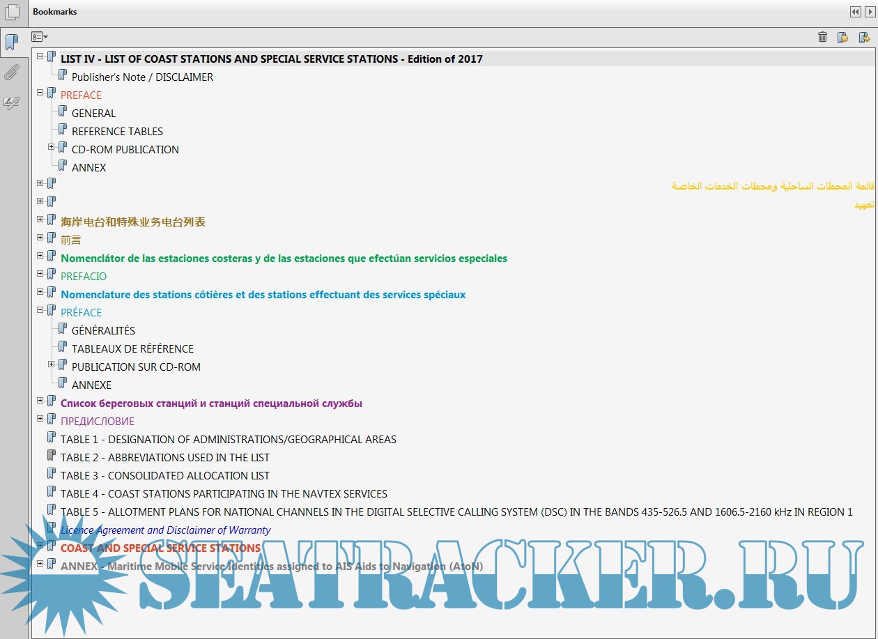 Year: 2017 Language: multilingual Author: ITU Publisher: ITU Format: PDF+CD Quality: eBook Pages count: 500 Description: List IV contains important information for the mariner in relation to radiocommunications, including the GMDSS (Global Maritime Distress and Safety System). Detailed information such as the frequencies for transmitting and receiving, in addition to geographical coordinates, is provided for maritime coast radio stations, including those assuming watch-keeping using digital selective calling (DSC) techniques and radiotelephony. List IV also supplies details of additional services such as medical advice, navigational and meteorological warnings, MSI (Maritime Safety Information), AIS (Automatic Identification System), meteorological bulletins and radio time signals, along with the hours of service and operational frequencies, information on port stations, pilot stations, coast Earth stations, VTS stations, contact information of RCC (Rescue Coordination Centers), SAR agencies, Navarea coordinators and AtoNs (AIS Aids to Navigation). As stipulated in Appendix 16 to the RR, this List shall be provided to all ship stations for which a Global Maritime Distress and Safety System (GMDSS) installation is required by international agreement.