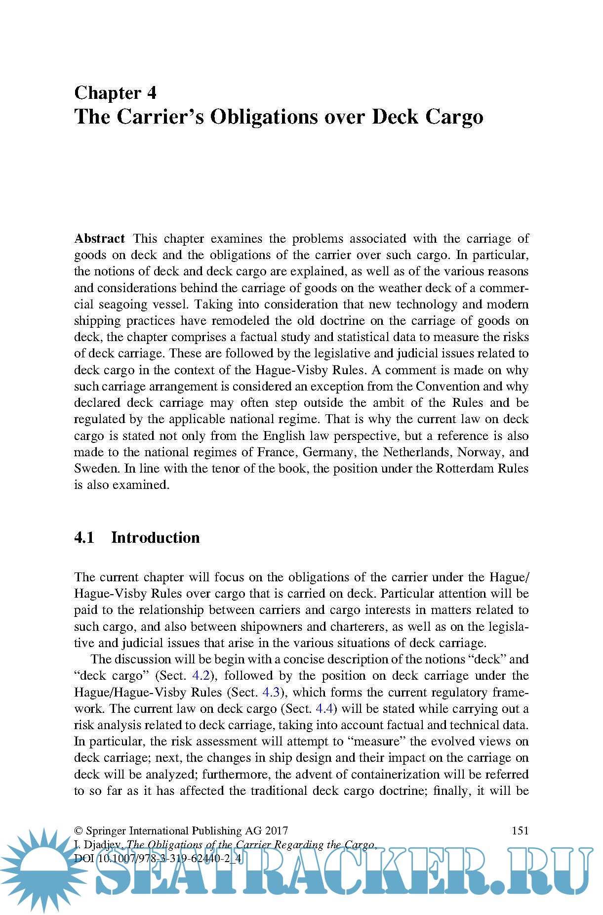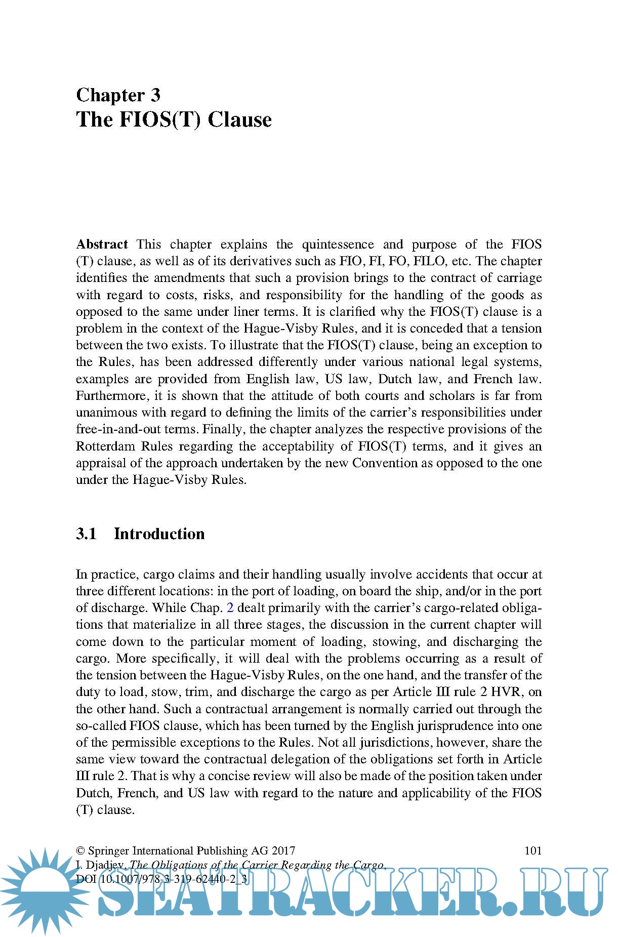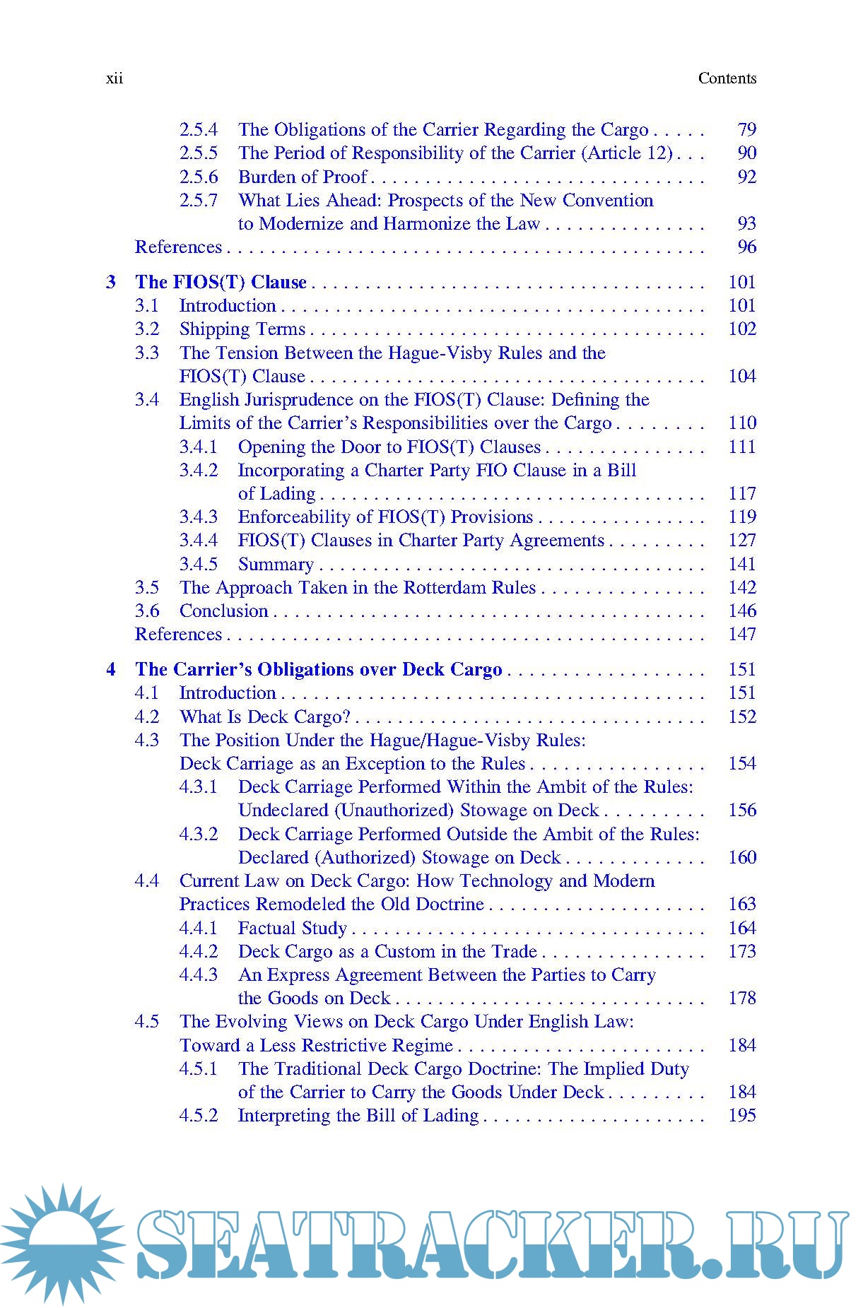 Year: 2017 Language: english Author: Ilian Djadjev Genre: Handbook Publisher: Springer ISBN: 978-3319624402 Format: PDF Quality: eBook Pages count: 343 Description: This book addresses the legal and contractual obligations of sea carriers regarding due care for the cargo under a contract of carriage. While the general framework employed is the leading international liability regime, the Hague-Visby Rules, the discussions in each chapter also account for the possible future adoption of a new regime, the Rotterdam Rules. The subject matter concerns the standard for the duty of care for goods as codified in the Hague-Visby Rules, but the work also touches upon a wide range of related topics found both in law and in practice, providing valuable commercial, technical and historical links as well as various solutions that have been found at the national and international level to address challenges arising in this specialised area of law. The book is divided into six chapters, which gradually reveal the complexity of the topic. Chapter 1 provides a thorough introduction to the two main transport documents in use, and to the basic logic behind shipping, sea-going trade and related national and international legislation. In turn, Chapter 2 presents an overview of the relevant provisions of the Hague-Visby Rules. Chapters 3, 4 and 5 examine the problems arising out of the insertion of a FIOS(T) clause in the contract of carriage; the carriage of goods on deck; and the carriage of goods in containers, respectively. Lastly, Chapter 6 provides an overall conclusion on the legal status quo and current practice, as well as future prospects. The book was written with a number of potential readers in mind and is intended to open up the topic to a broader audience. It is suitable both for readers who wish to advance their learning (e.g. professionals, practitioners and postgraduates) and for readers with little or no prior knowledge of the topic (e.g. students and researchers).